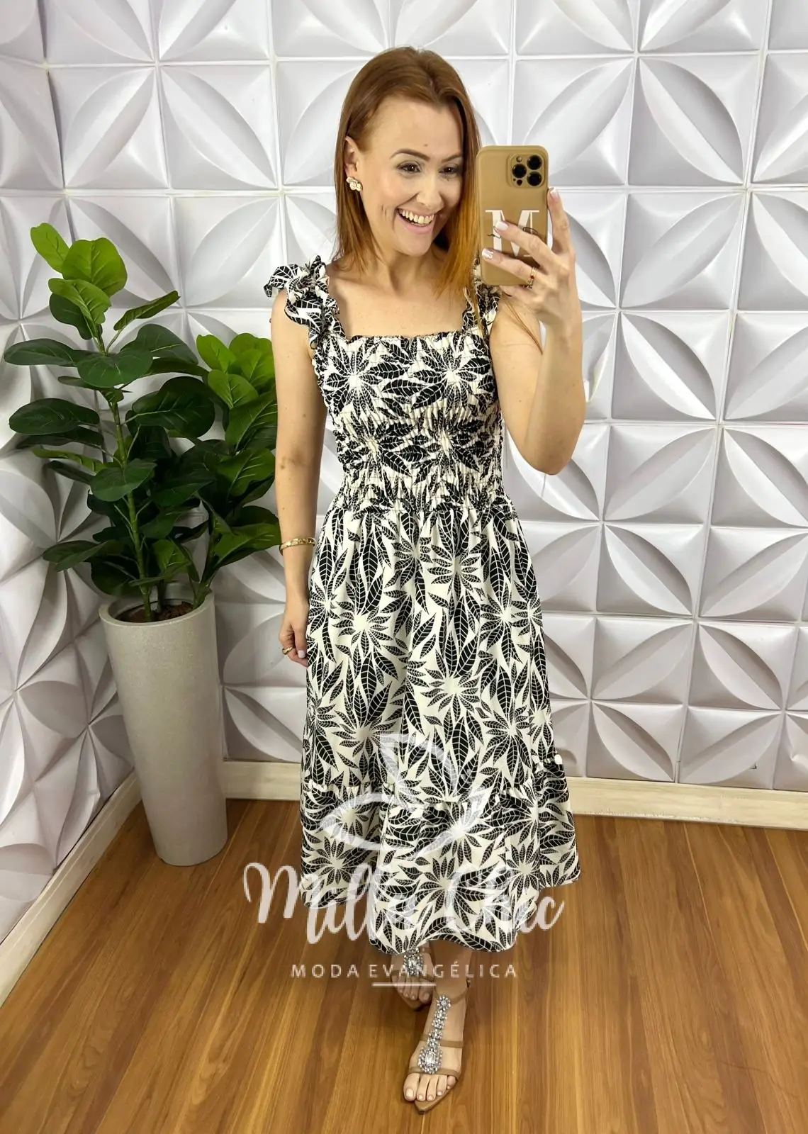 Vestido Crepinho Corpo De Lastex Mídi Evase Mila – Branco e Preto (folhadas)
