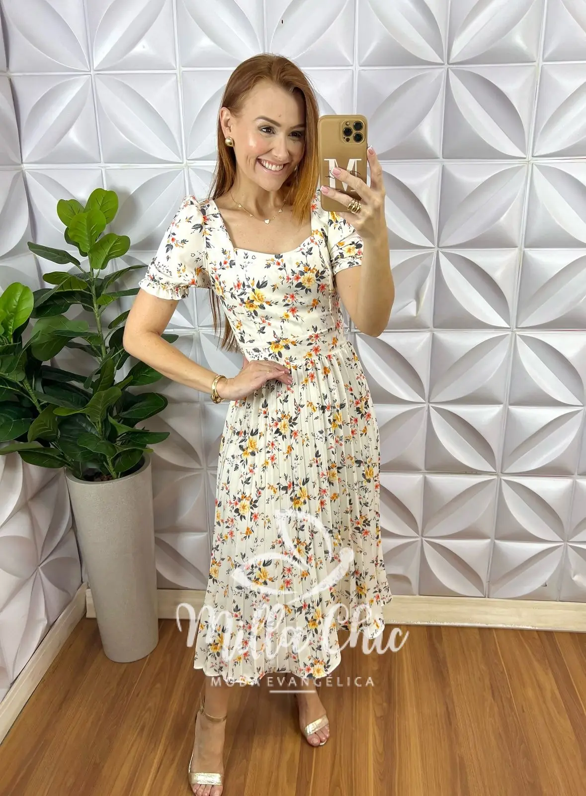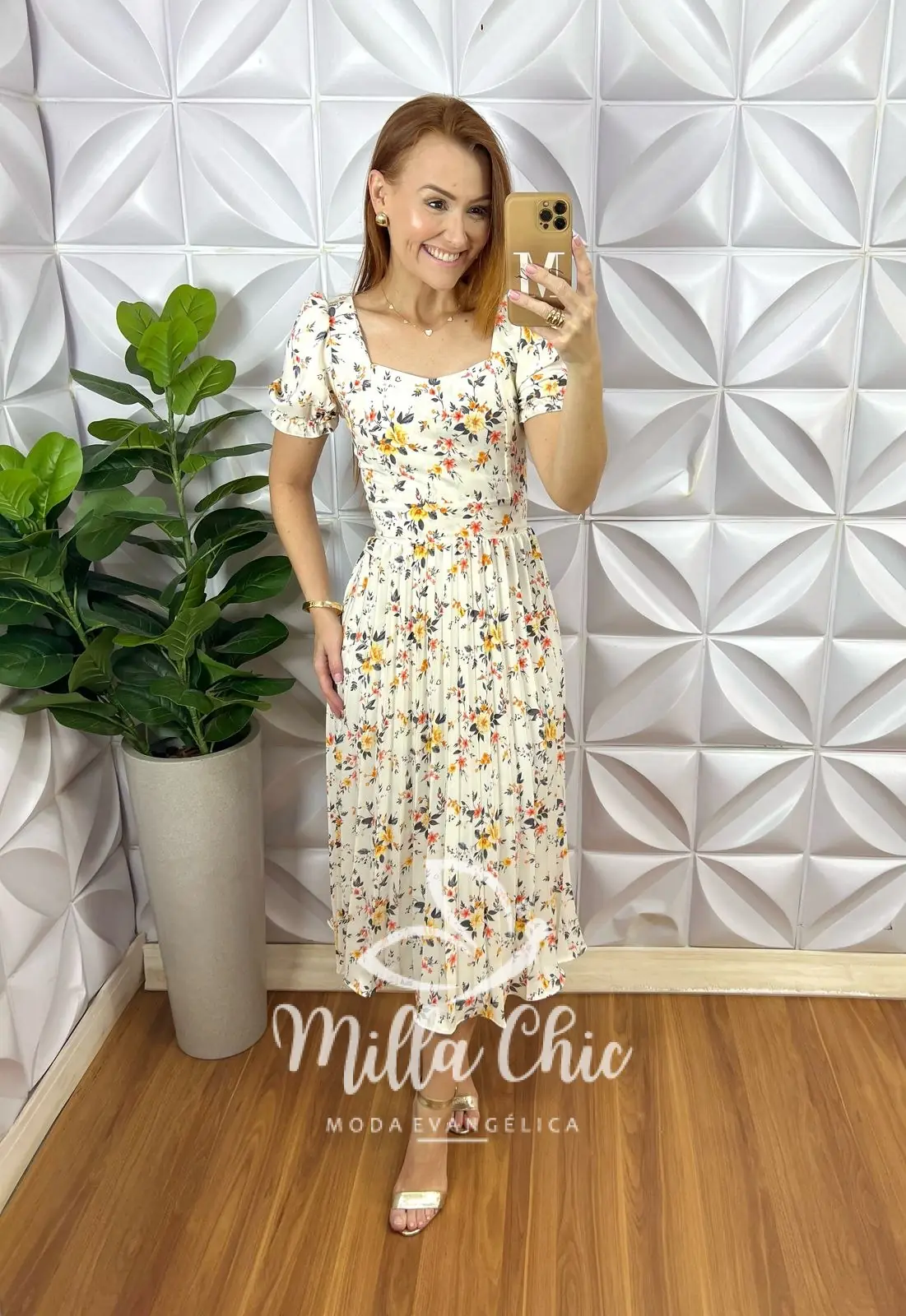 Aquele toque de clássico e elegante da saia toda plissada e a delicadeza da manga princesa é do decote coração .
