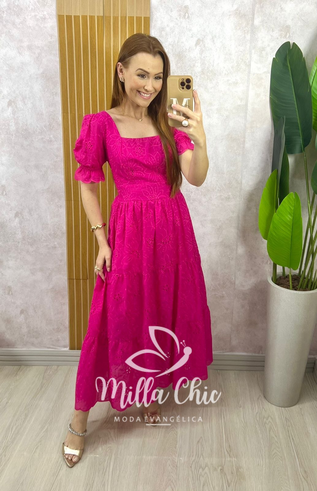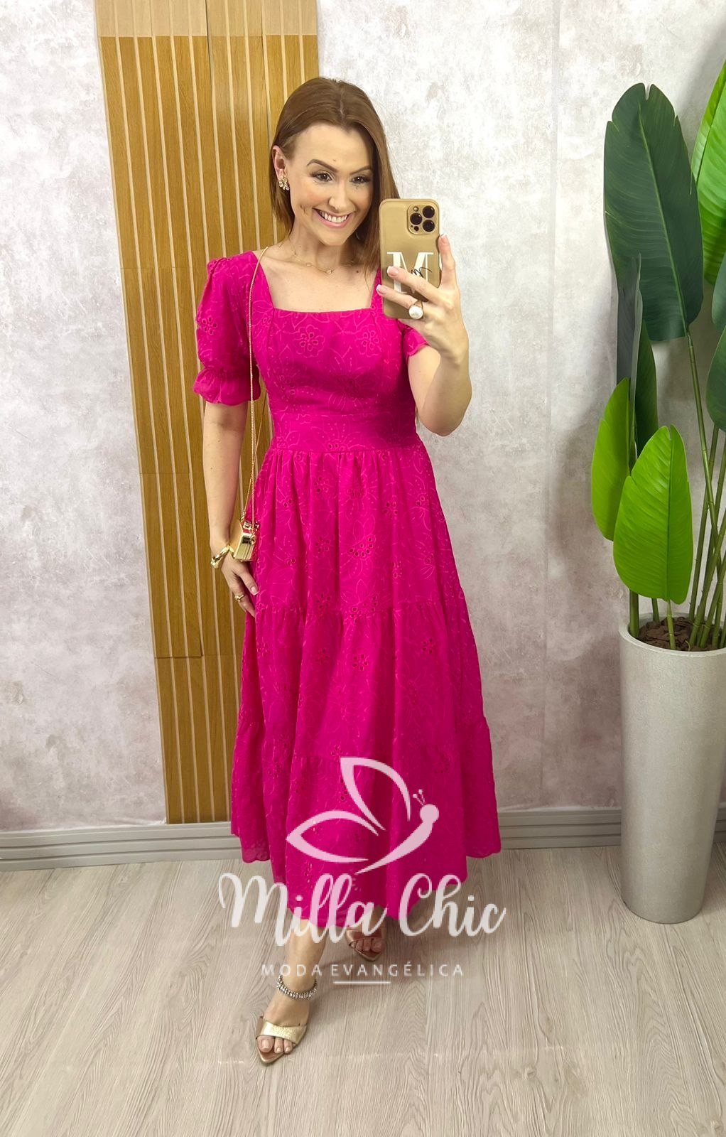 Além de fazer parte dos momentos mais especiais, o vestido Danila foi confeccionado para fazer você brilhar e realçar ainda mais a sua beleza, trazendo também muito frescor para essa estação! Todo confeccionado em fibra natural no tecido Laise 3D {100% Algodão}, na cor queridinha: Pink . Possui também: forro, decote quadrado , manga curta princesa com preguinha na lateral e , corpinho estruturado e desce na saia com babados . Uma modelagem apaixonante, como só a Milla sabe fazer! Para minhas irmãzonas ficarem lindas e princesas .