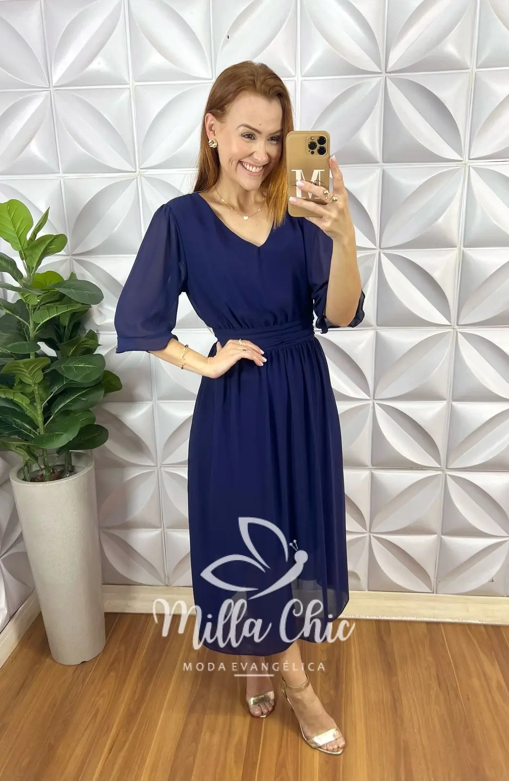 Ele é voal e fluido decote v e manga 3/4 . A cintura é toda marcada trazendo muita feminilidade .