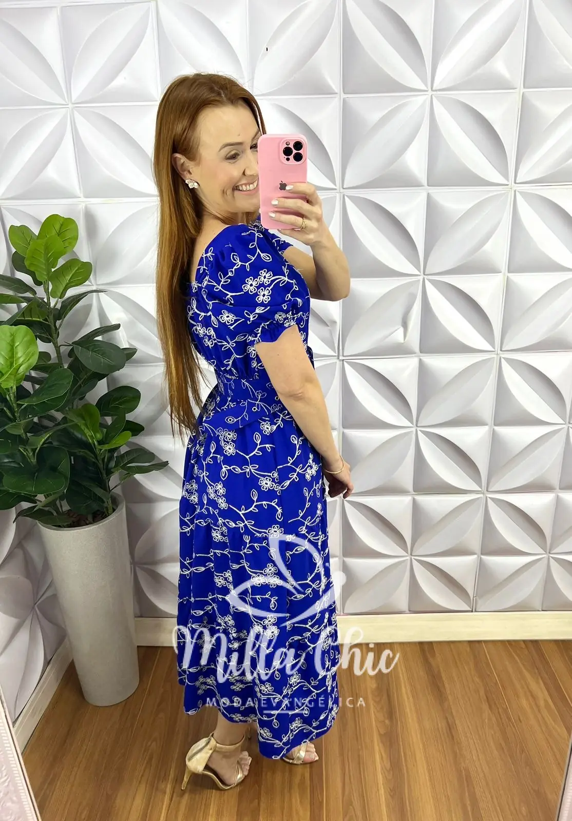 Vestido Dunna Bordado Mídi Com Cinto Encapado Bianca - Azul - Milla Chic