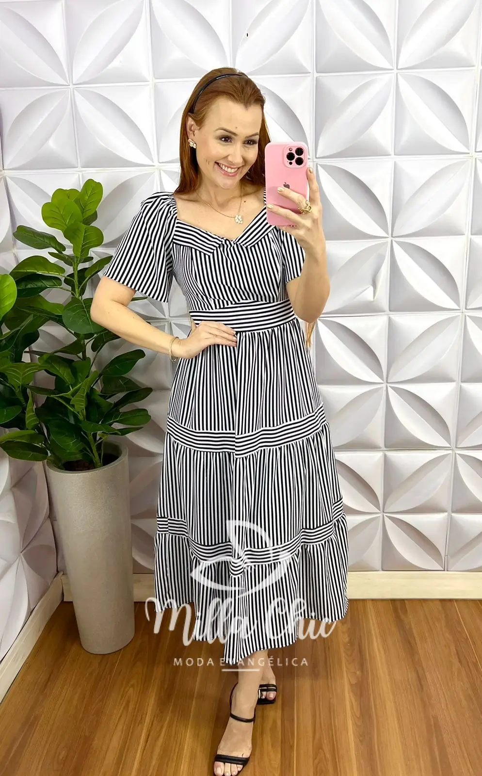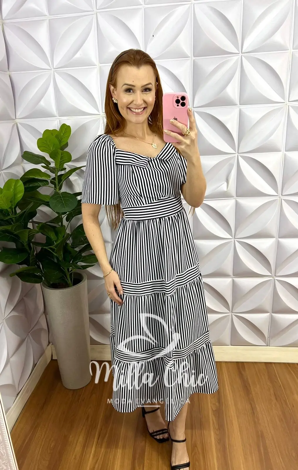 Vestido Crepe Alfaiataria Mídi Com Gola Listrado Carina - Preto - Milla Chic