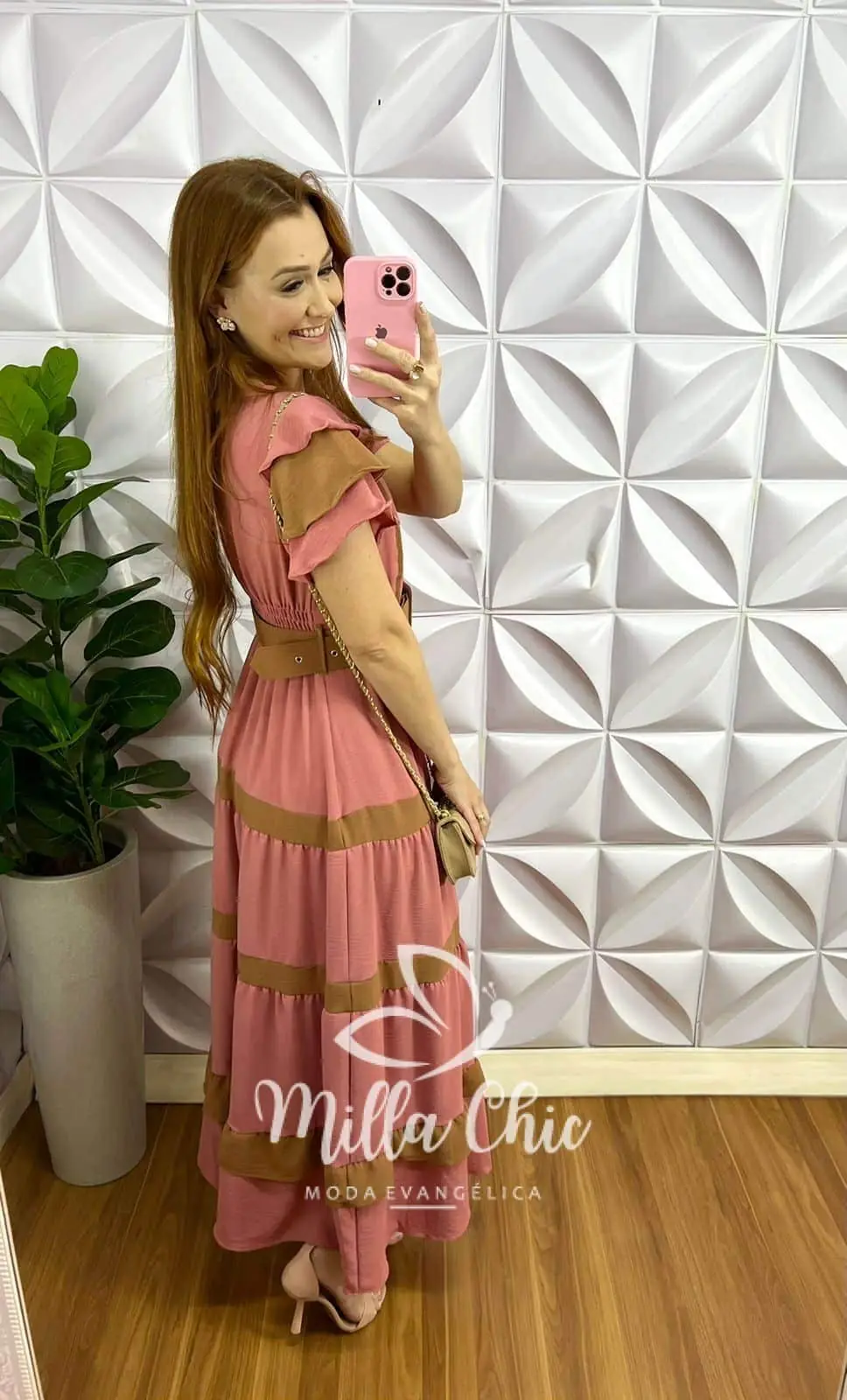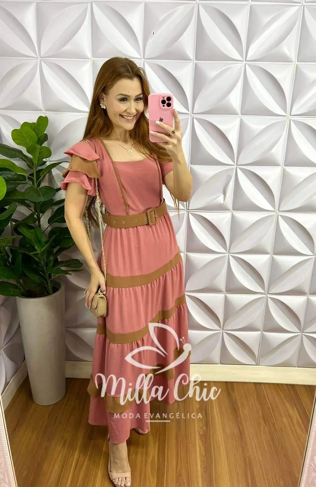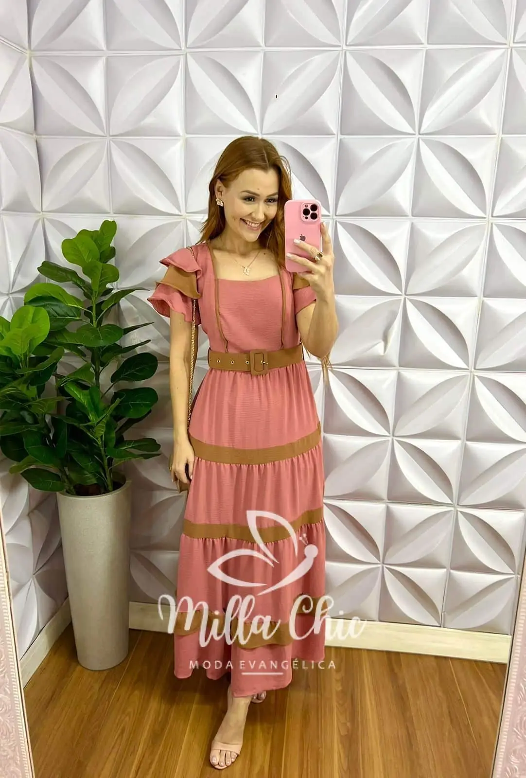 Vestido Dunna Mídi Com Marias e Cinto Bicolor Marcela - Rosa Com Marrom - Milla Chic