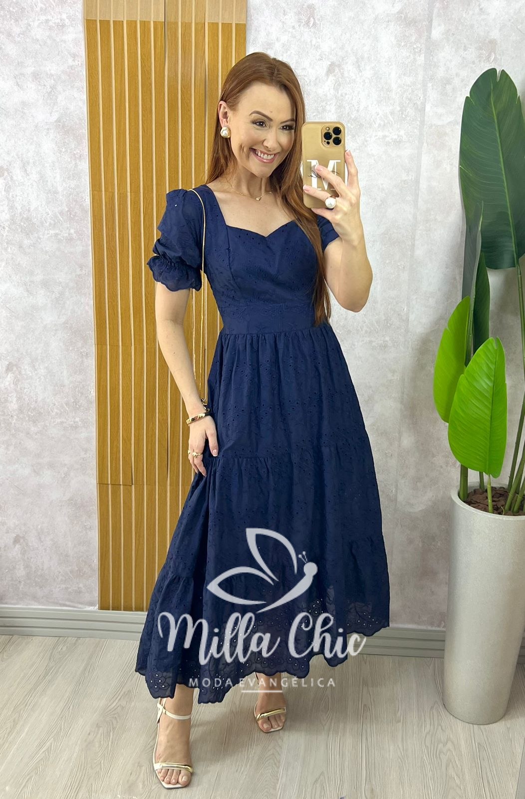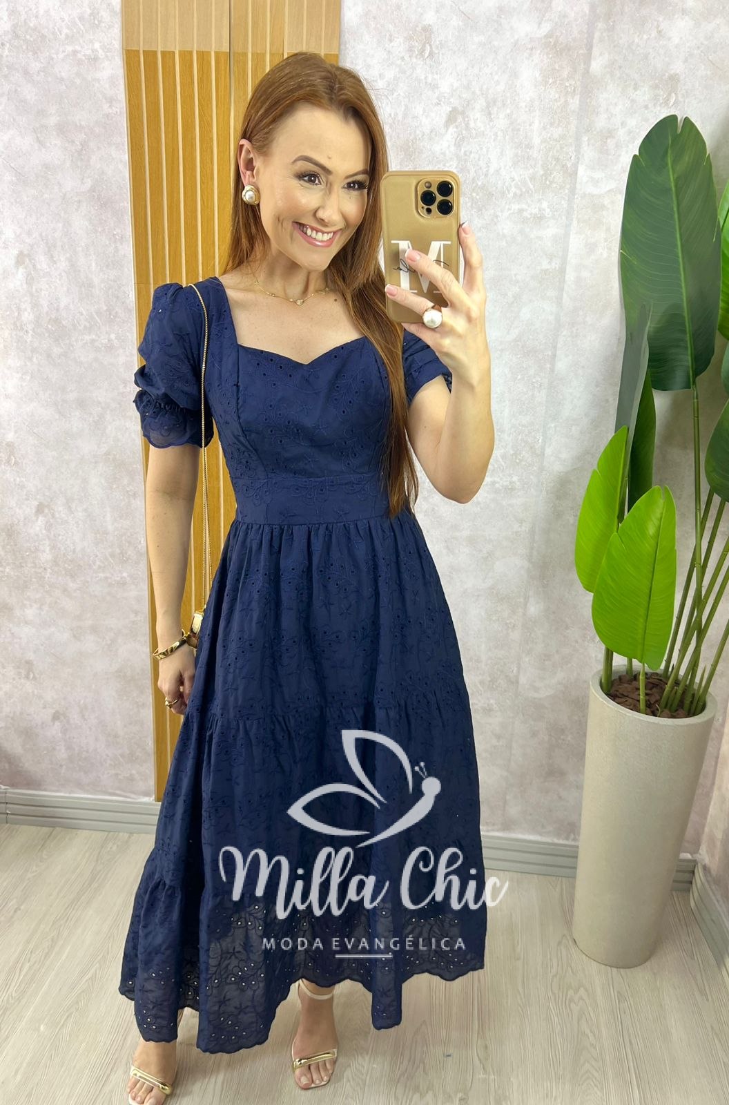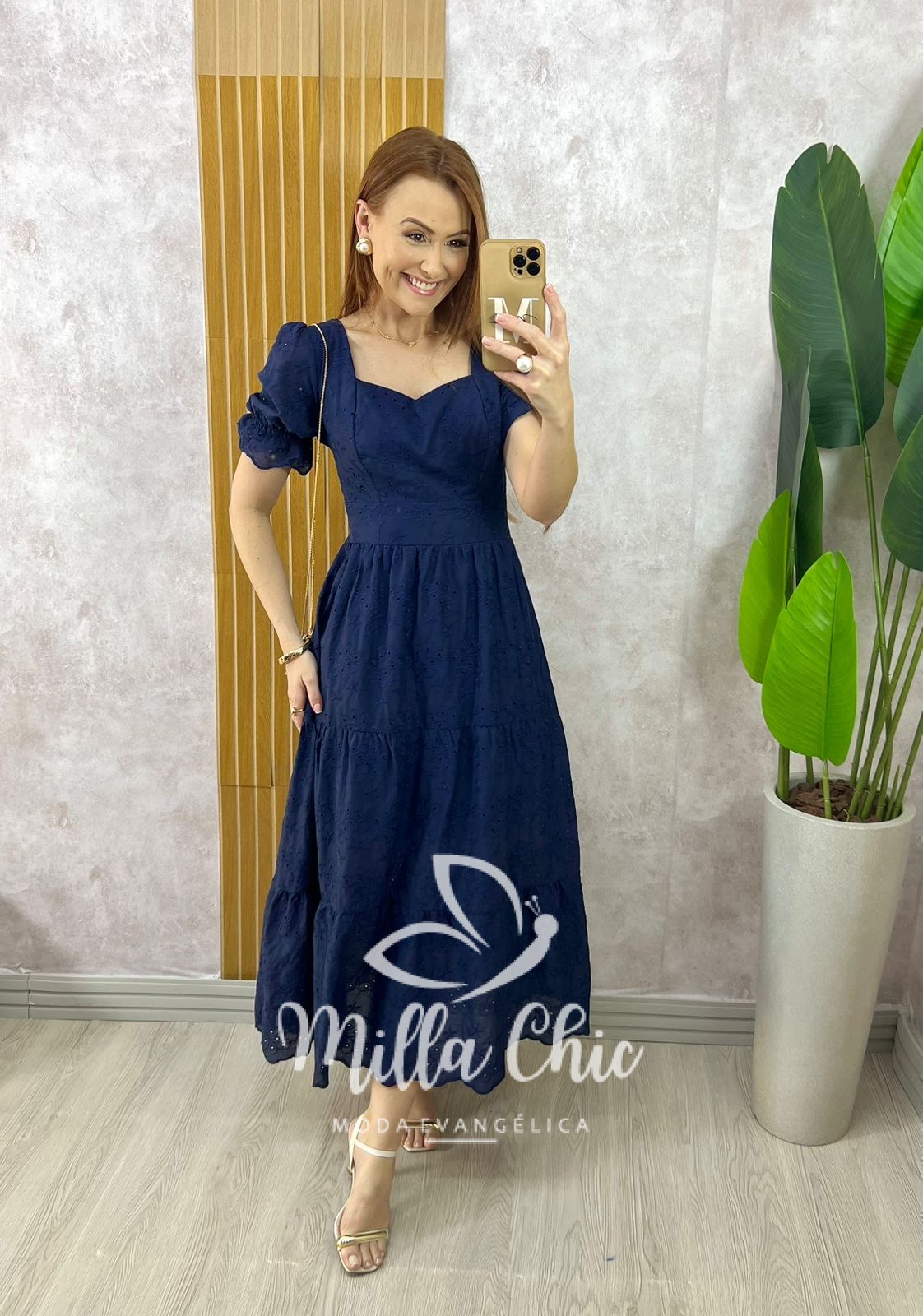 Vestido Estela Lesie Algodão Bordada – Azul Marinho