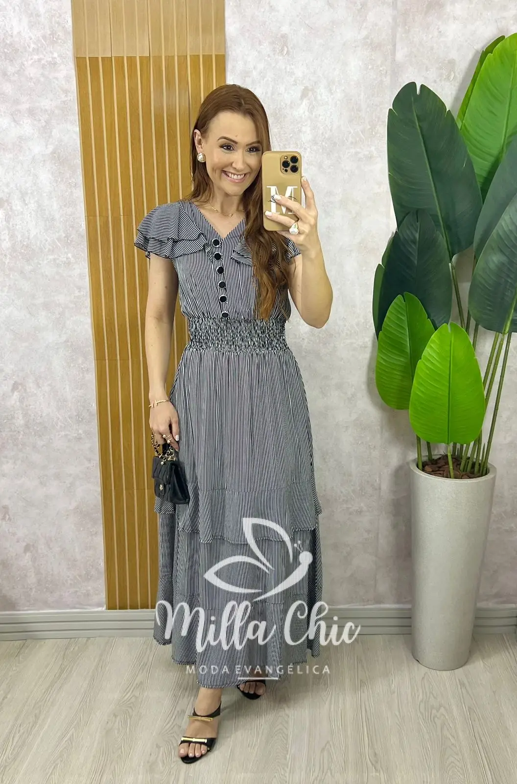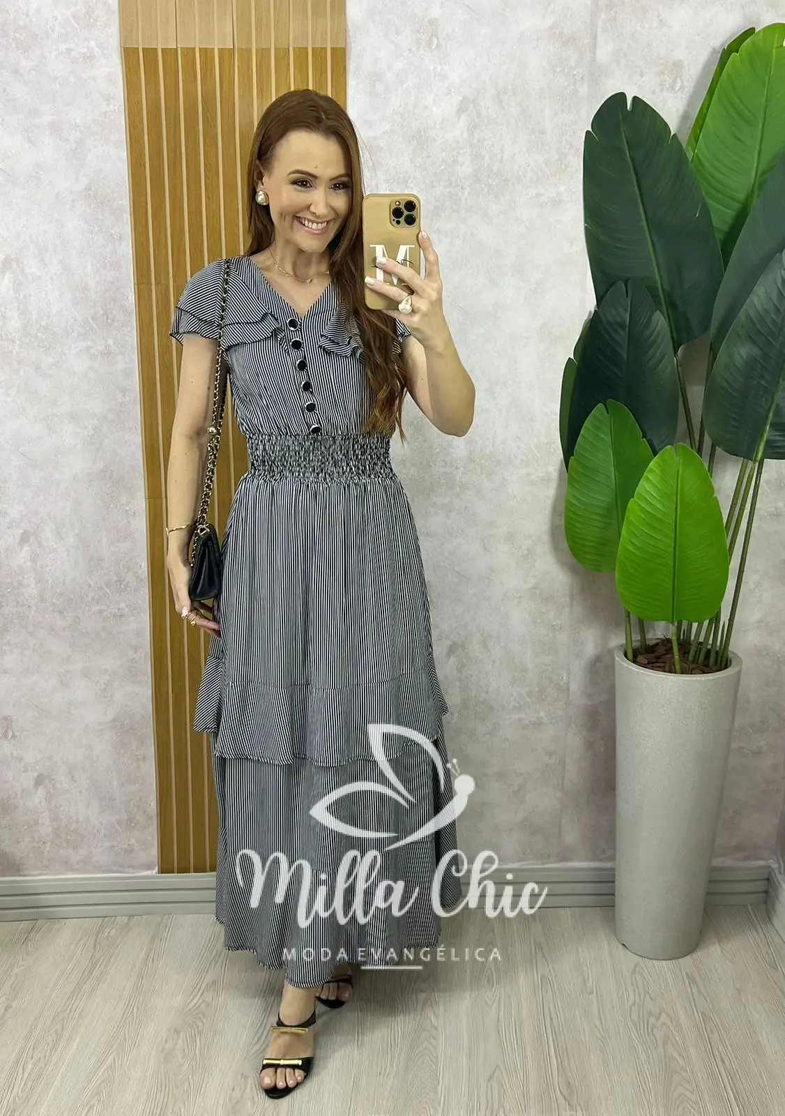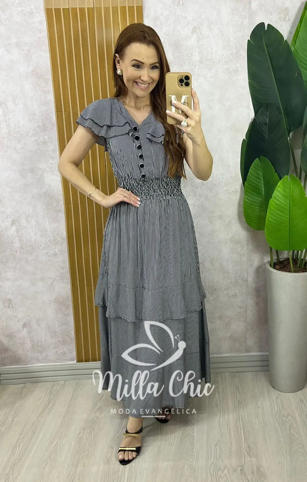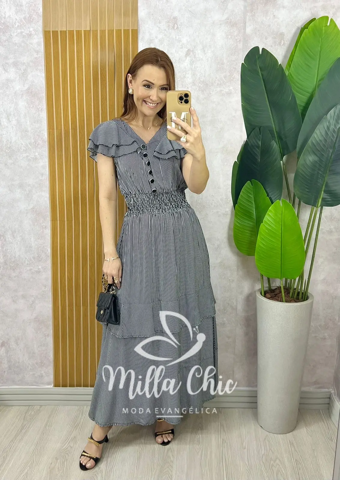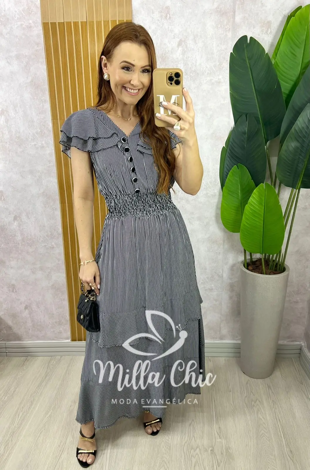 O vestido Eva é elegante e bem verão que transmite elegância e autenticidade. Clássico e atemporal. Nessa estampa linda de em listras . Uma peça indispensável no guarda roupas. Ele apresenta um design longo com elastex na cintura botões funcionais e tem na saia esses babados que dão todo estilo e elegância para esse modelo.