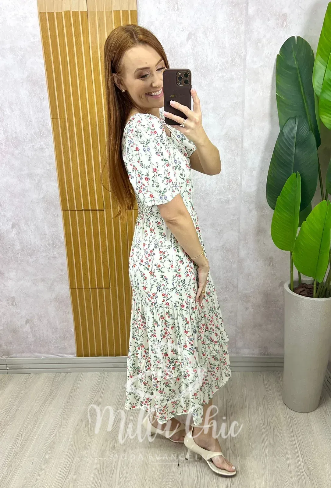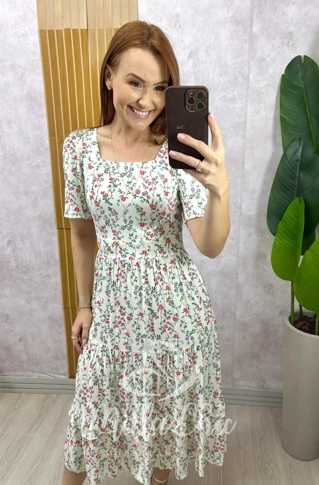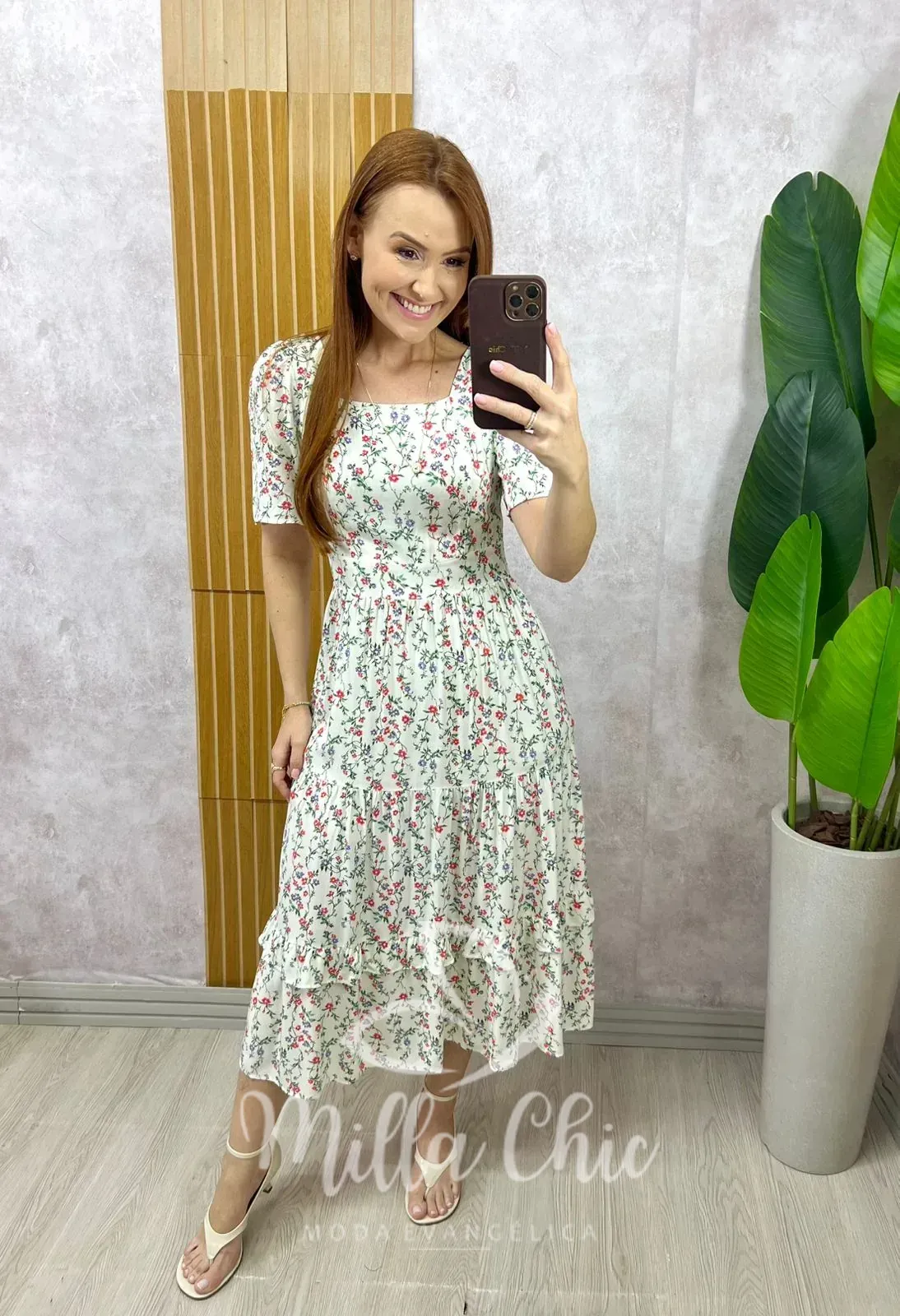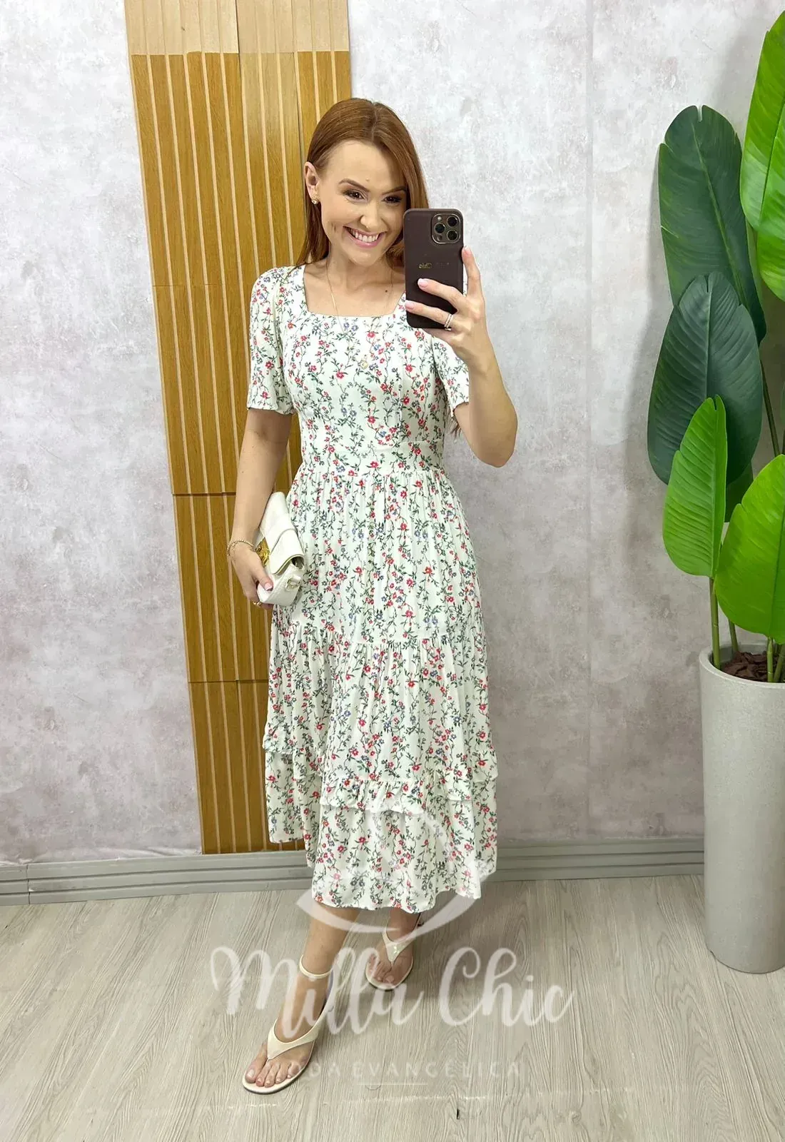 Elástex nas costas para deixar bem acinturada , decote quadrado e os babados nos entremeios da saia que deixam esse vestido com aquele toque autentico e chic.
