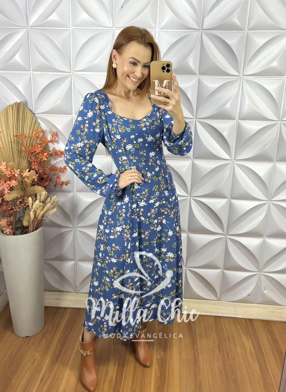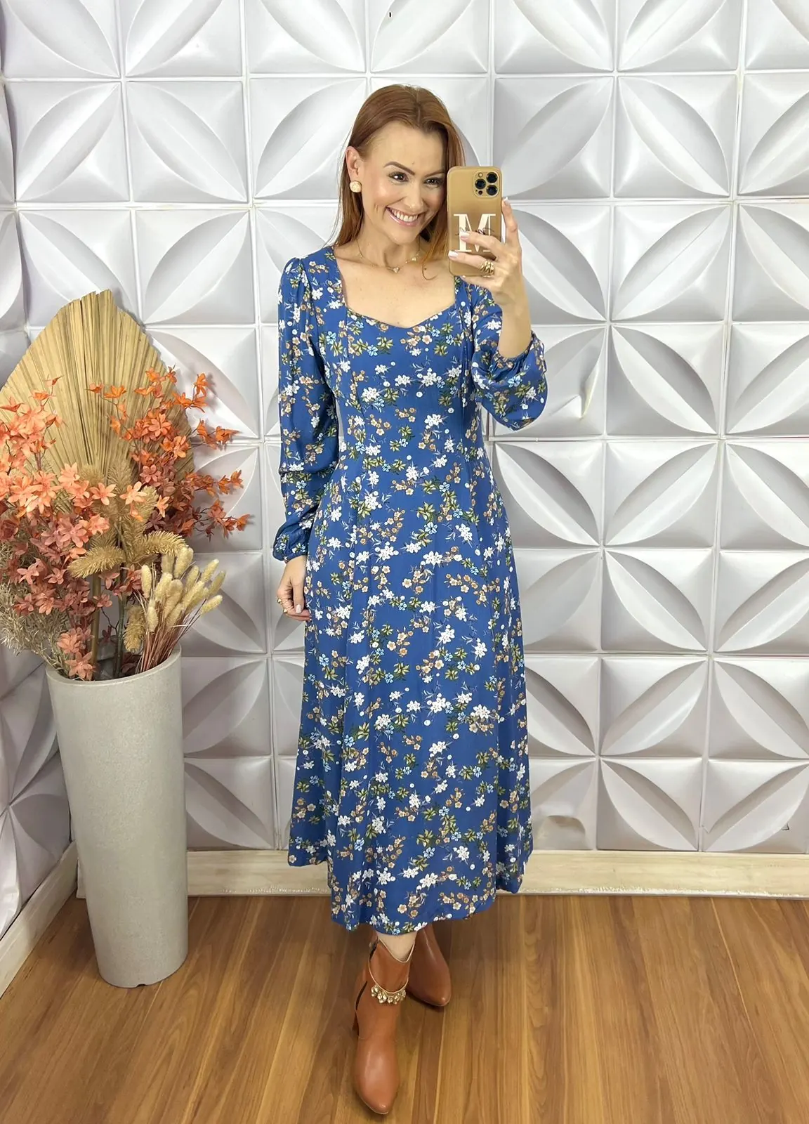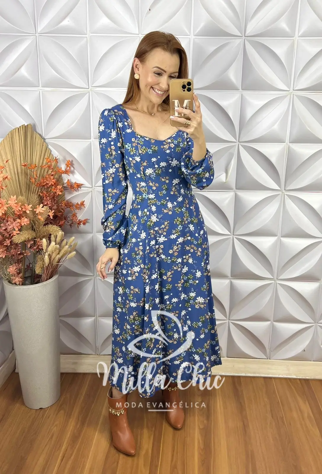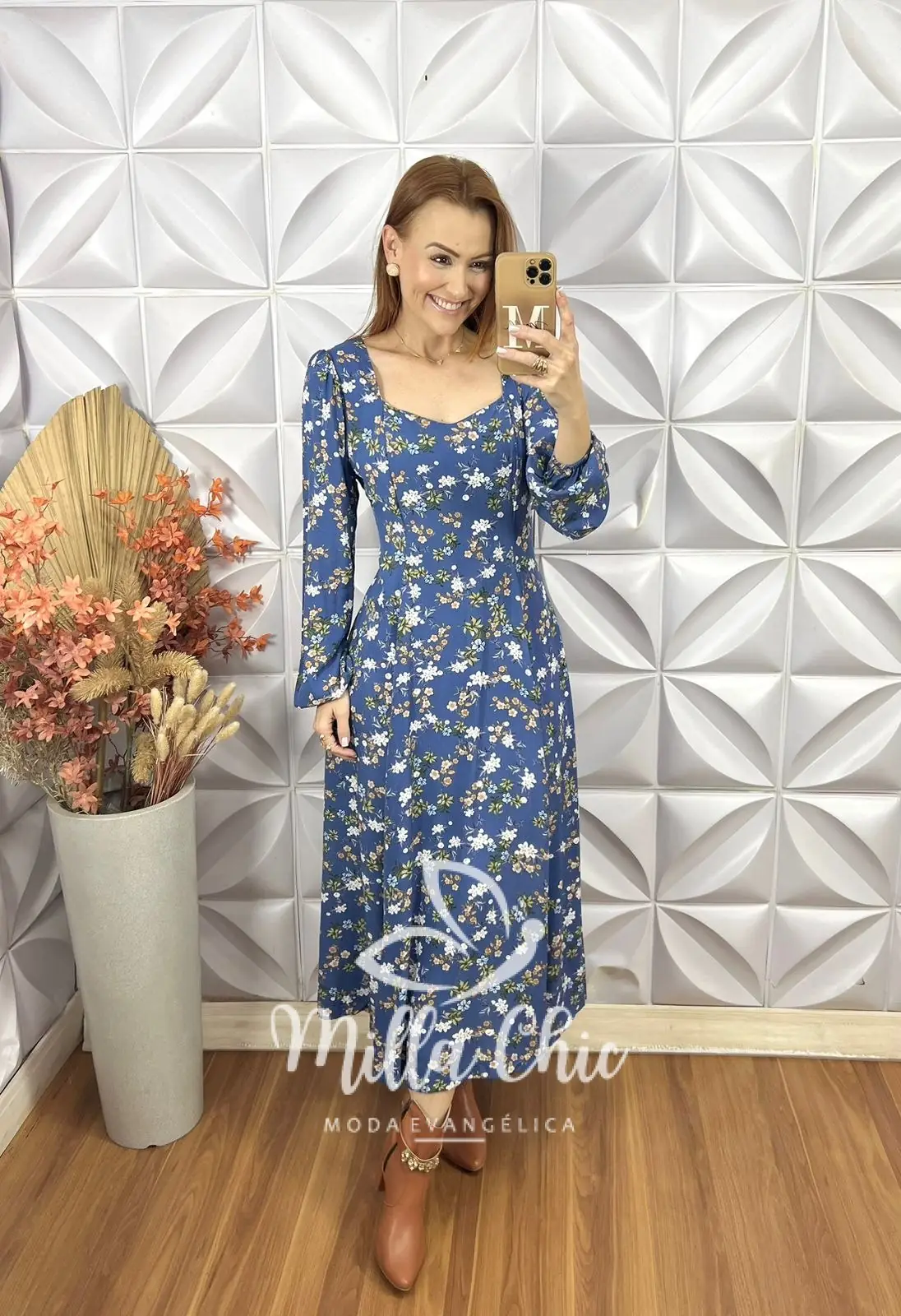 Vestido Frida Jardim fundo azul com flores delicadas, uma peça que combina estilo e conforto em uma única roupa. Feito em viscose, esse vestido é ideal para quem deseja um look que exala sofisticação e leveza.
