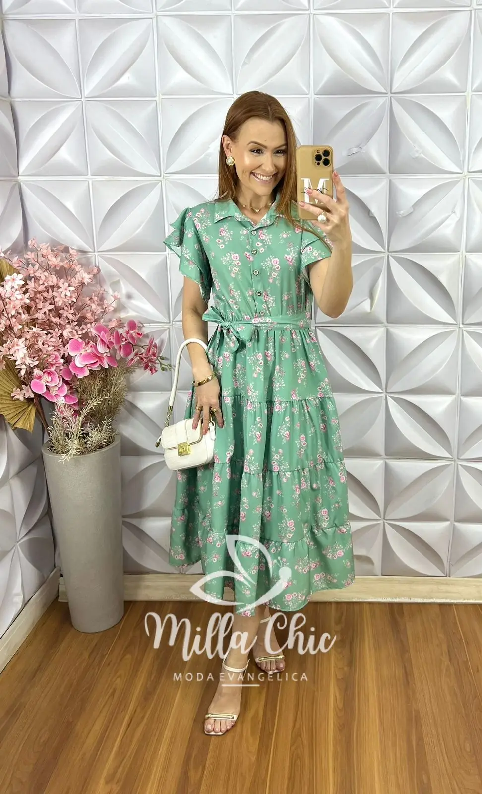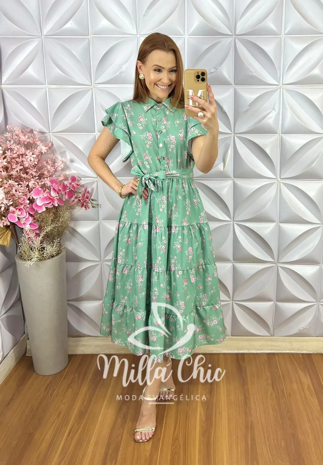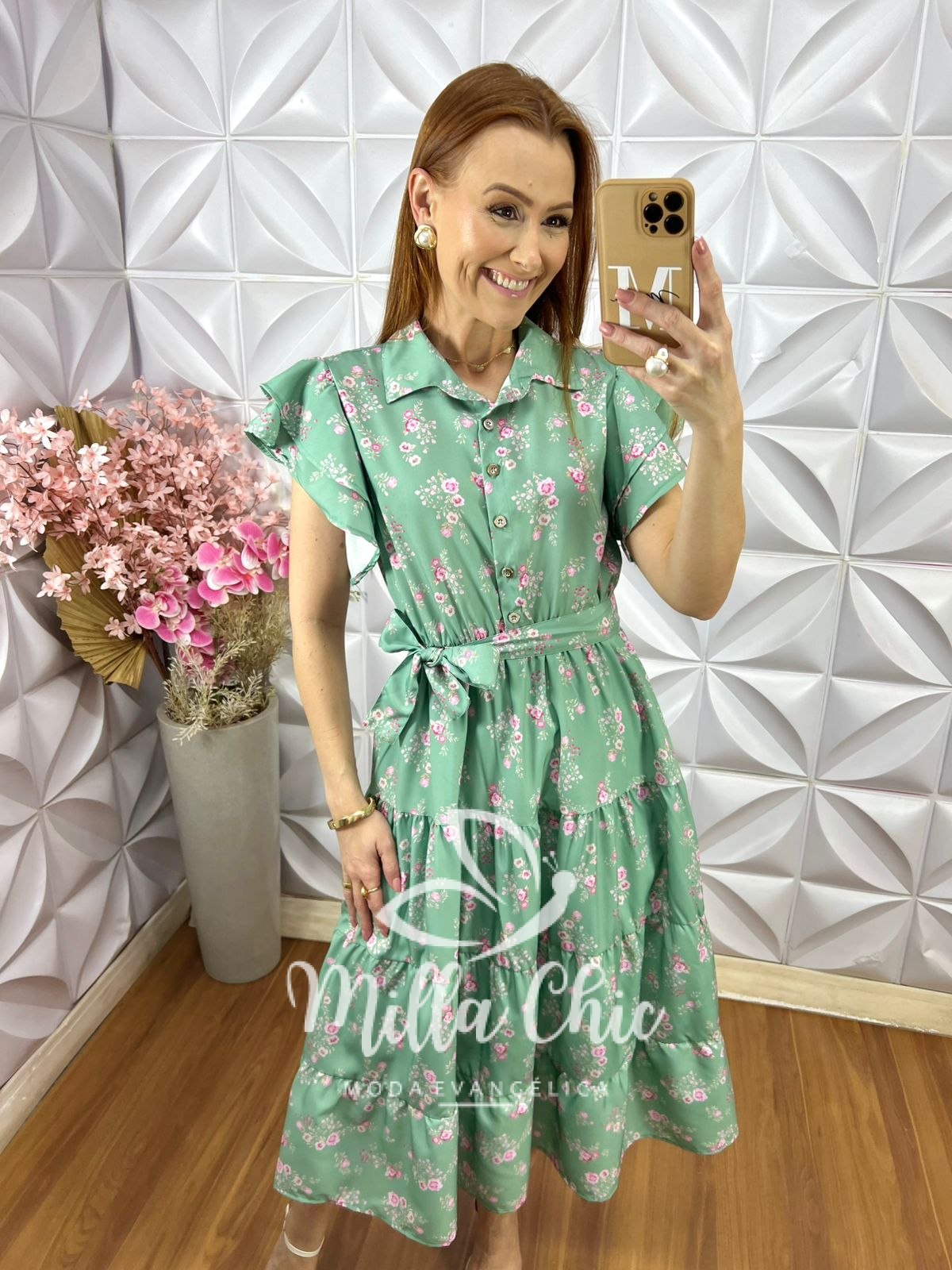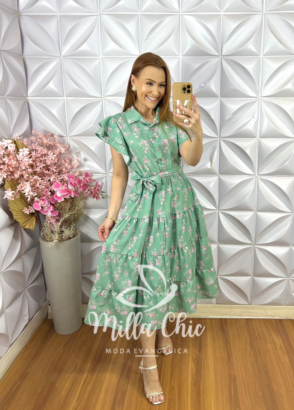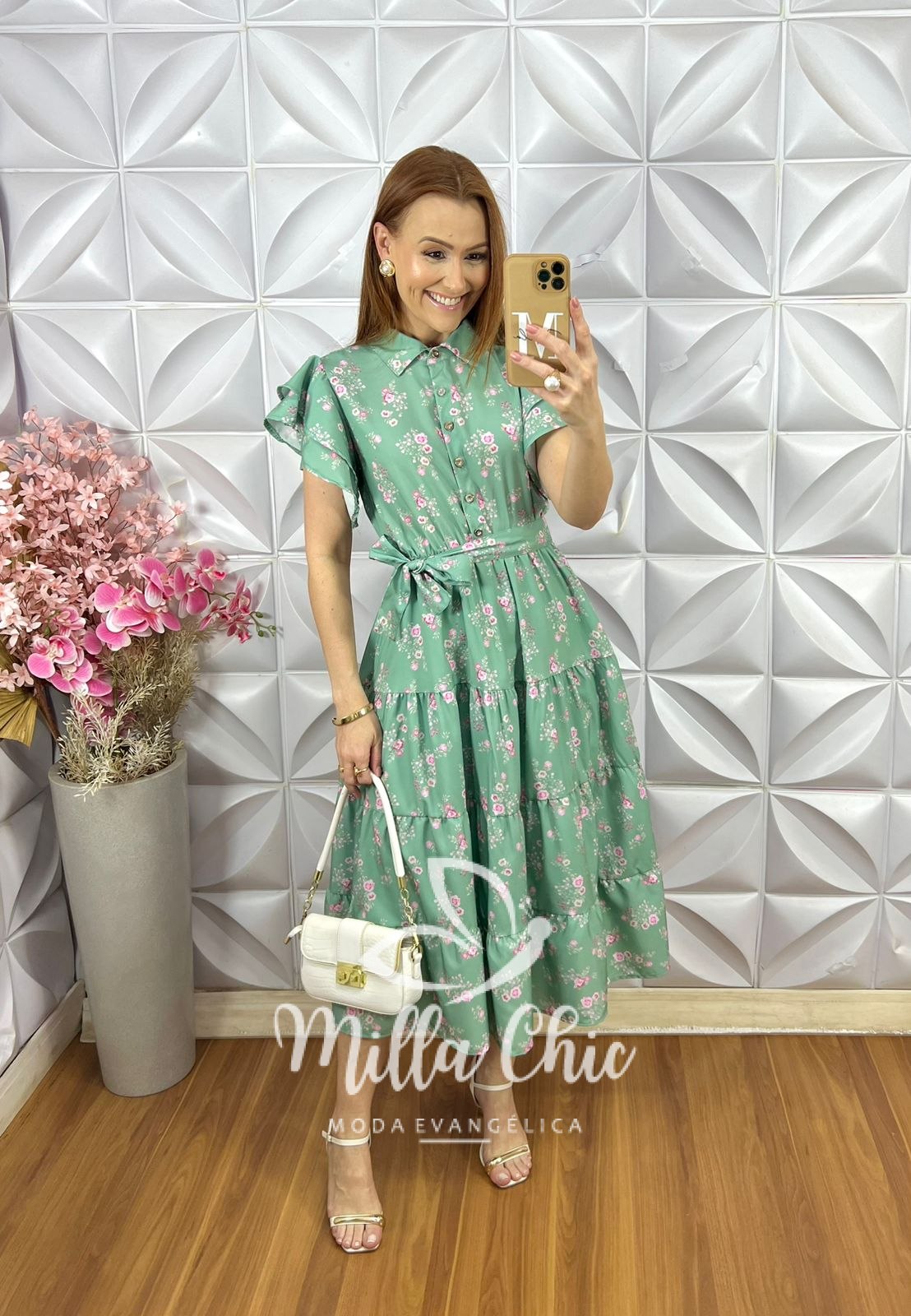 Botões dourados funcionais , acompanha a faixa cinto que dá aquela acinturada , a manga tem os babados que transmite modernidade e leveza . As saias são em marias que dão aquele movimento lindo e solto .