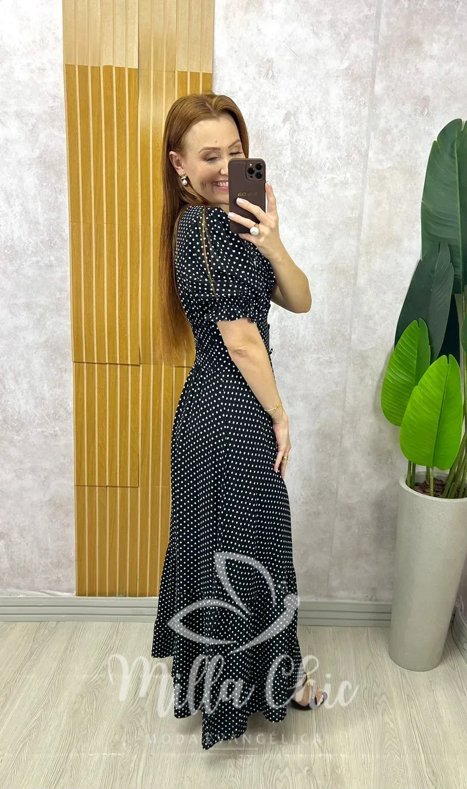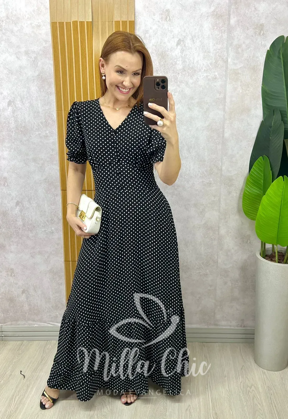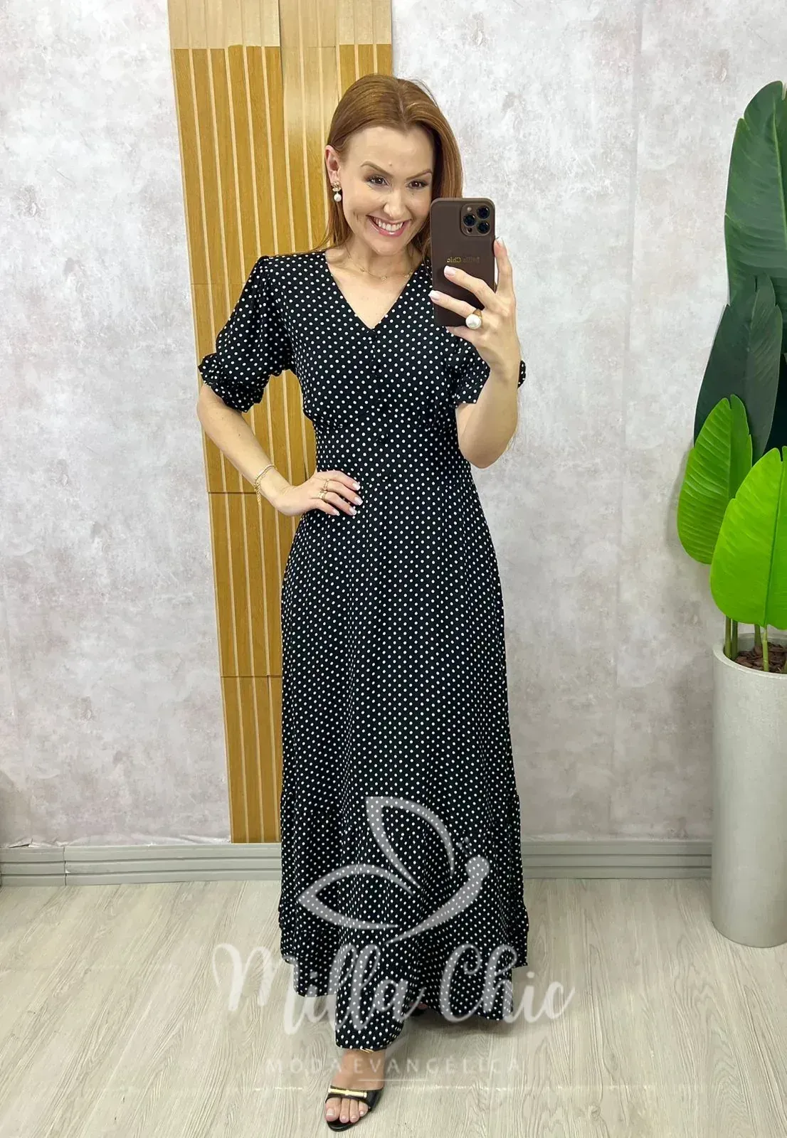 Nessa estampa de póa linda e atemporal ele tem o comprimento longo com os babados na saia para dar um ar bem autêntico e moderno .