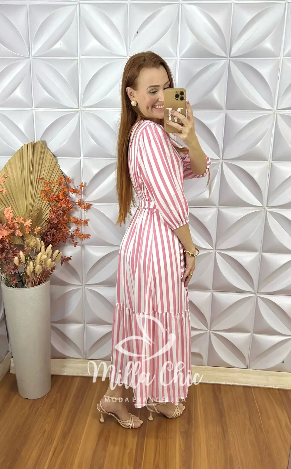 A cintura é toda marcada trazendo muita feminilidade . E acompanha a faixa cinto para acinturar .