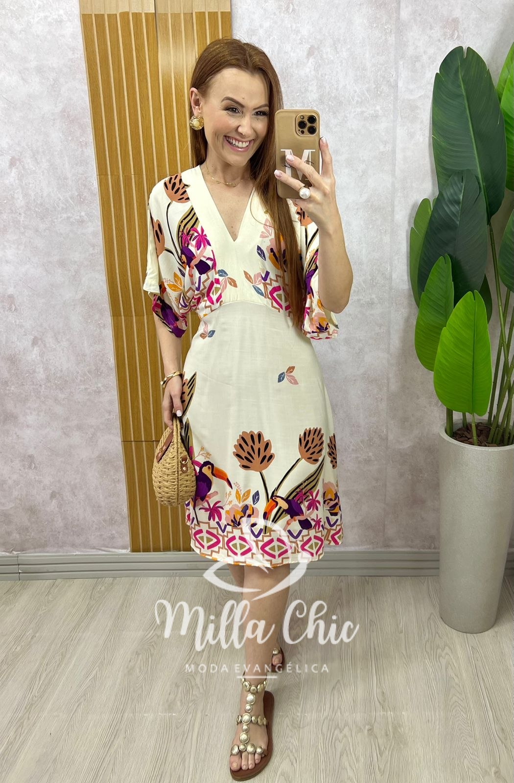 O vestido Hungria tem essa estampa linda e bem verão que transmite alegria e autenticidade. Ele apresenta um comprimento perfeito e confortável. Nas costas possui elástico nas costas bem fino que valoriza a silhueta feminina, proporcionando um caimento perfeito.
