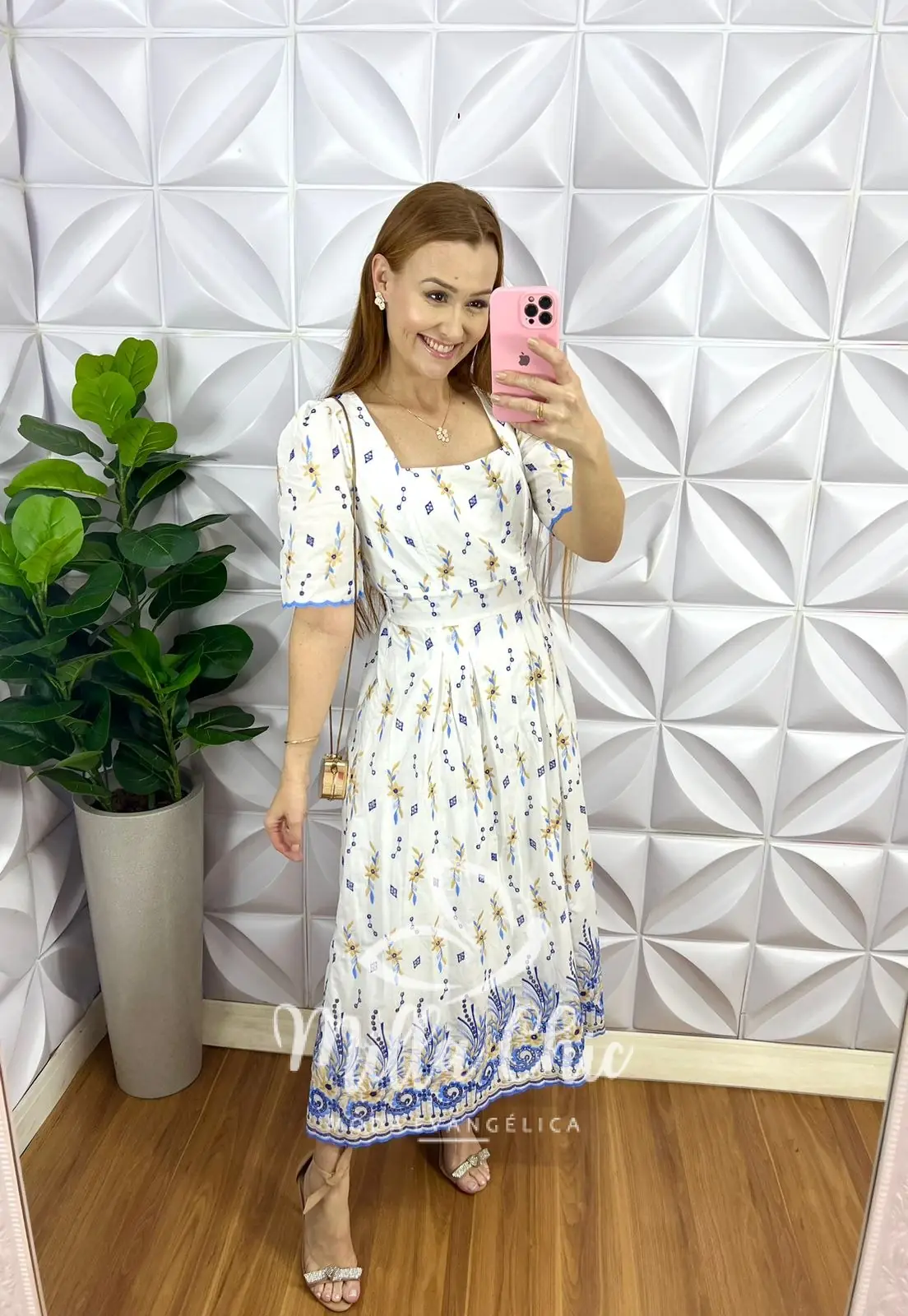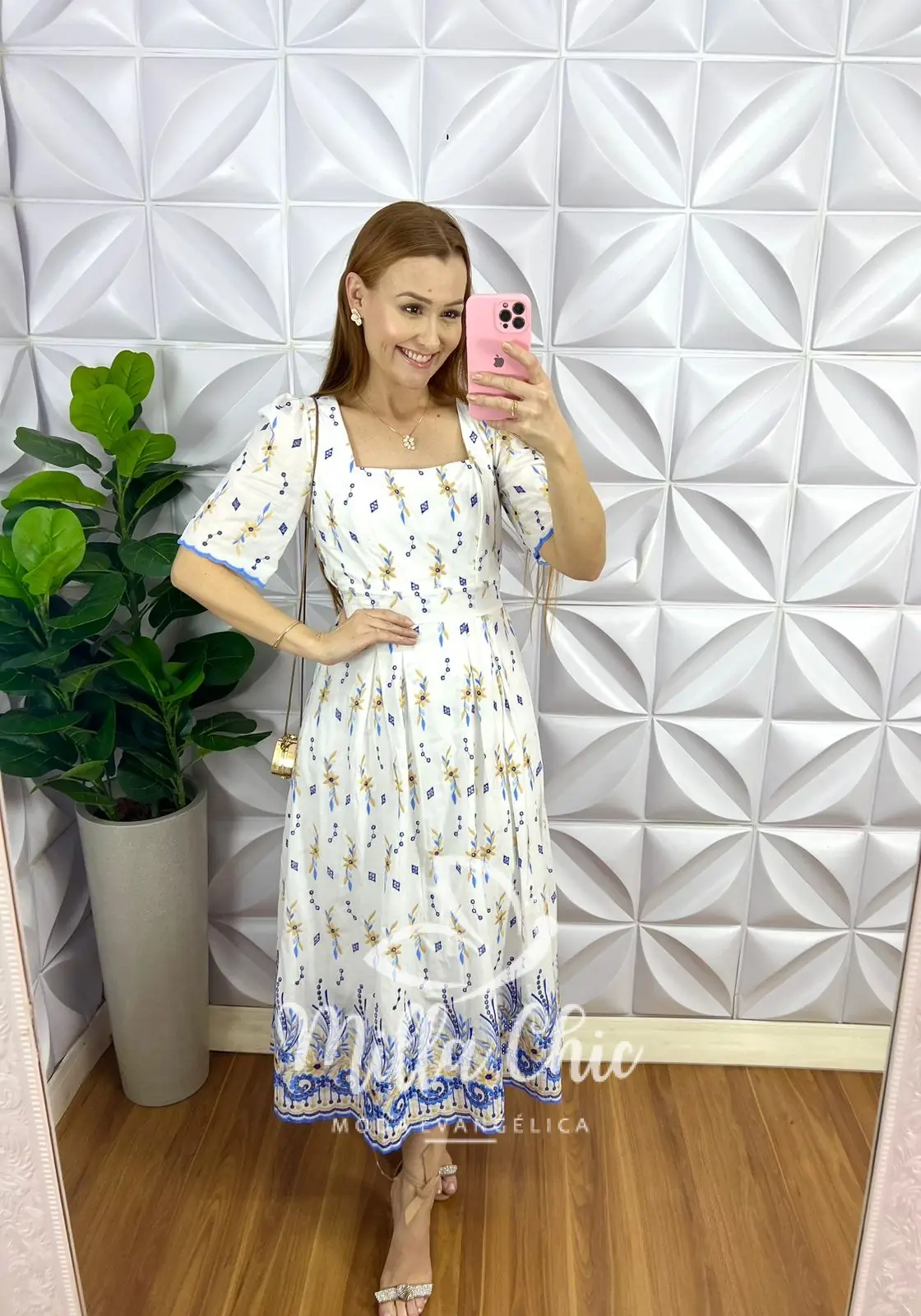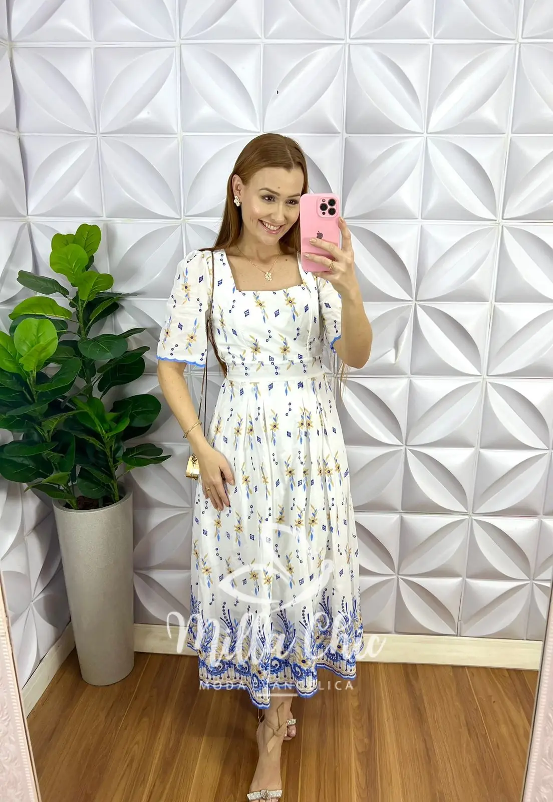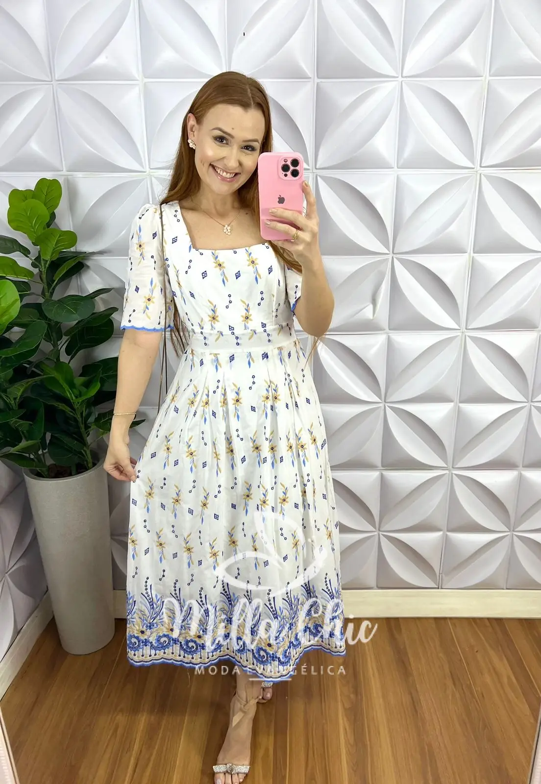 Vem no comprimento Mídi, com caimento evase com drapeados na saia, decote quadrado, manga princesa com barra bordada, recorte no busto, pala na cintura e lastex nas costa para vestir bem!