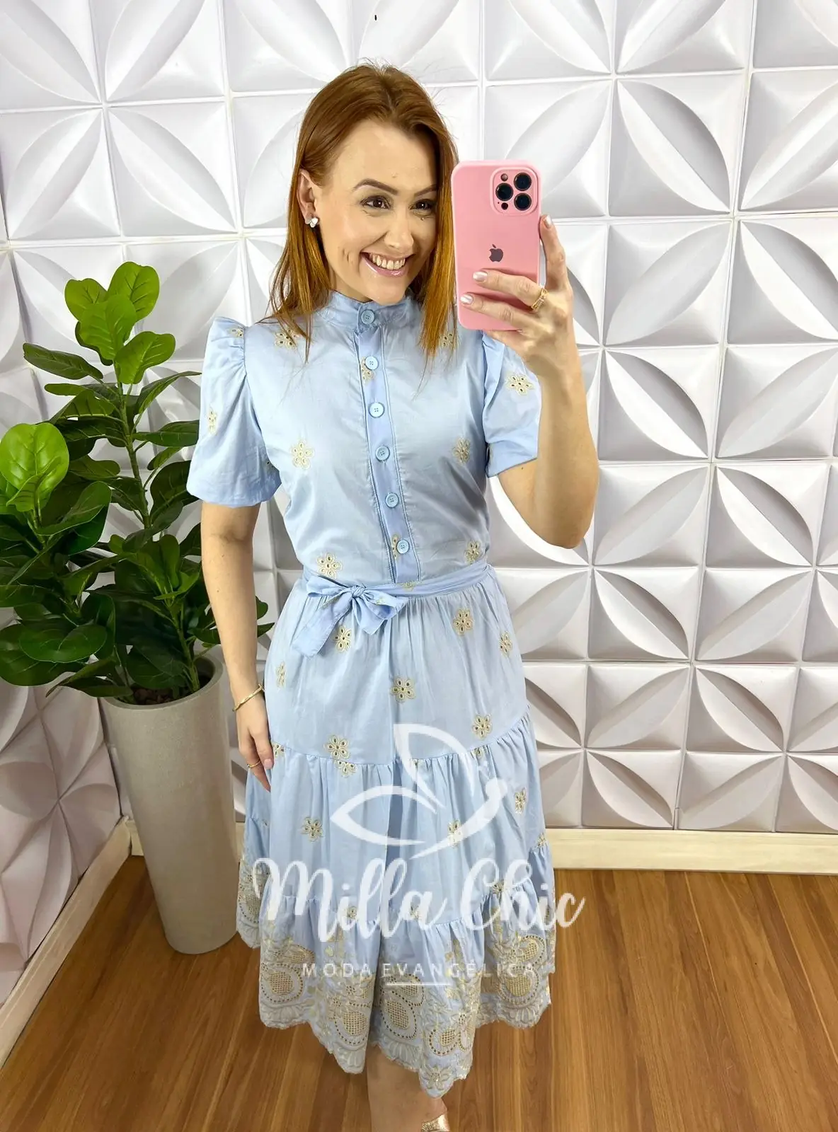 Possui: Gola padre, manga princesa com elástico na barra, pala no busto com botões funcionas, cintura marcada, Vem no comprimento mídi, caimento evase com marias, barrado todo trabalhado na laise que esta um charme! todo forrado, acompanha cinto faixa para marcar a cintura.