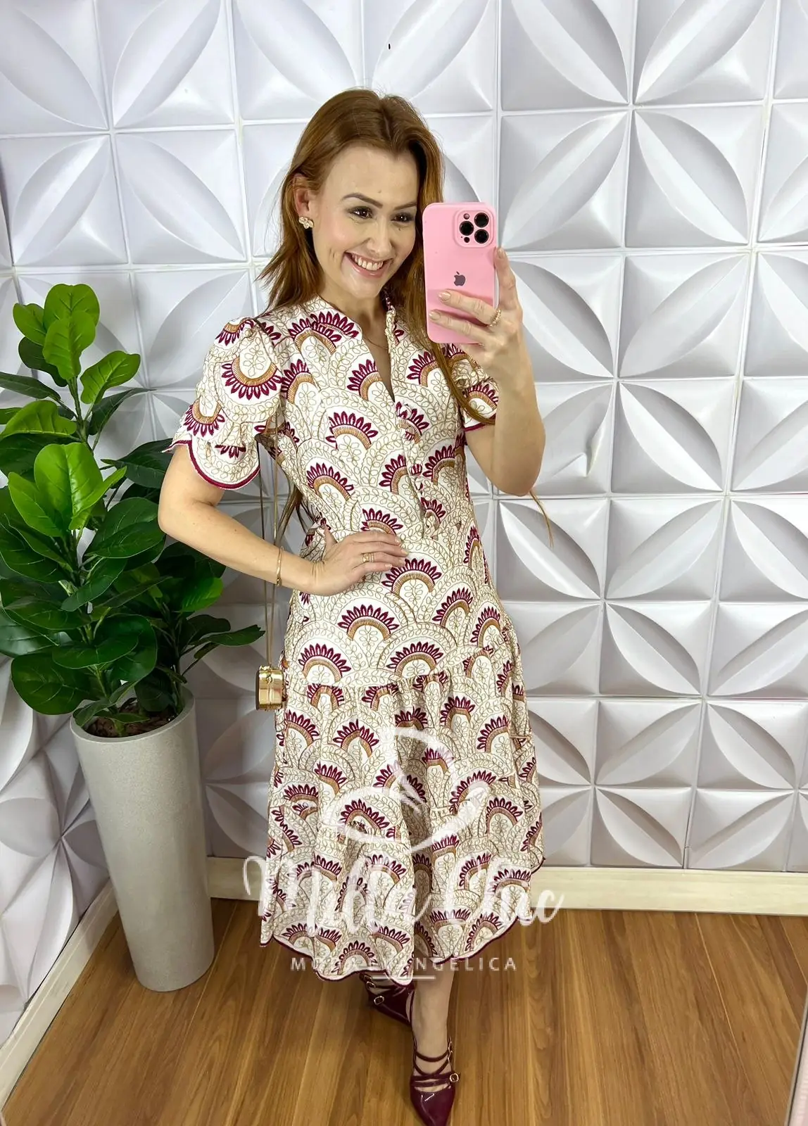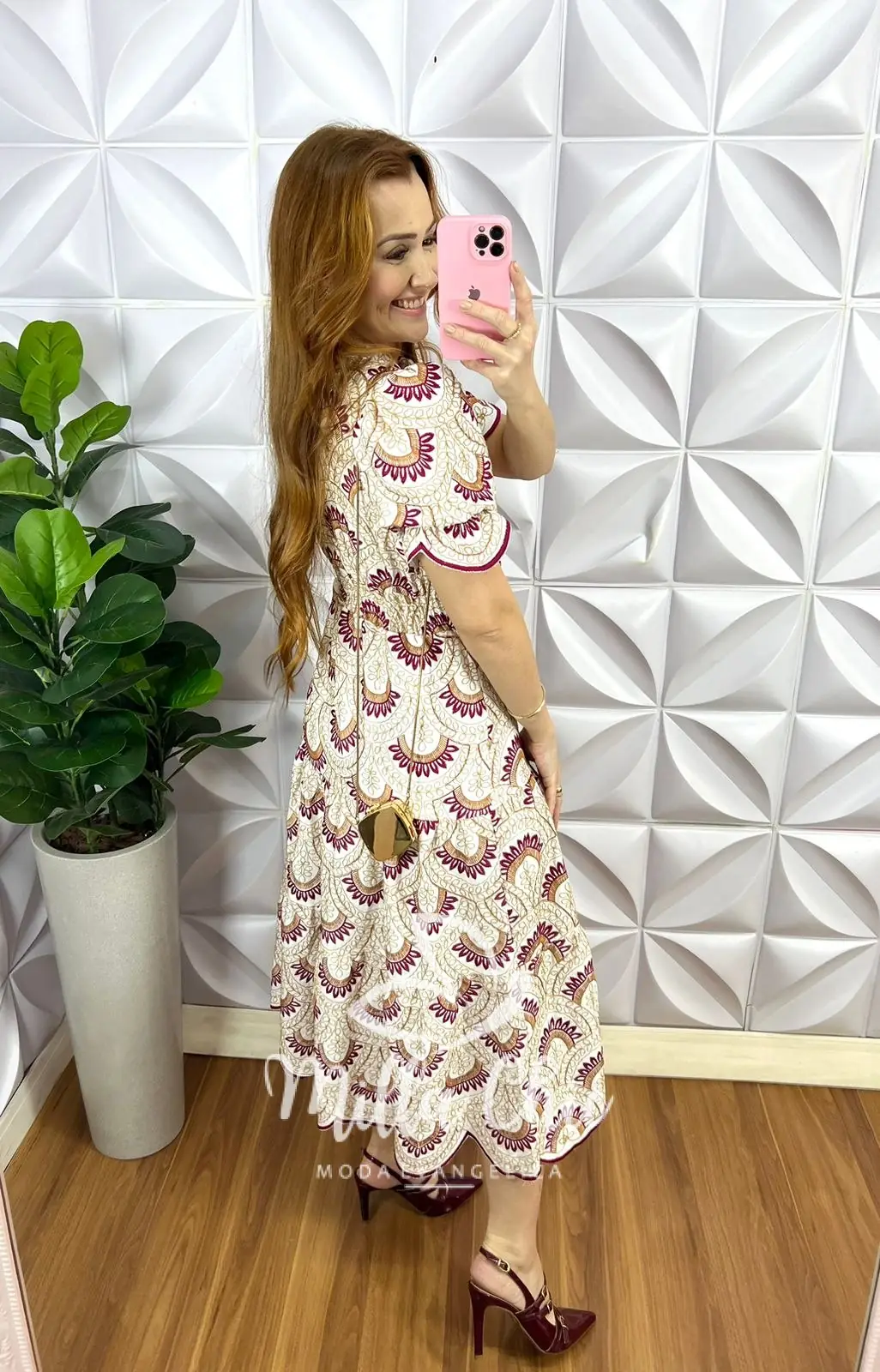 Esta vestindo tão bem irmãs tem elástico nas costas, Todo de botões de Perola funcionais, Todo forrado, manga princesa e comprimento midi Com saia Tres marias que esta um charme!