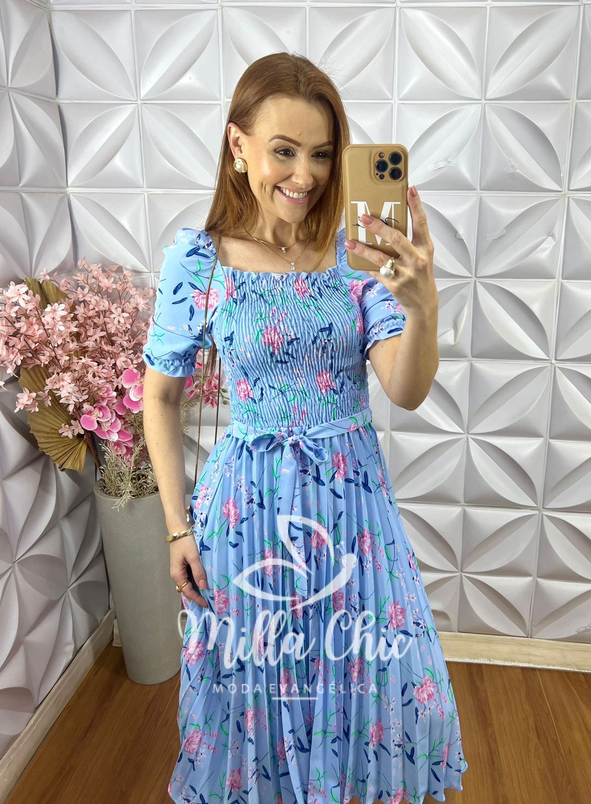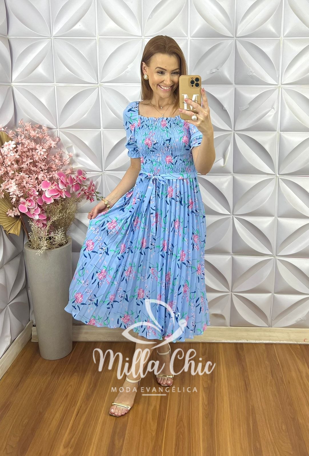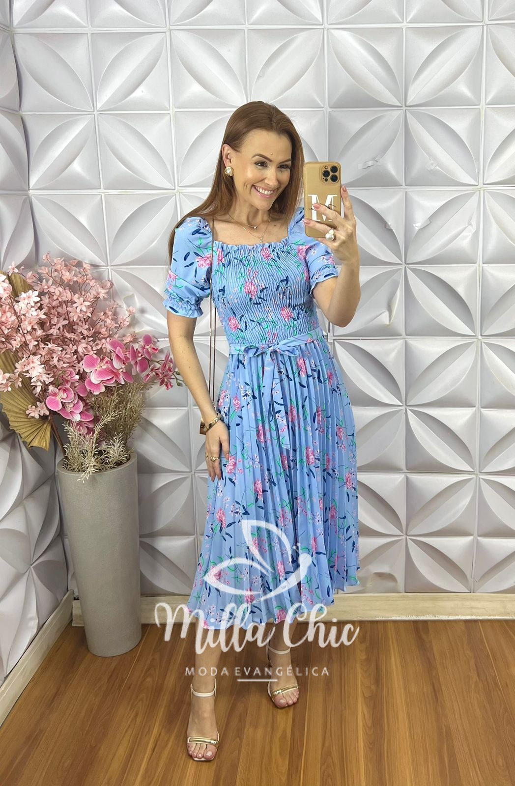 Aquele toque de clássico e elegante da saia toda plissada e a delicadeza da manga princesa são os diferenciais desse vestido.