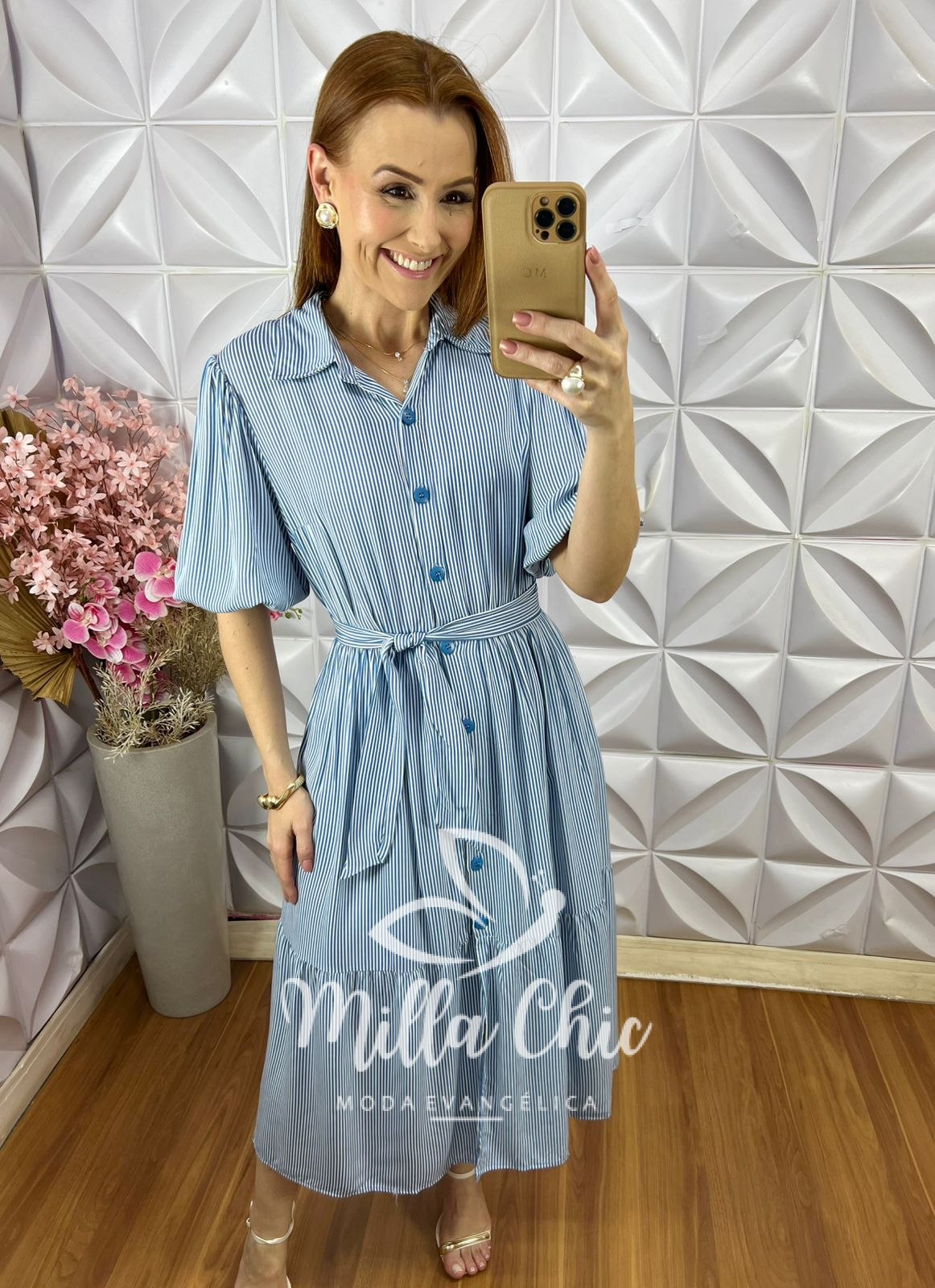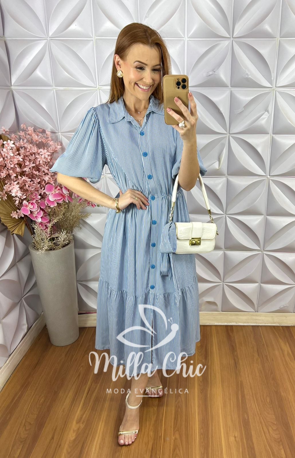 Vestido Leandra em Viscolinho Listrado - Azul - Milla Chic