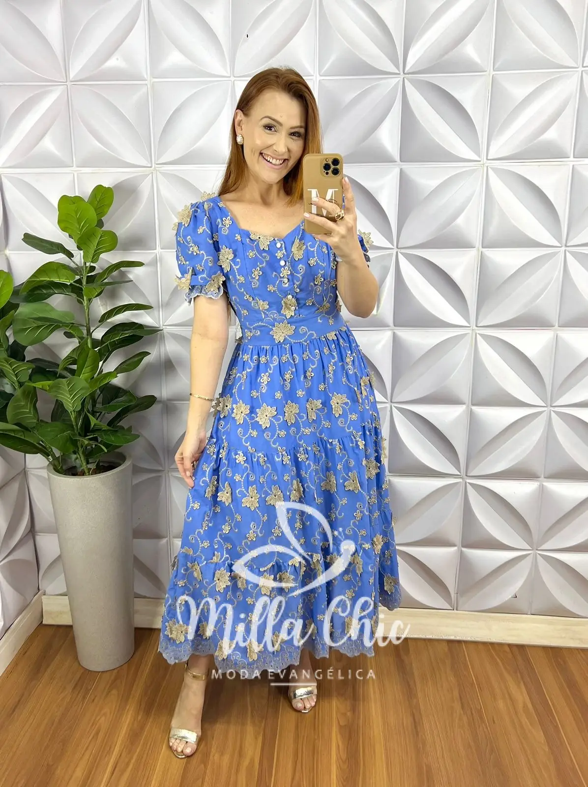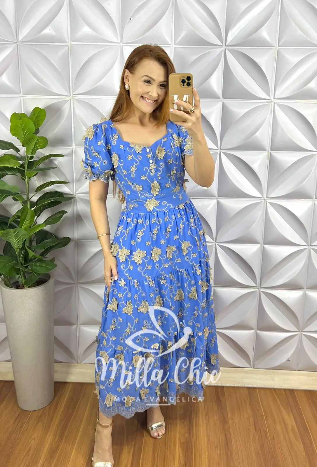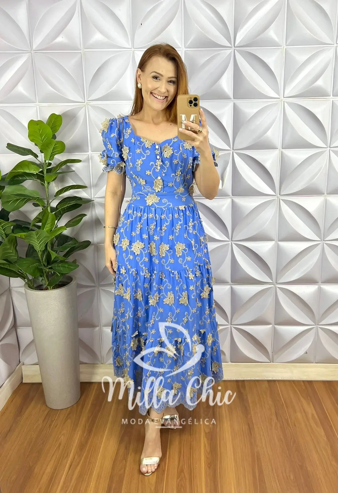 Vestido Leise Bordado tecido que traz delicadeza e romantismo para o look! Com bordados Em alto relevo floral que esta um charme!