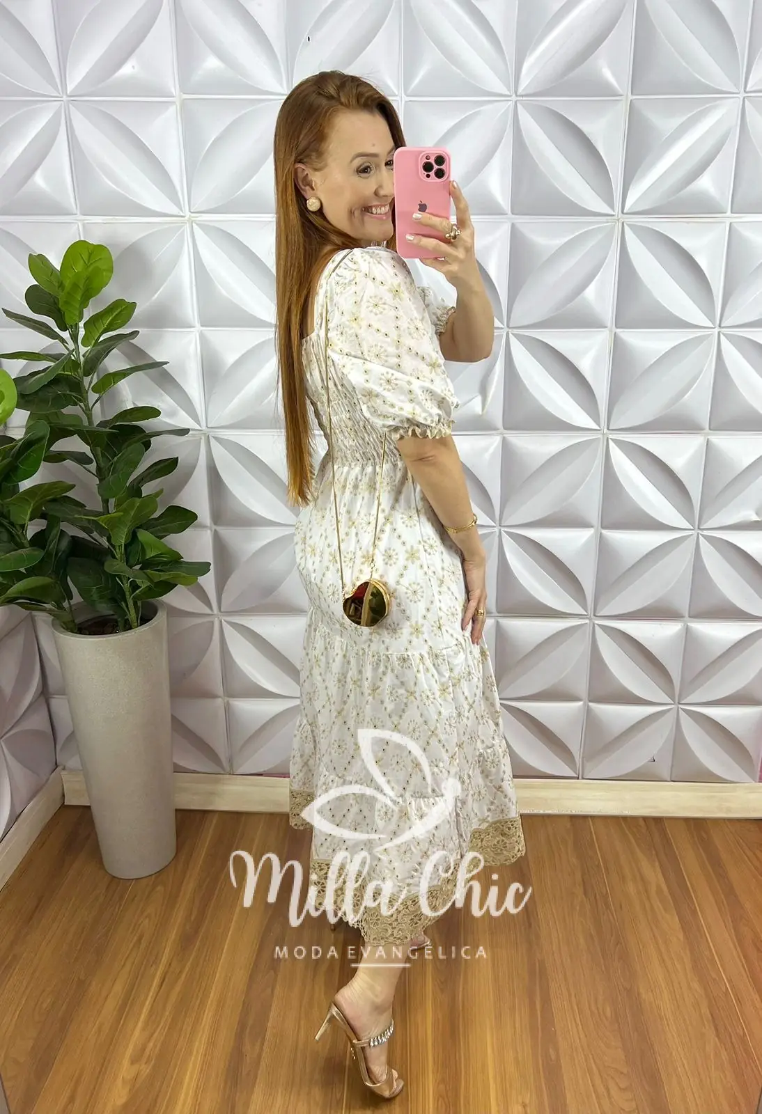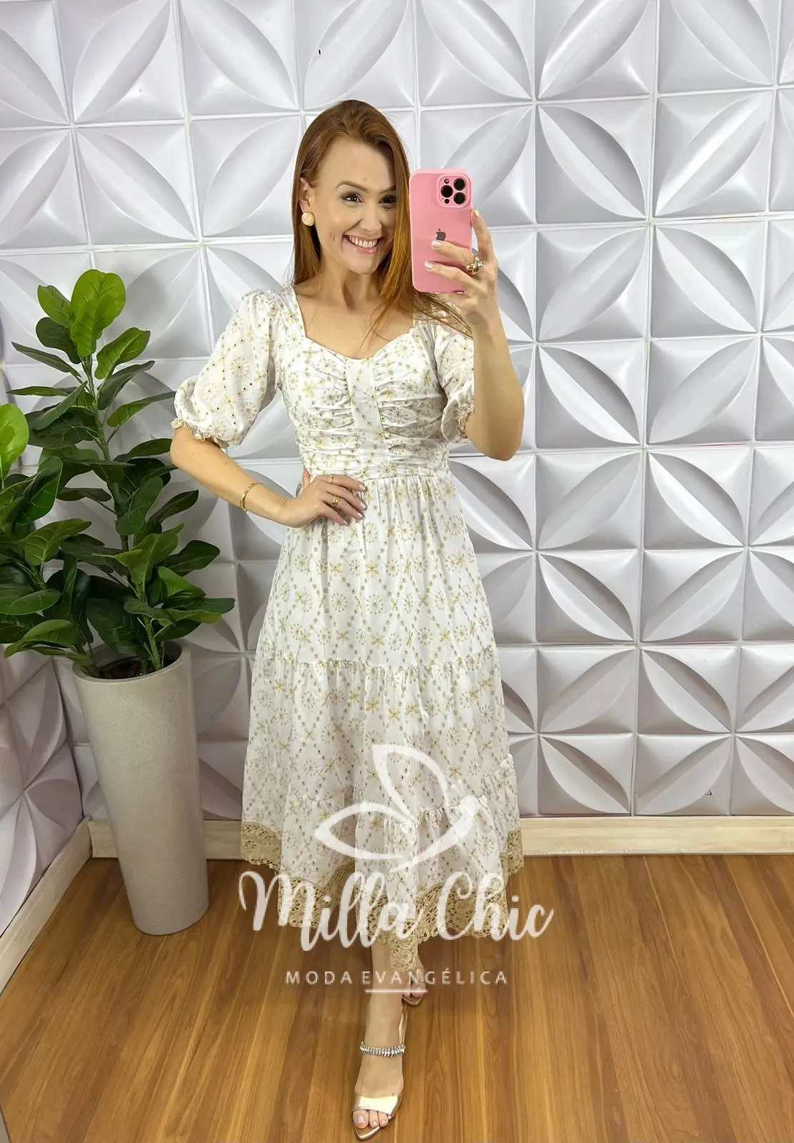 Possui: Decote Coração, pala no centro com drapeados envolta do busto, Mangas princesa com lastex na barra, cintura marcada e lastex nas costas, comprimento Mídi com marias, caimento evase, forrado.