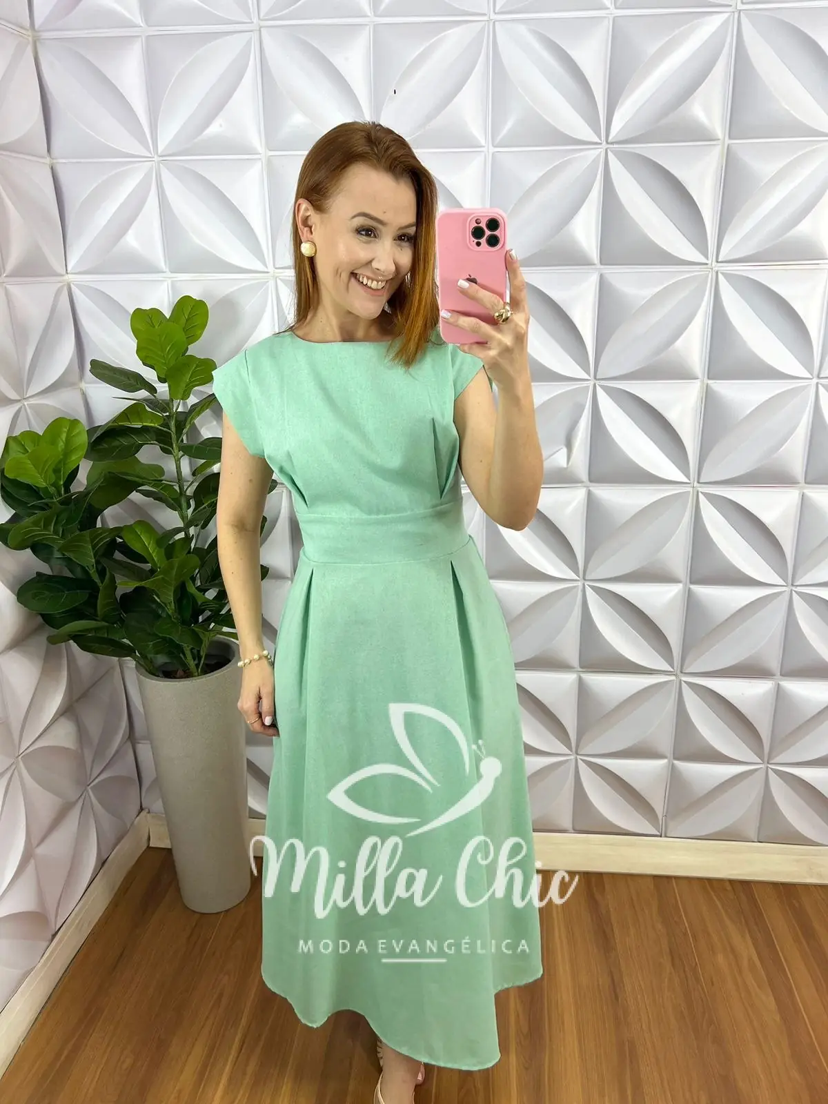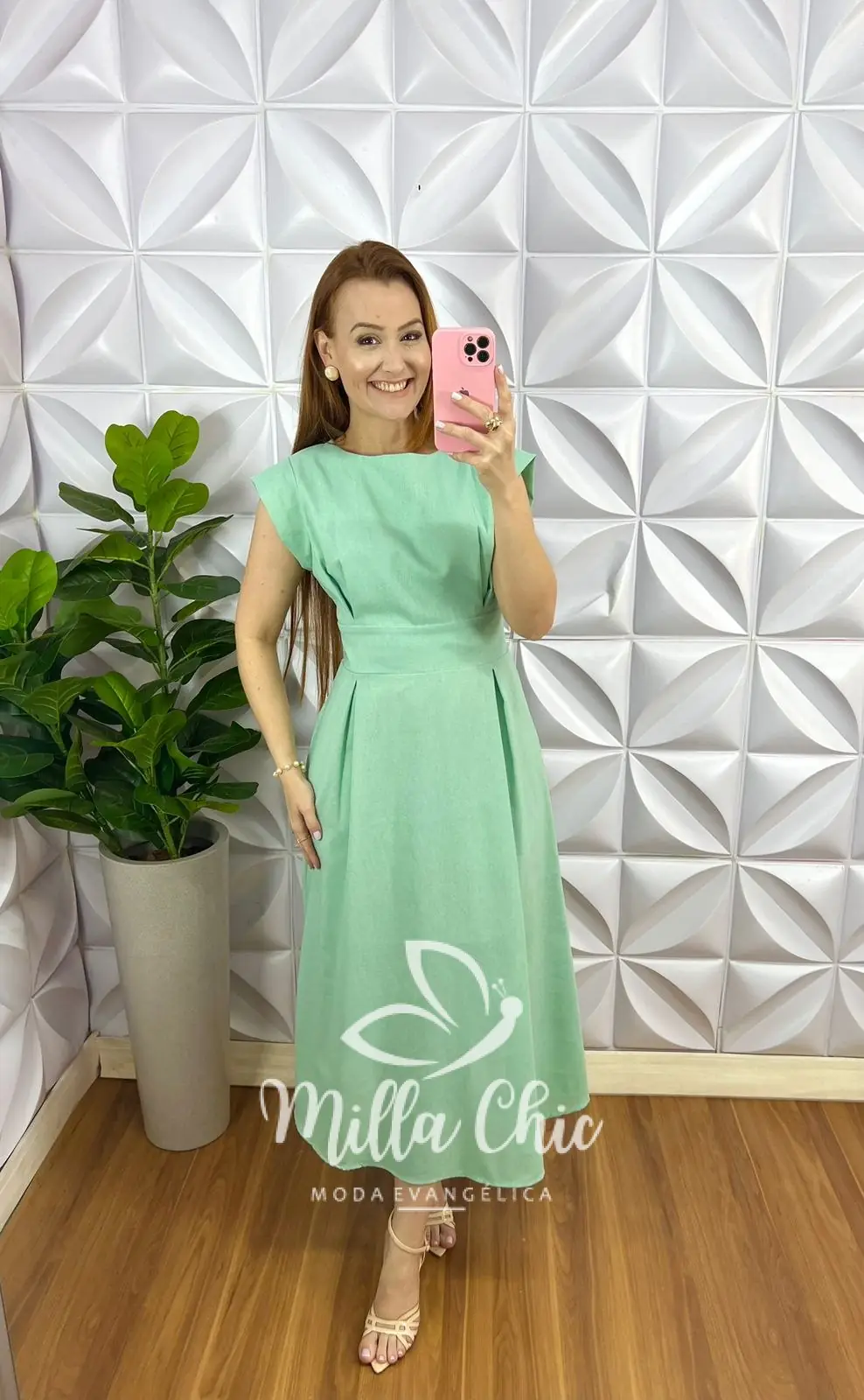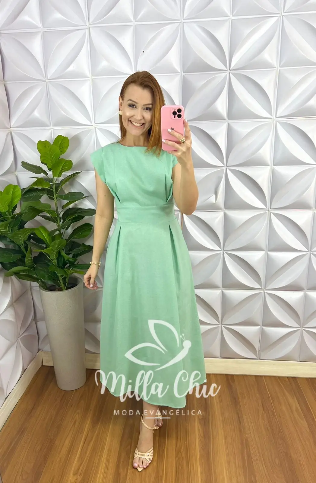 Vestido Linhão Mídi Com Pregas E Lastex Luna – Verde Menta
