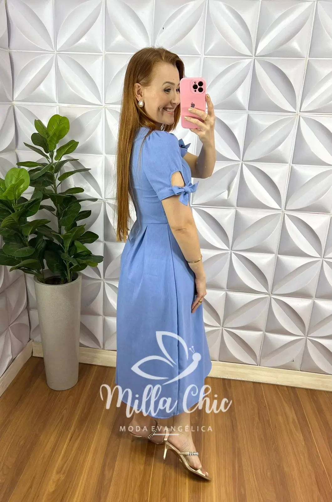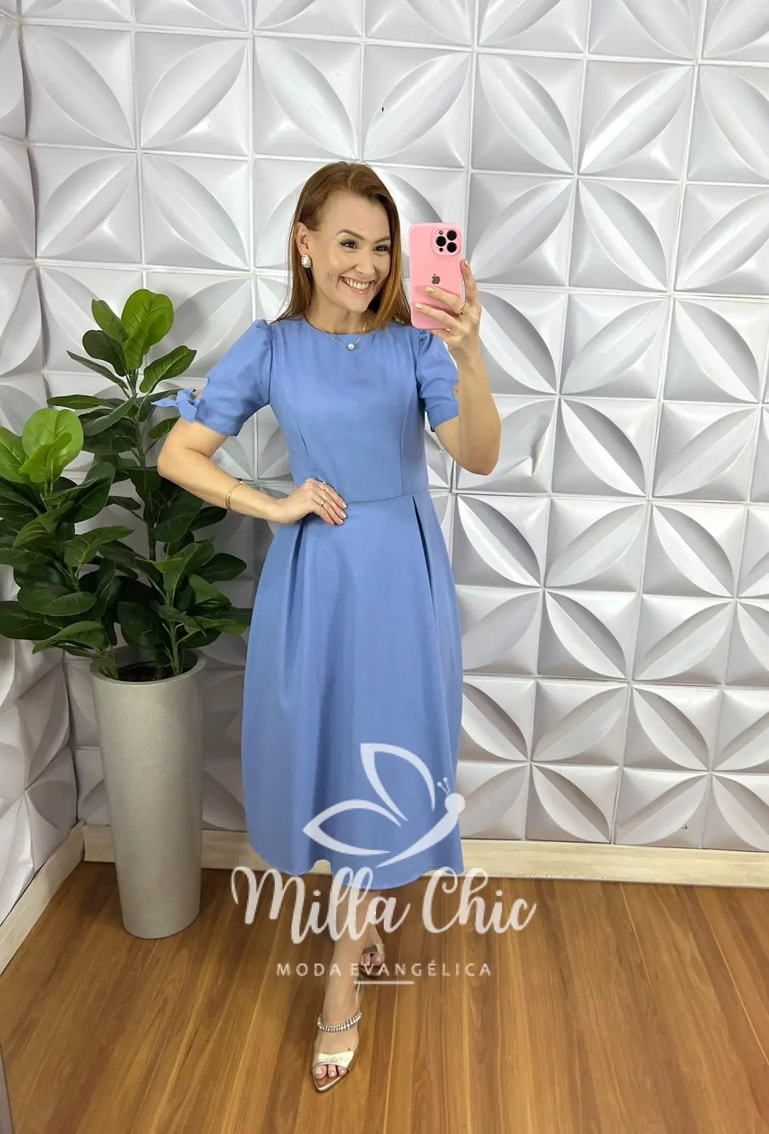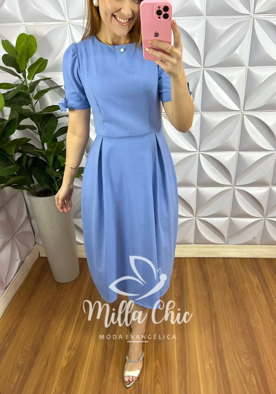 Vestido Linho Godê Mídi Com Manga Princesa Carmem – Azul