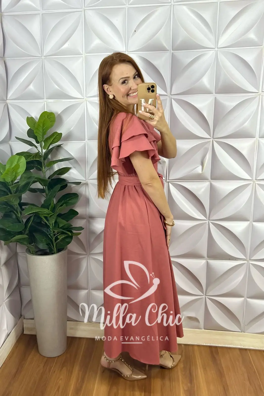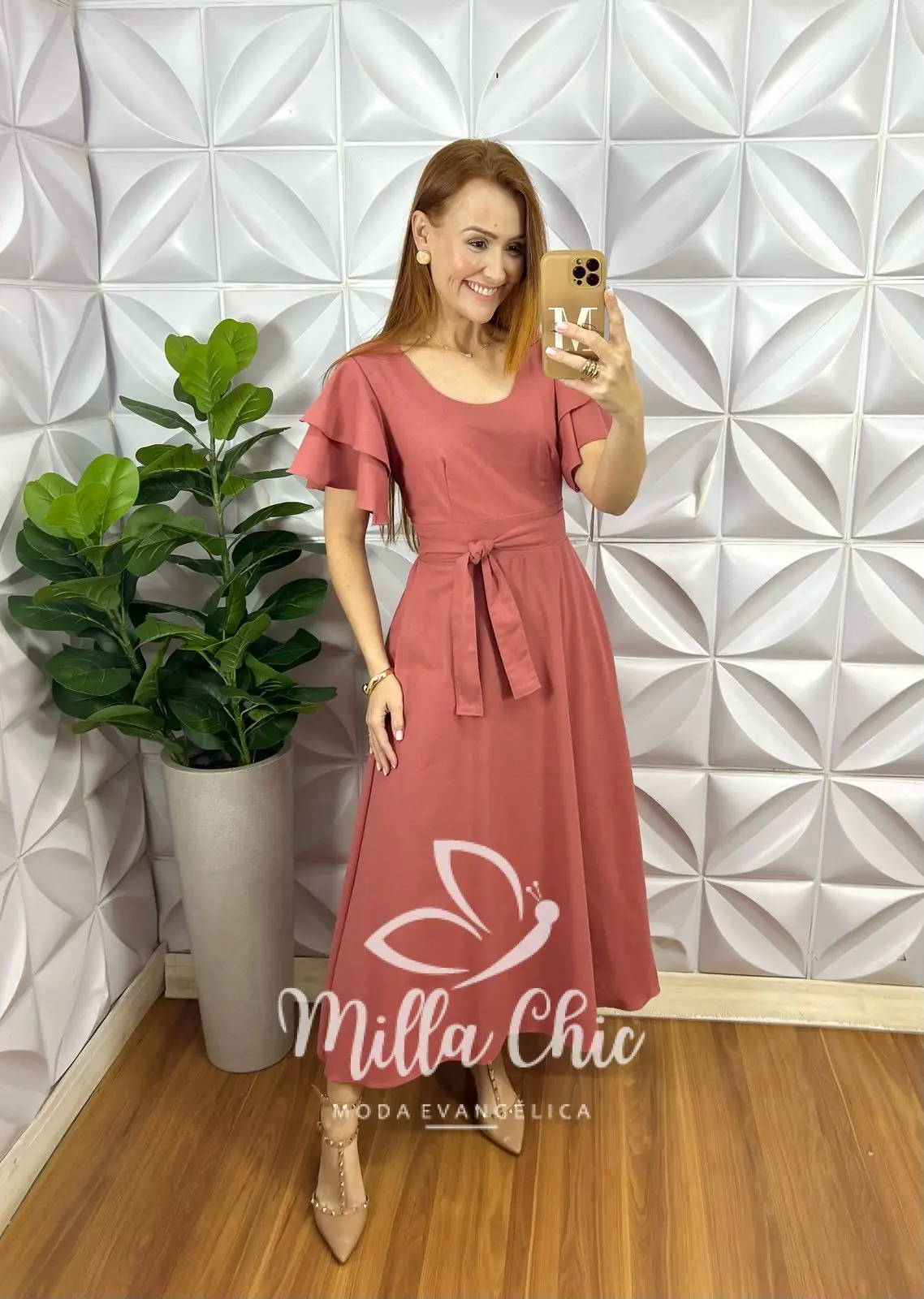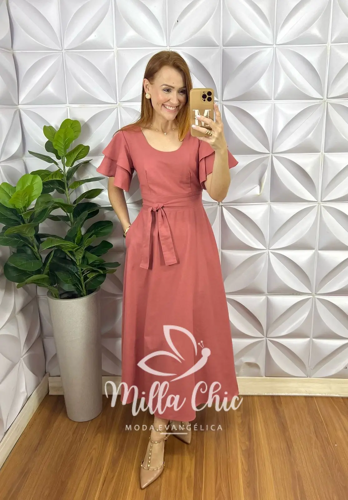 Esse é o vestido Inês . Chic e autêntico . O diferencial dele são as mangas babado , decote redondo e o cinto faixa para acinturar .