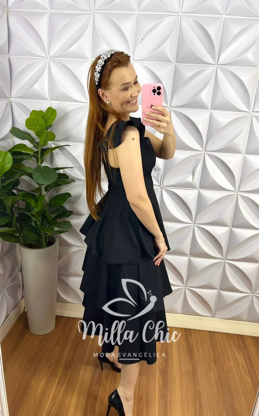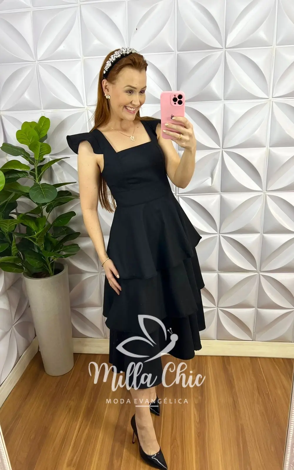 Vestido Linho Mídi Três Marias Manga Babadinho Thaisa - Preto - Milla Chic