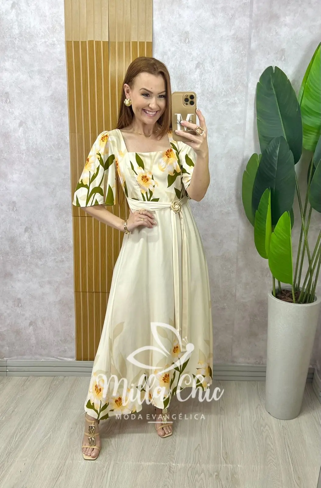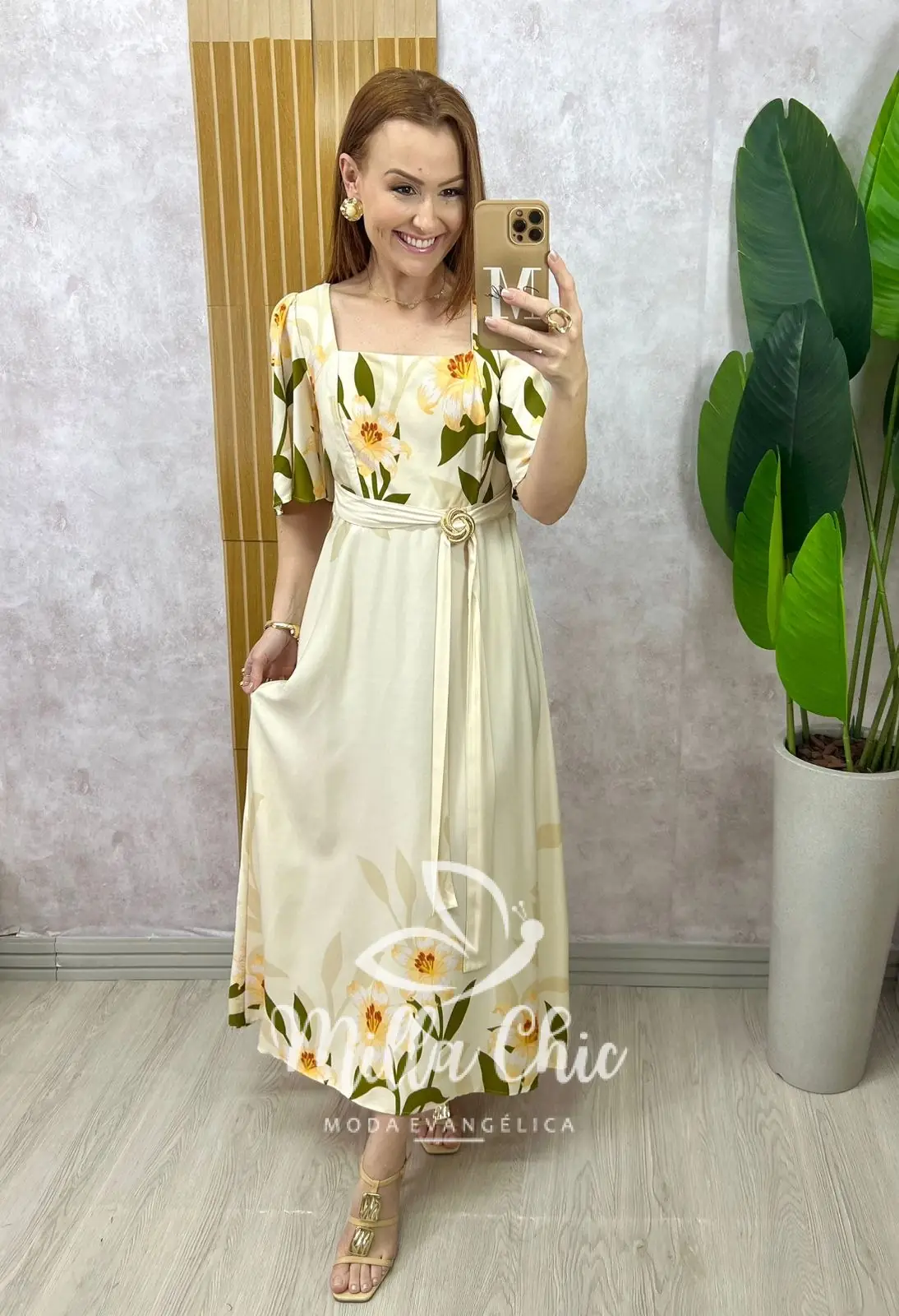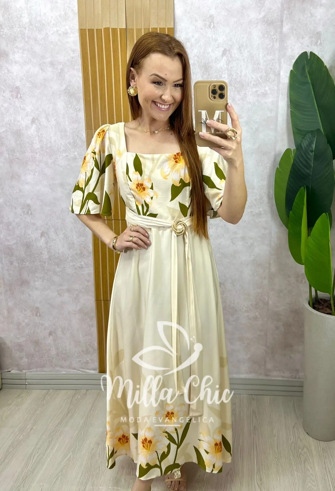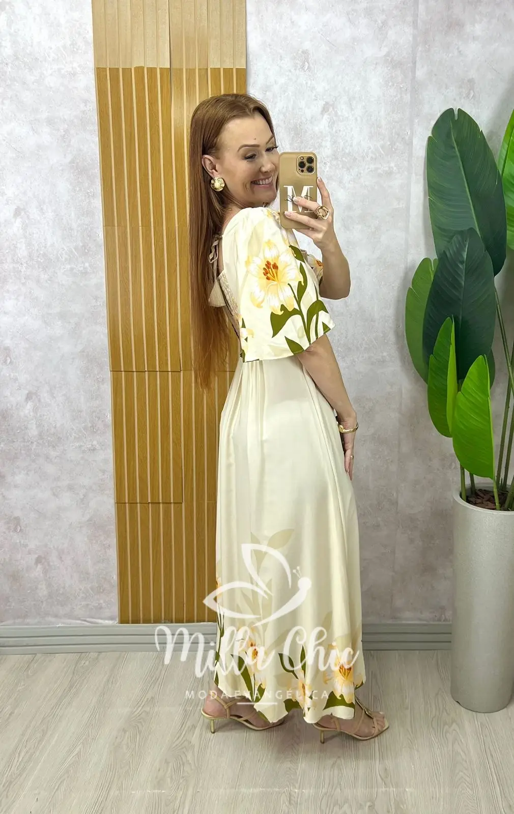 Vestido Lírio  em viscosarja - natural estampado - Milla Chic