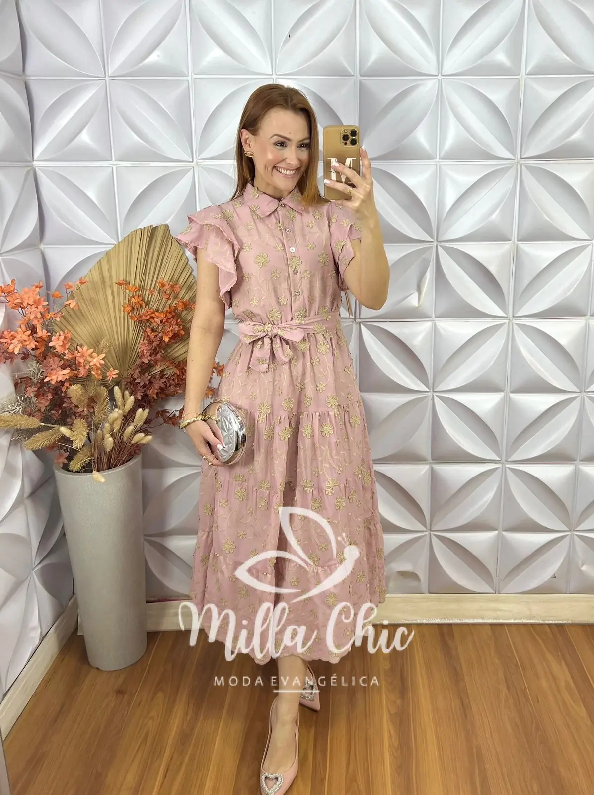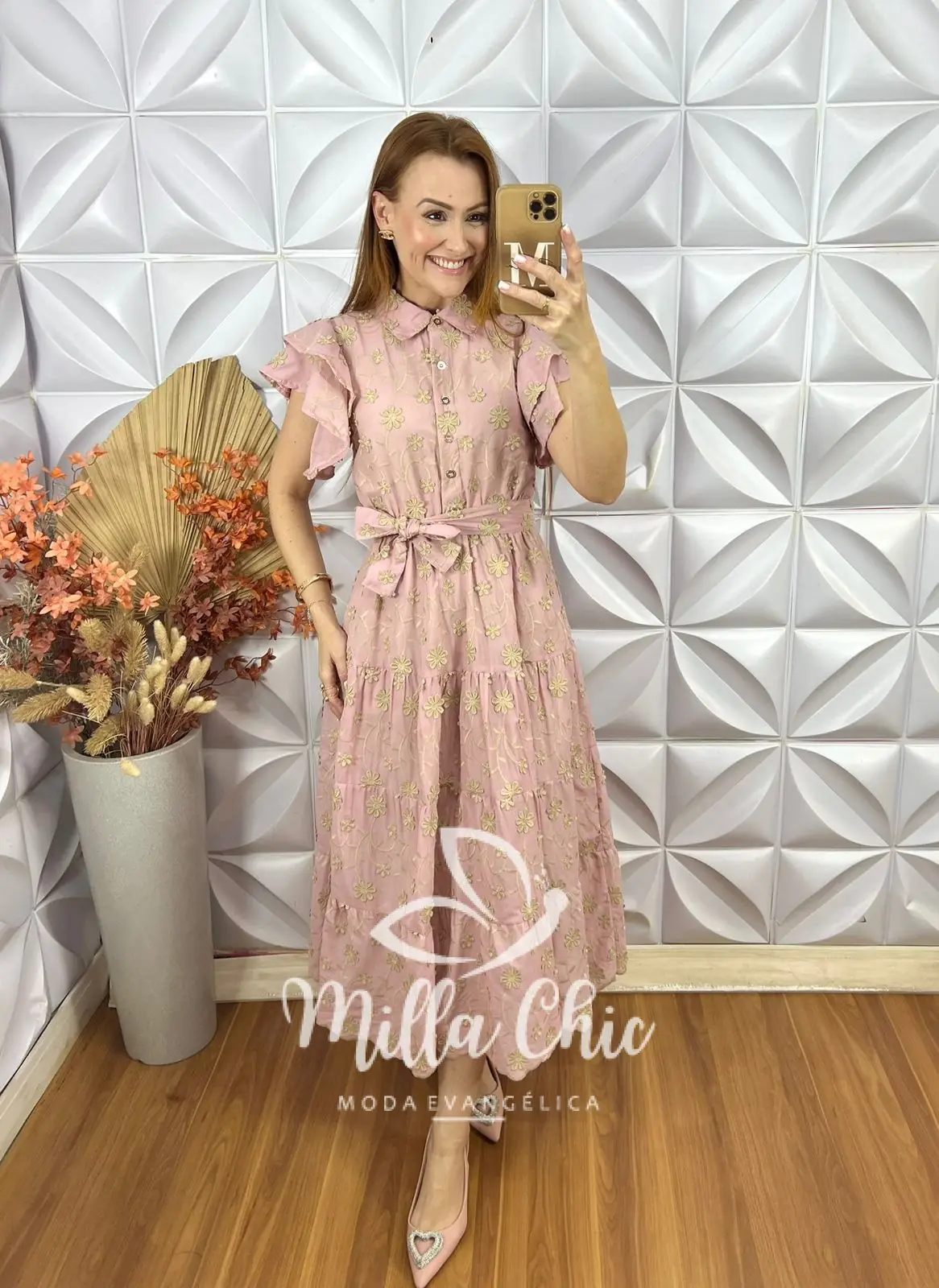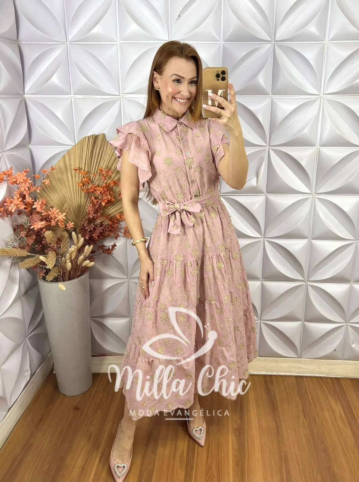 Um clássico romântico . Botões dourados funcionais , acompanha a faixa cinto que dá aquela acinturada , a manga tem os babados que transmite modernidade e leveza . As saias são em marias que dão aquele movimento lindo e solto .