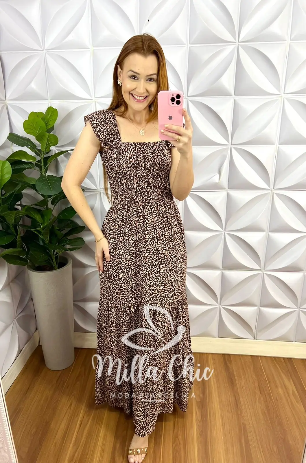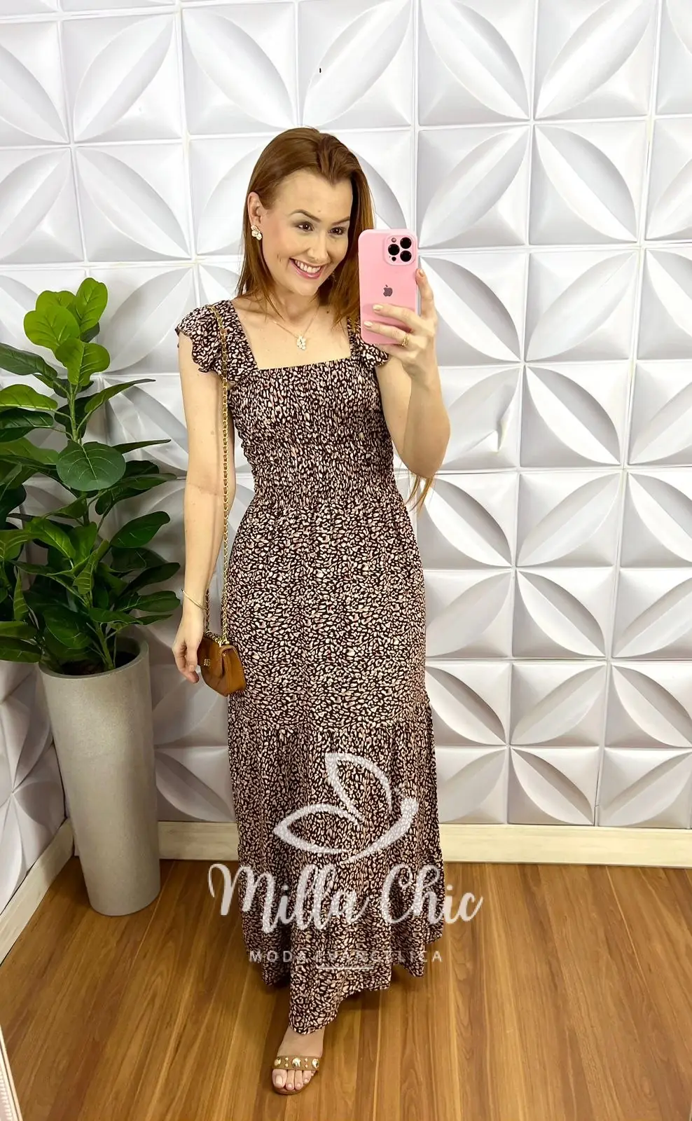 vem com o corpinho todo no Lastex vestindo super bem, decote quadrado, alças mais largas babadinho dando um charme a mais na peça, saia no comprimento longo com marias , todo estampado de oncinha!