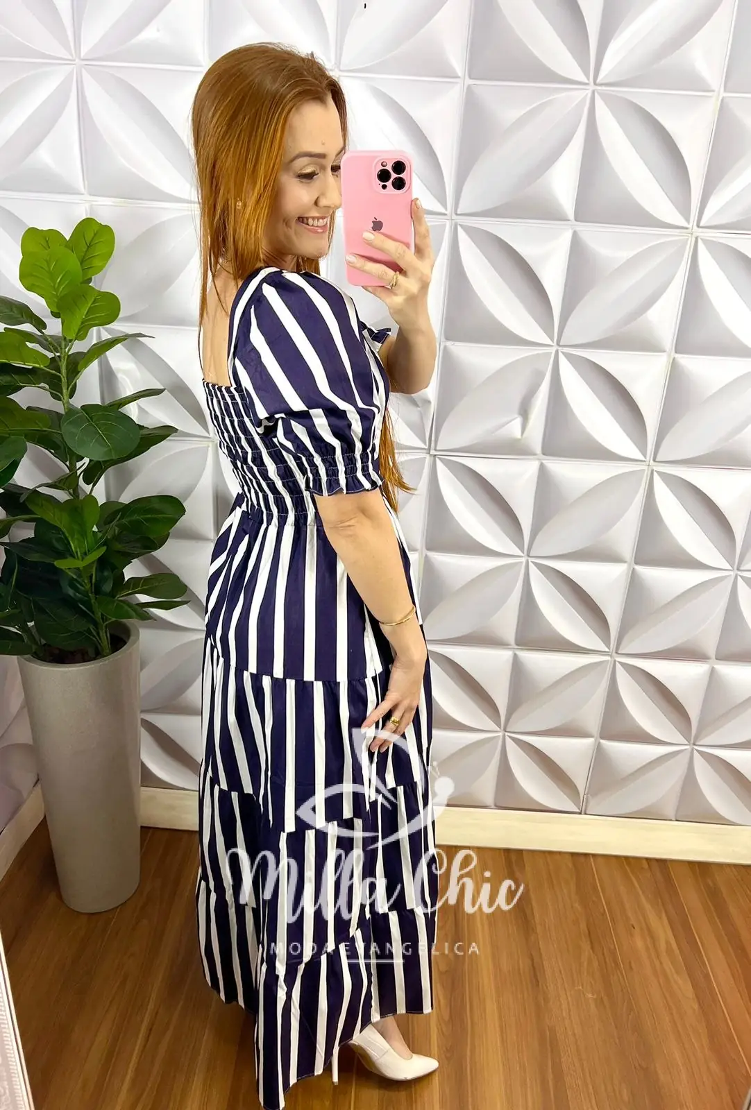Mangas princesa com elastico e babadinho na barra, pala na cintura com as listras horizontal para deixar cinturado, lastex nas costas para vestir bem, comprimento longo com marias.