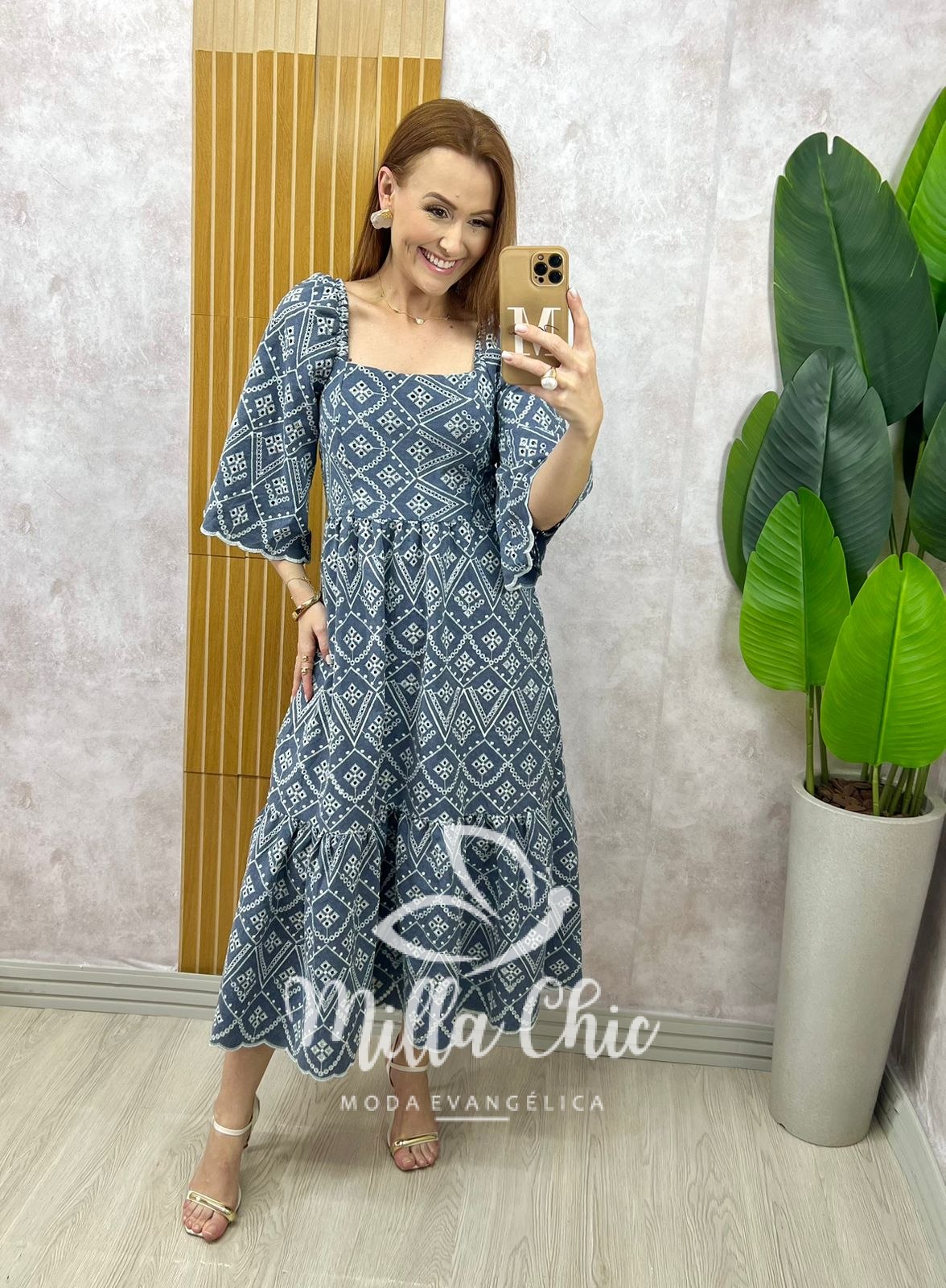 O vestido Luana tem esse tecido jeans todo bordado que transmite elegância e autenticidade. Ele apresenta um design midi possui elastex nas costas que valoriza a silhueta feminina, proporcionando um caimento perfeito. Ele une praticidade e charme, permitindo que você carregue estilo encantador.