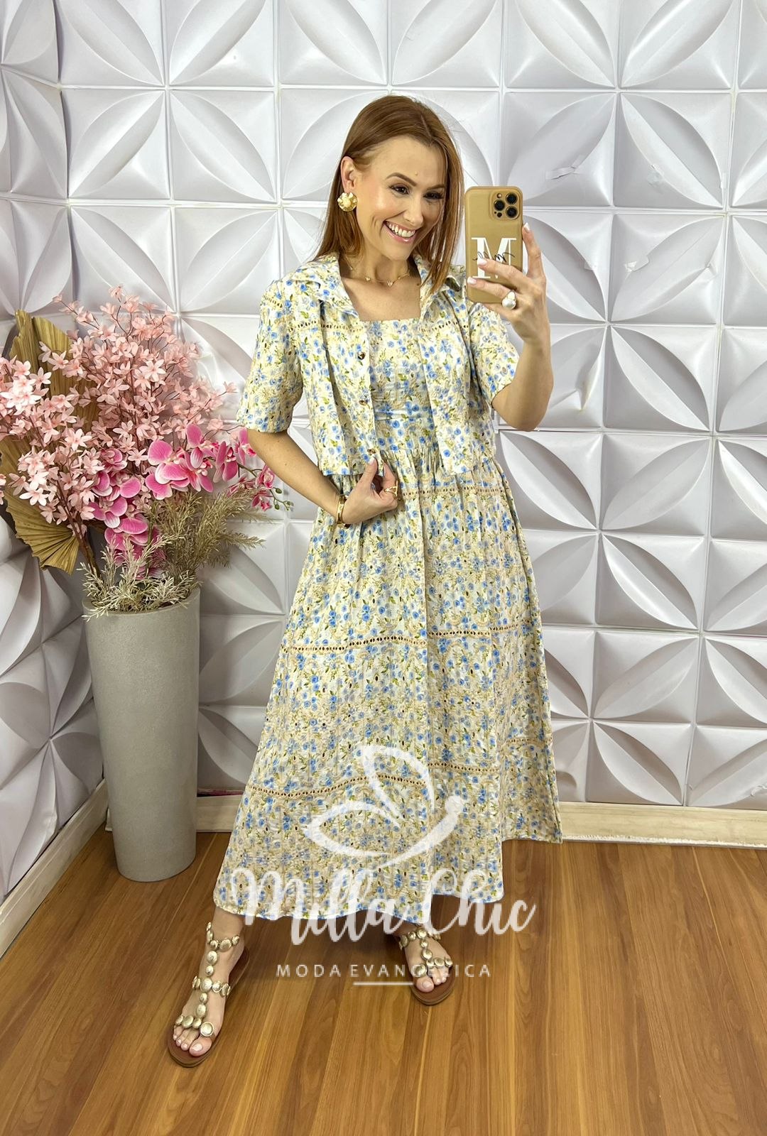 O conjunto de vestido com camisa se destaca pelo tecido maravilhoso com bordados e guipper.