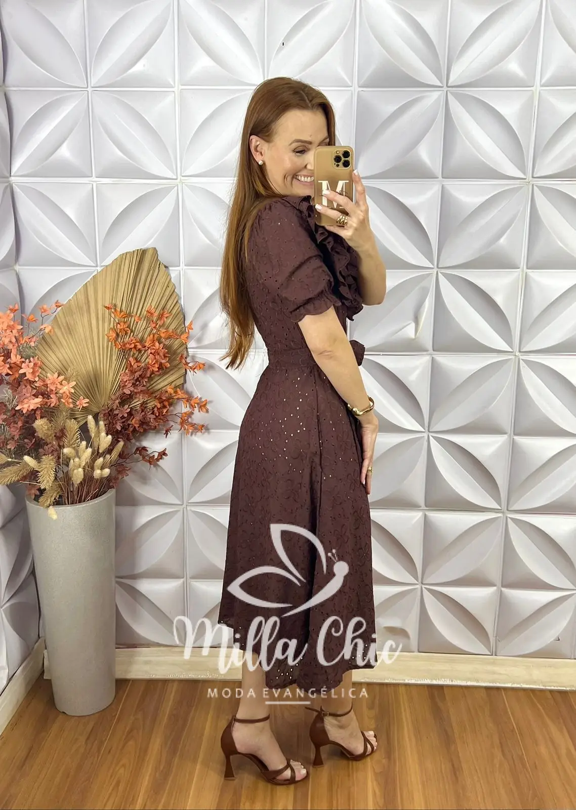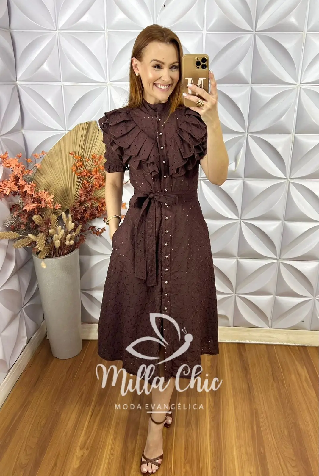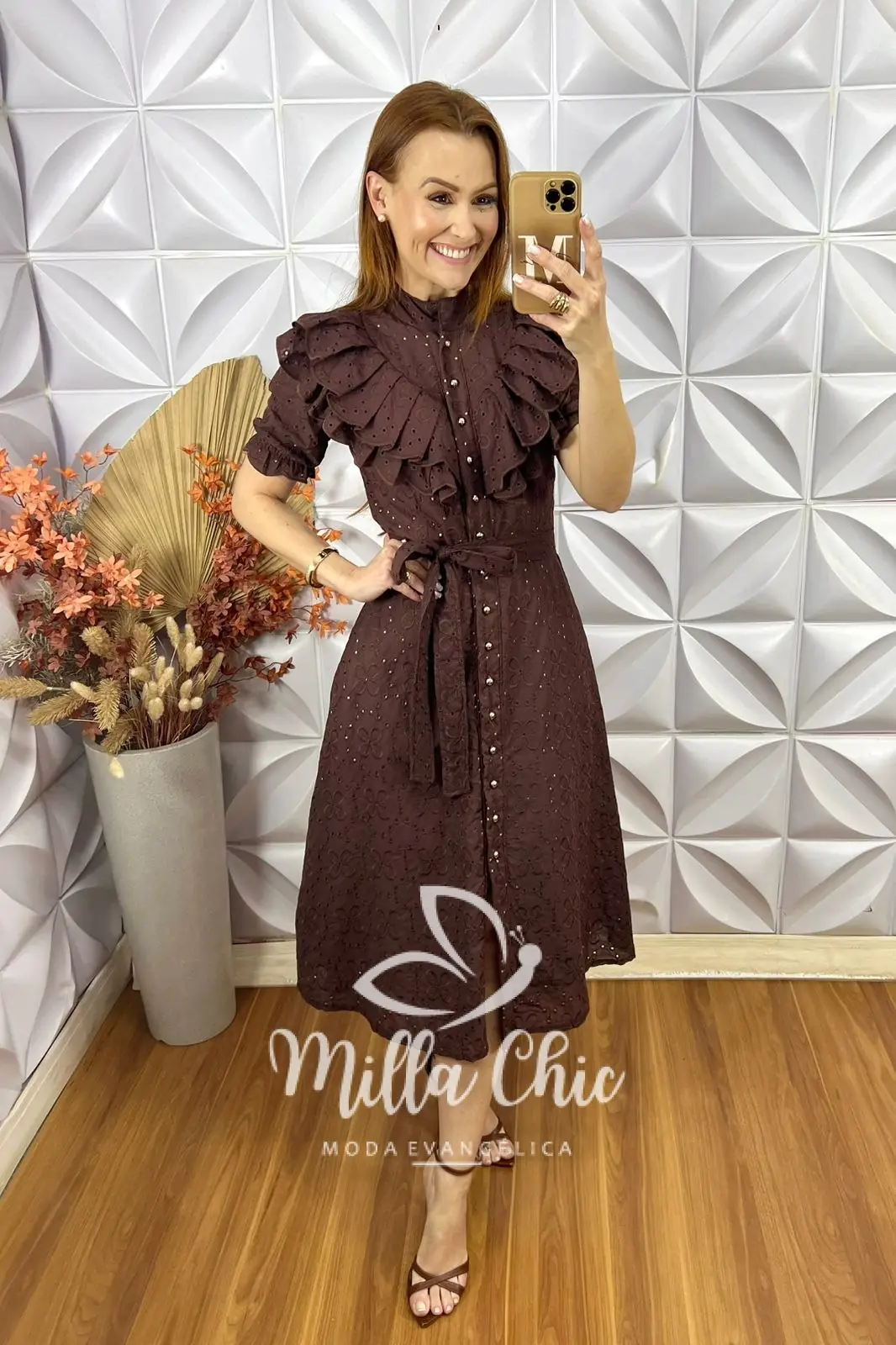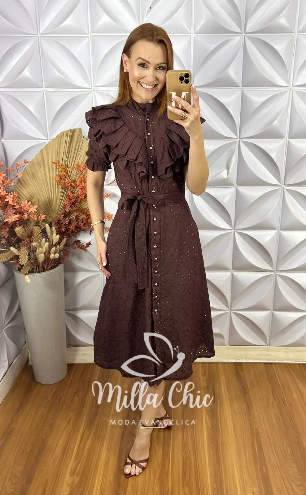 Um clássico romântico . Botões dourados funcionais , acompanha a faixa cinto que dá aquela acinturada , a manga tem os babados que transmite modernidade e leveza . O caimento da saia é evasê com um movimento lindo e solto .