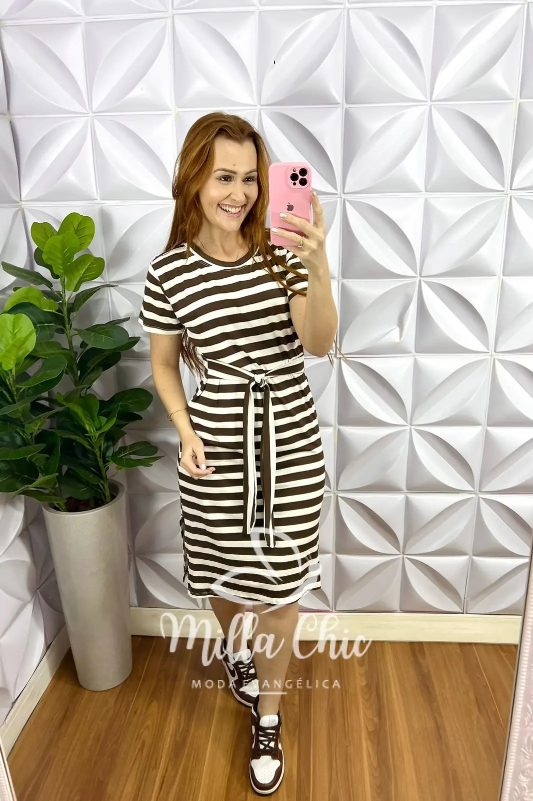Vestido Malha Listrado Com Cinto Faixa Franciele - Marrom - Milla Chic