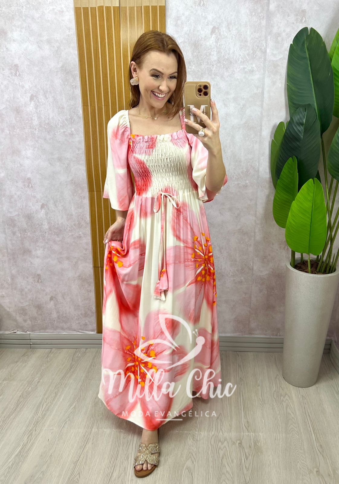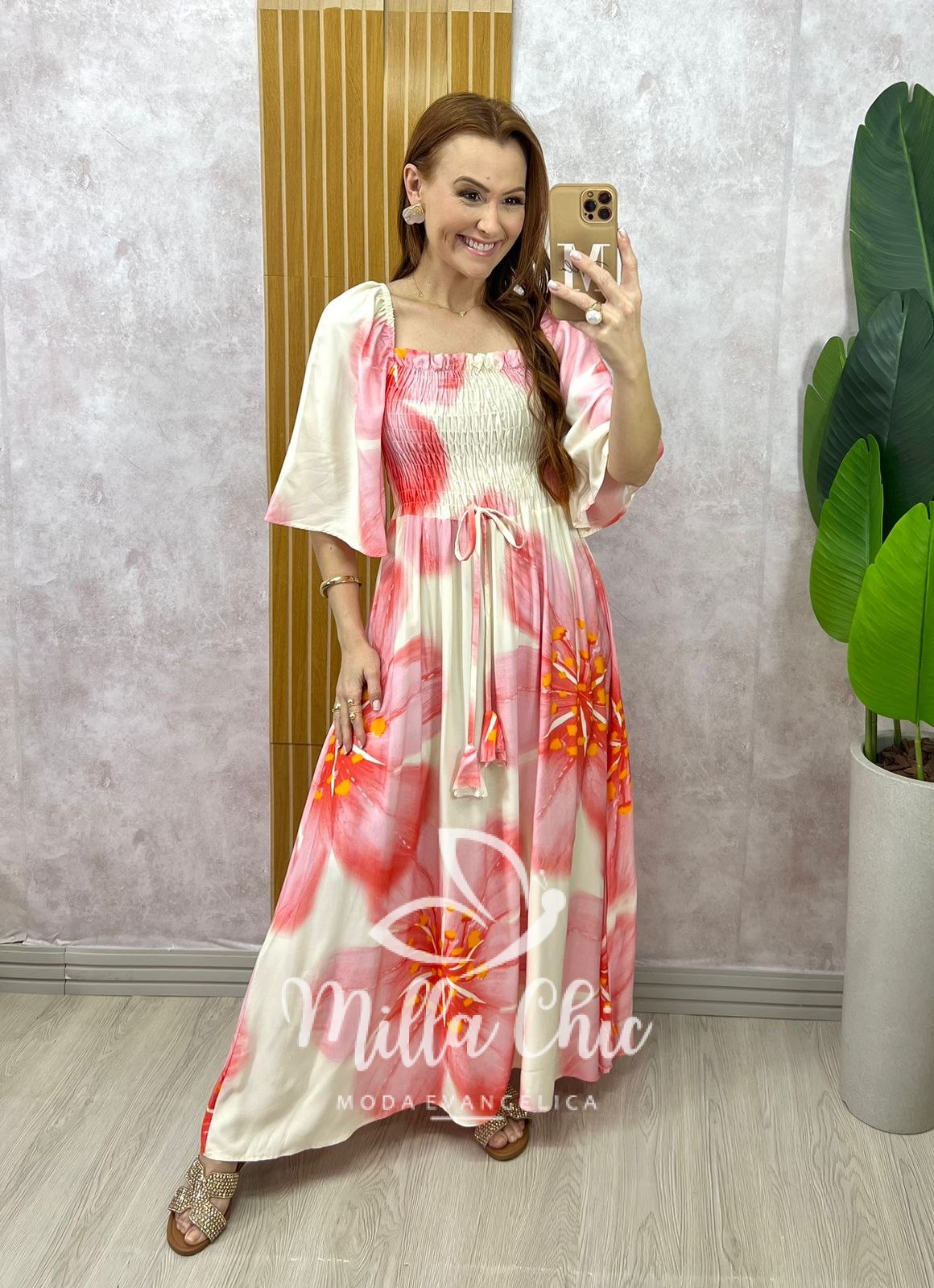 O vestido Mariana tem essa estampa linda e exclusiva verão que transmite elegância e autenticidade. Ele apresenta um design longo possui elastex em toda parte da blusa frontal e nas costas que valoriza a silhueta feminina, proporcionando um caimento perfeito. Ele une praticidade e charme, permitindo que você carregue estilo encantador.