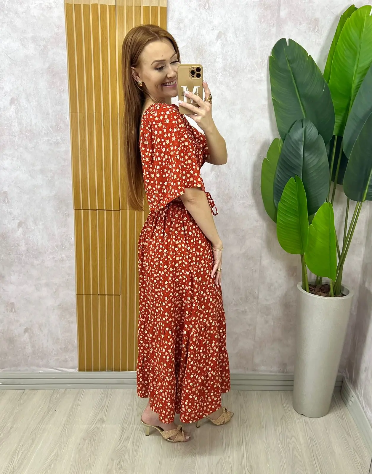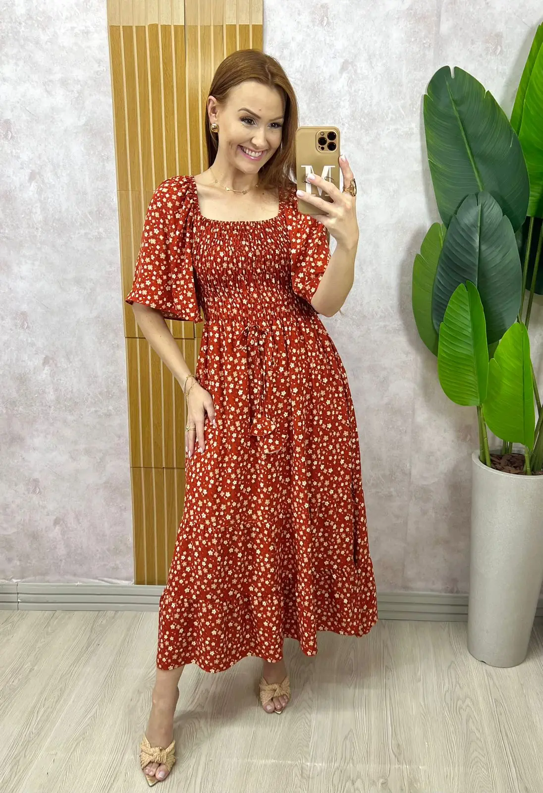 O vestido Melina apresenta um design mídi que fica lindo e a cintura fica bem marcada por conta do design do elástex na parte da blusa proporcionando um caimento perfeito.