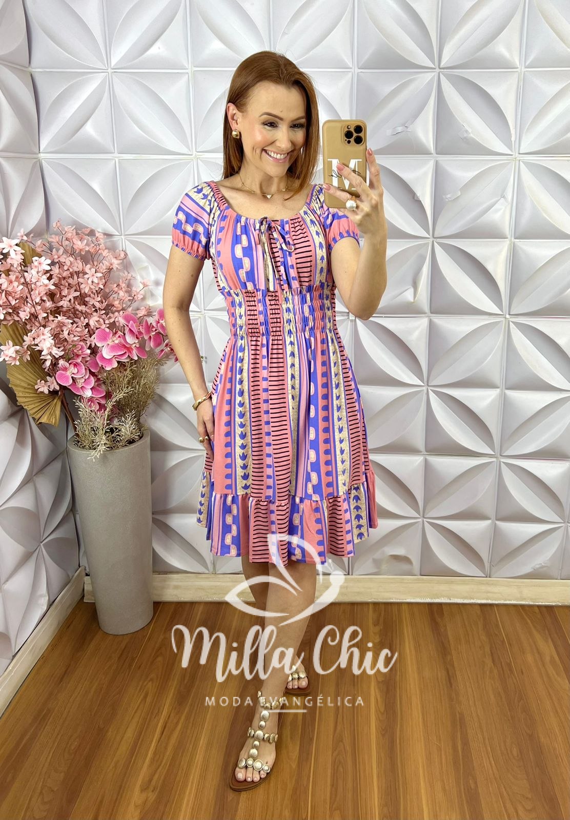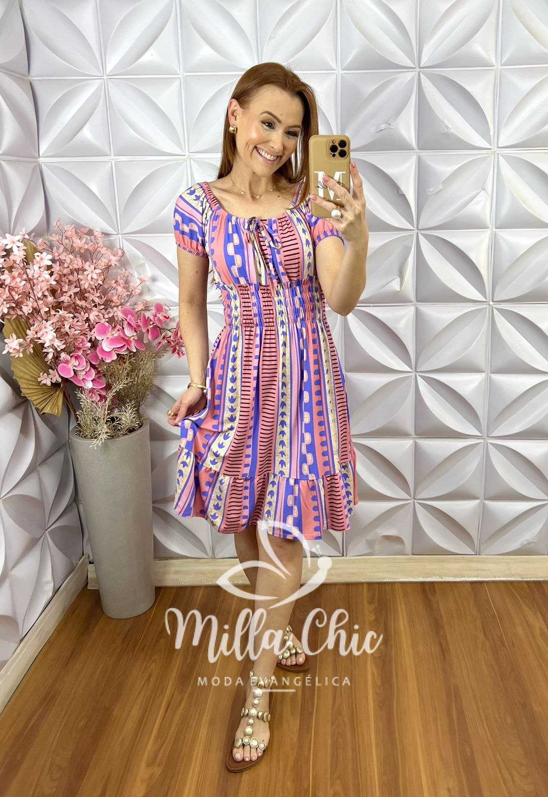 Ele tem a gola ciganinha muito confortável e elástico na cintura que deixa ele vestindo super bem. O caimento da saia é solto…