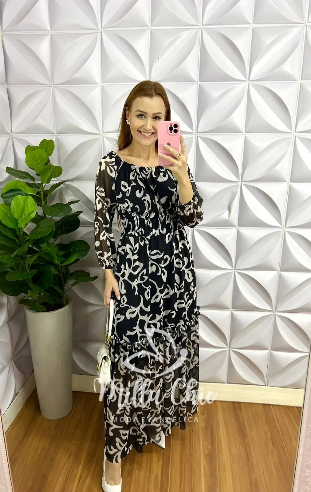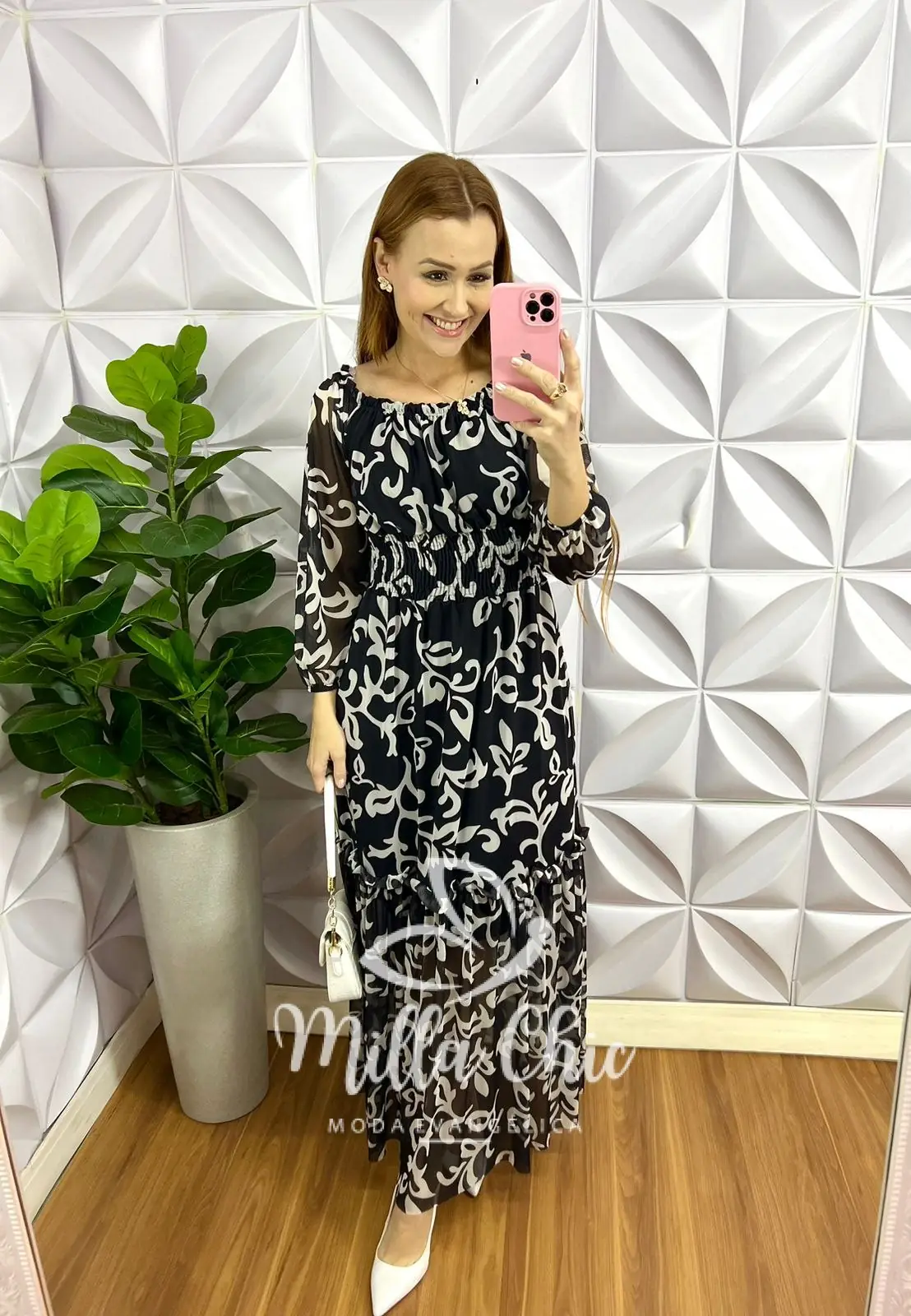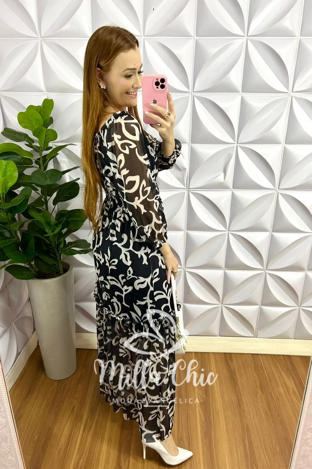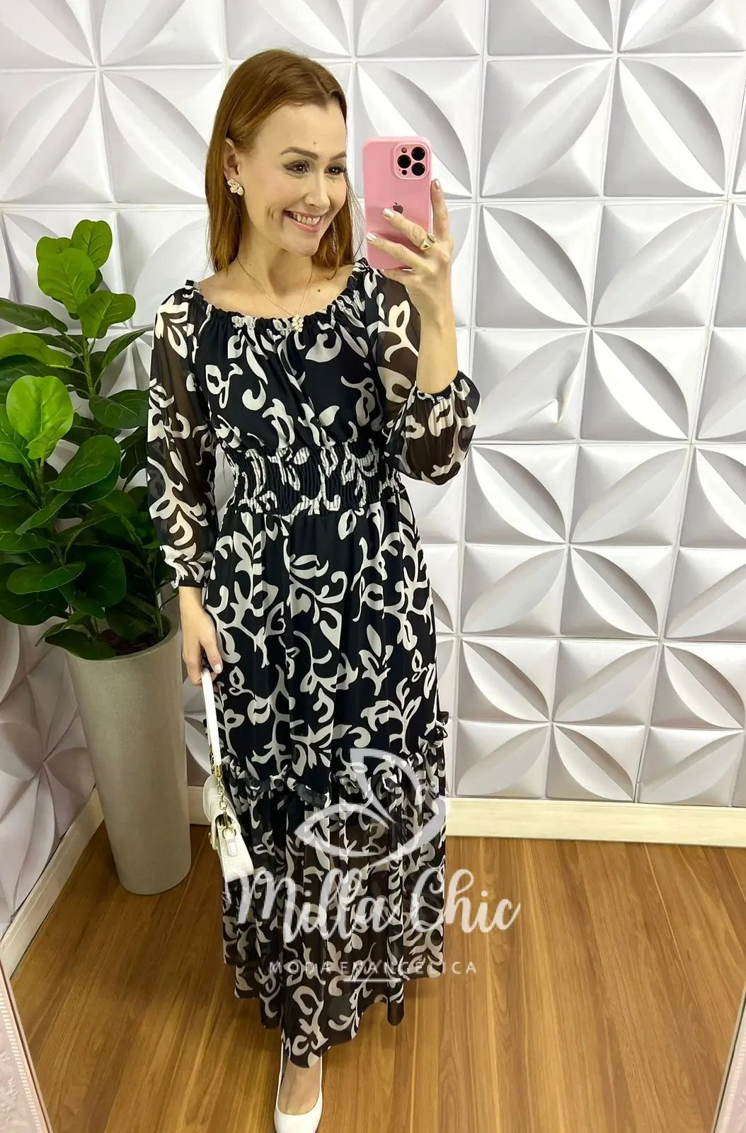Vestido Tule Manga Longa Pala De Lastex Na Cintura Longo Duas Marias Vania - Preto - Milla Chic
