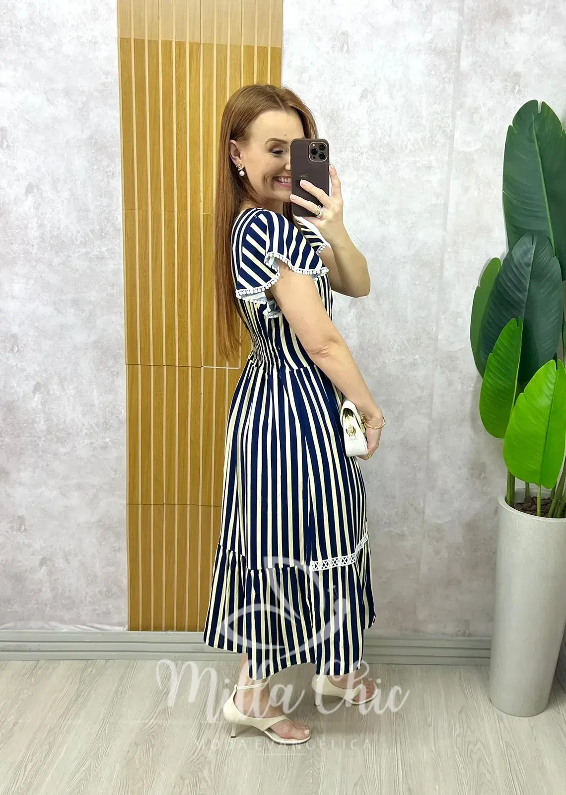 Confeccionado em viscolinho . Esse tecido é leve , fresco e muito confortável . Os detalhes que chamam atenção e dão aquele toque de elegância e sofisticação são os detalhes em guipper nas mangas e na saia .