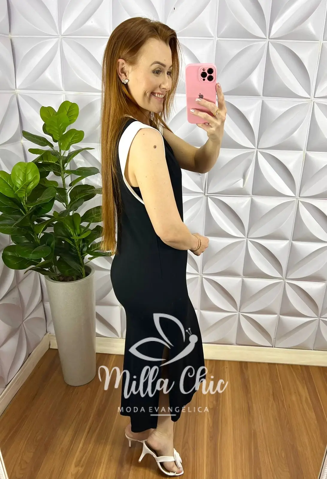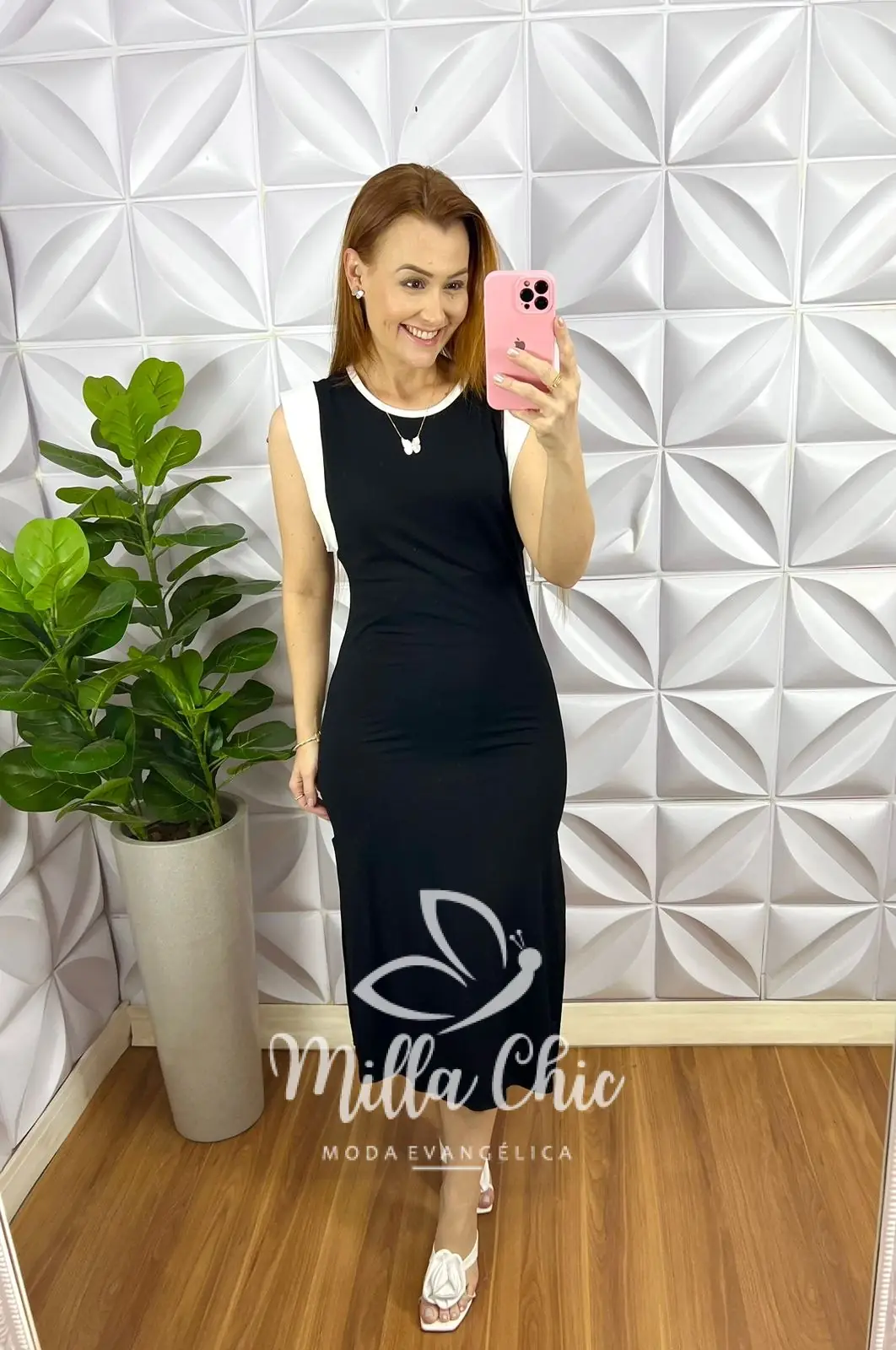Possui: Decote canoa, Manga Musclee bicolor que esta um charme, modelagem mais justinha com comprimento Mídi com fendas laterais que esta um charme! nao possui forro.