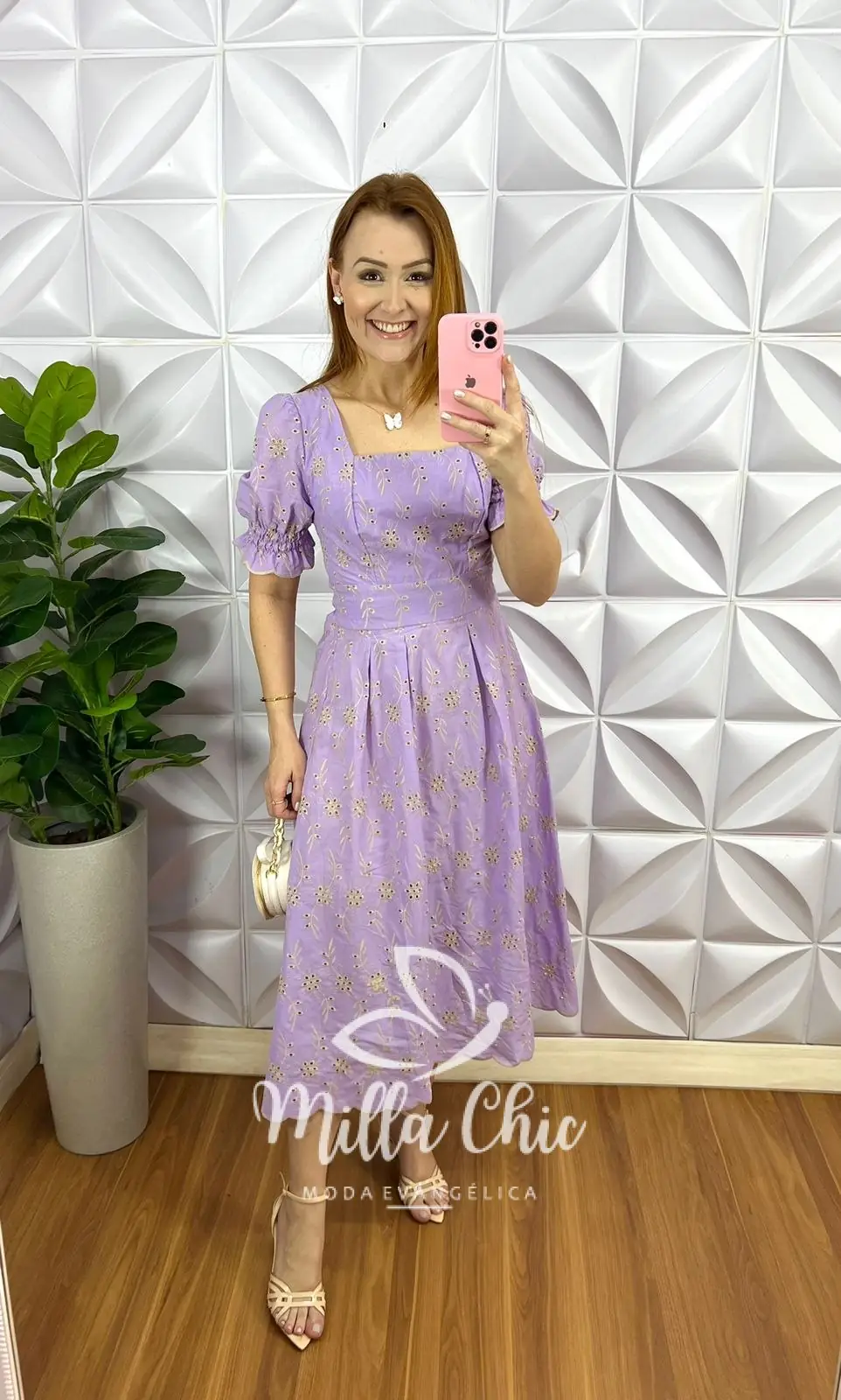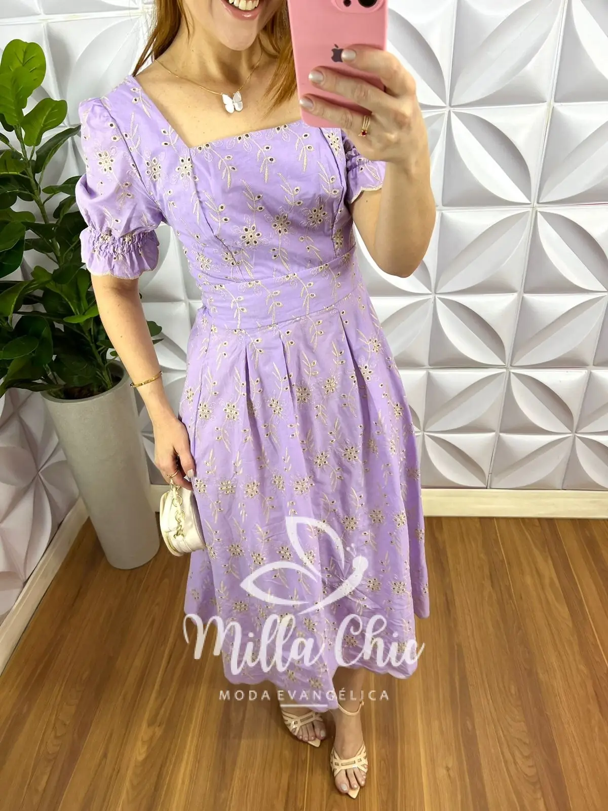 Vestido No Laíse De Algodão Bordado Mídi Liane - Lavanda - Milla Chic
