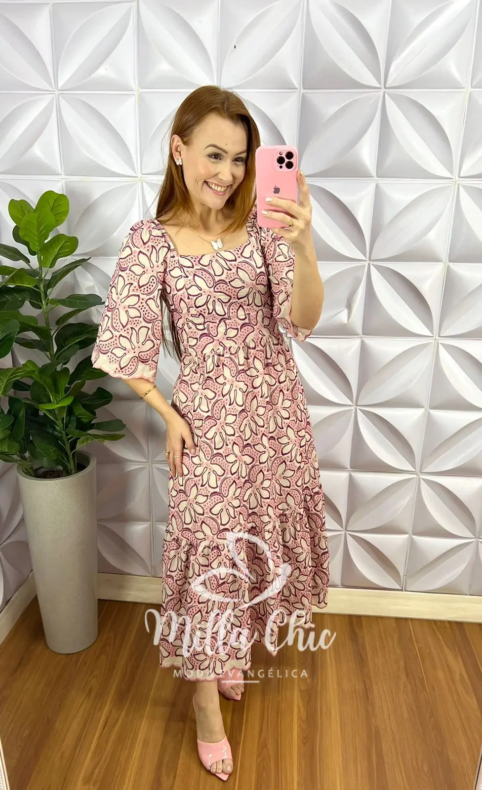 Vestido No Laíse De Algodão Manga Raglan Bordado Mídi Iris - Rosa - Milla Chic