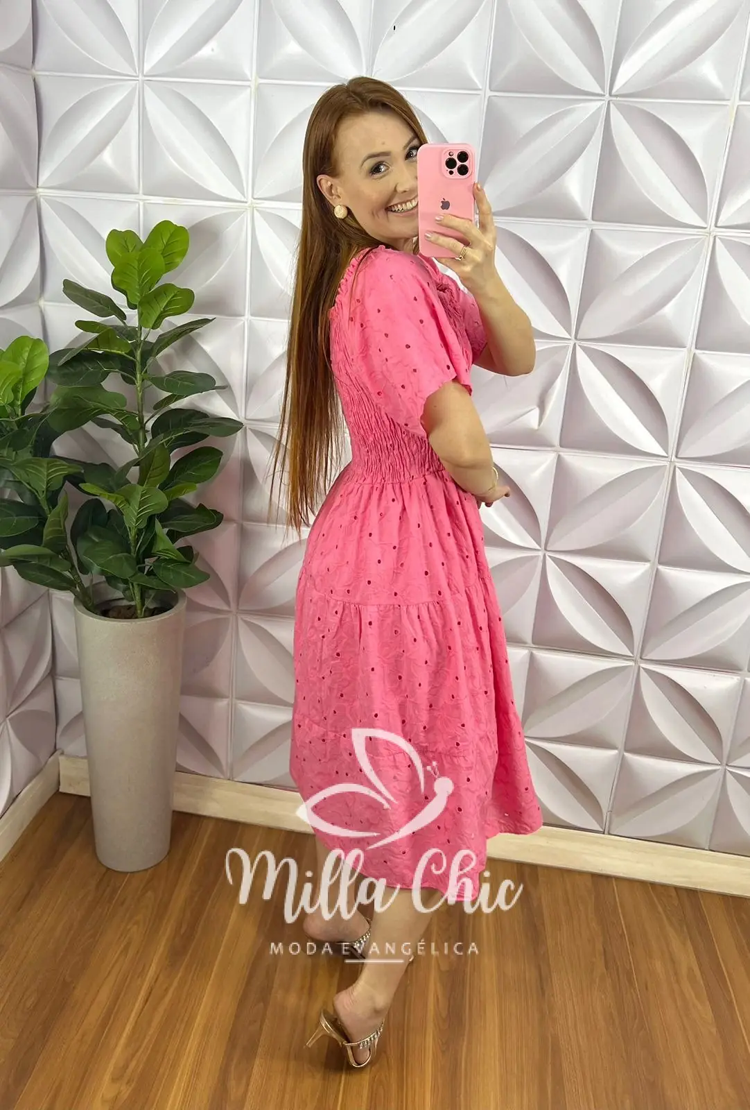 Vestido No Laíse De Algodão Mídi Manga Raglan Eduarda - Rosa - Milla Chic