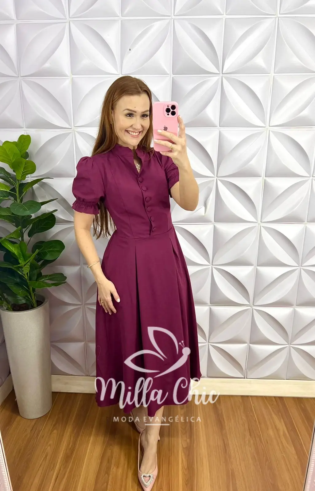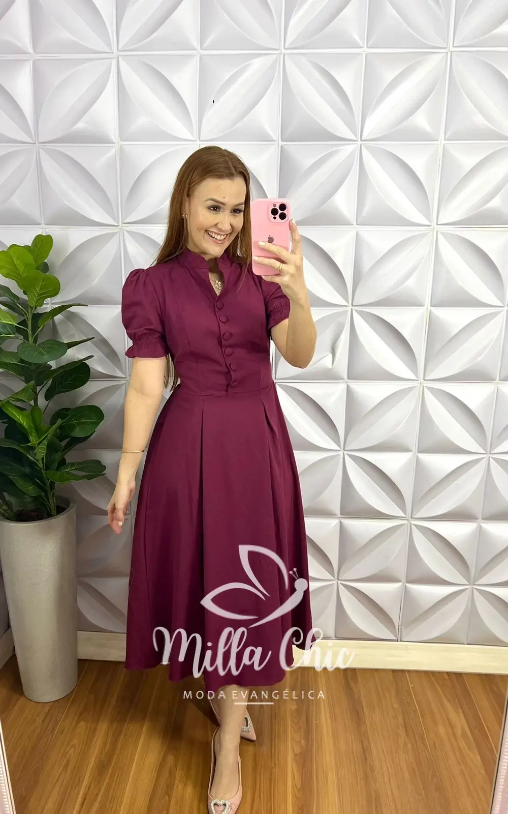 O Busto com gola padre, todo de botões encapados (funcional), recorte na blusa, manga princesa com elástico e babadinho na barra, com lastex na cintura na parte de trás vestindo super bem, caimento evase, comprimento mídi com detalhe de pregas, forrada.