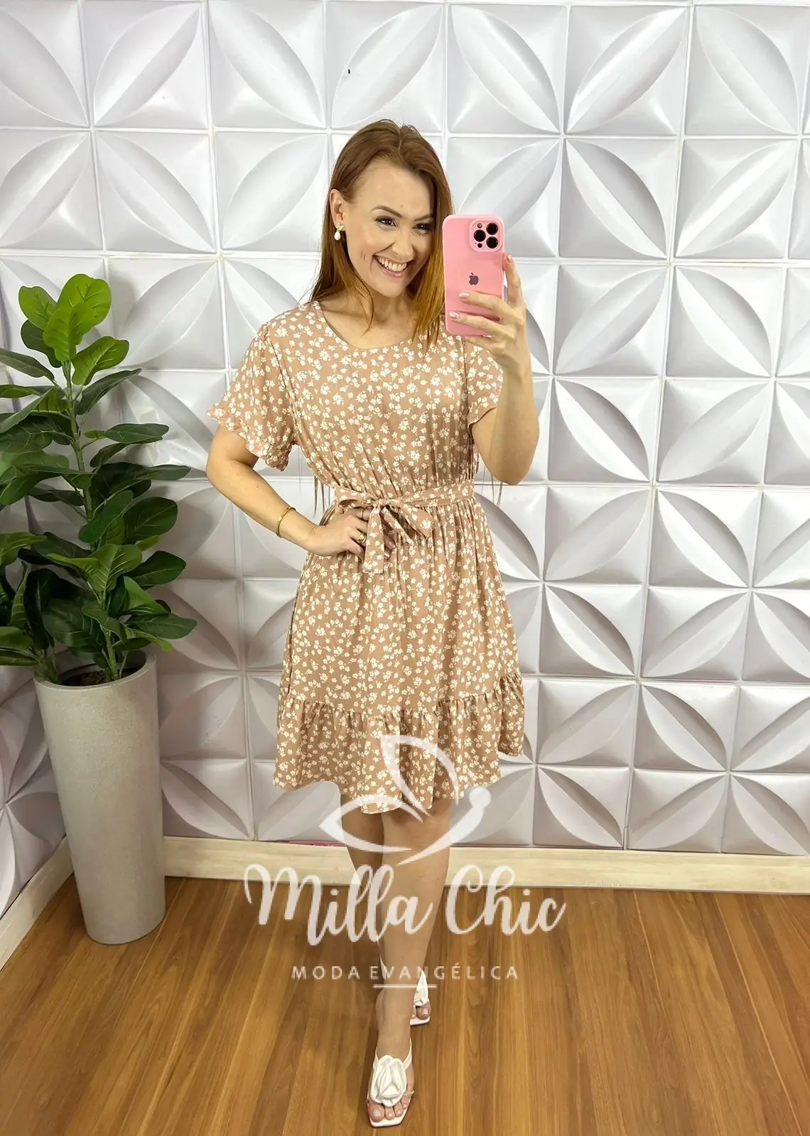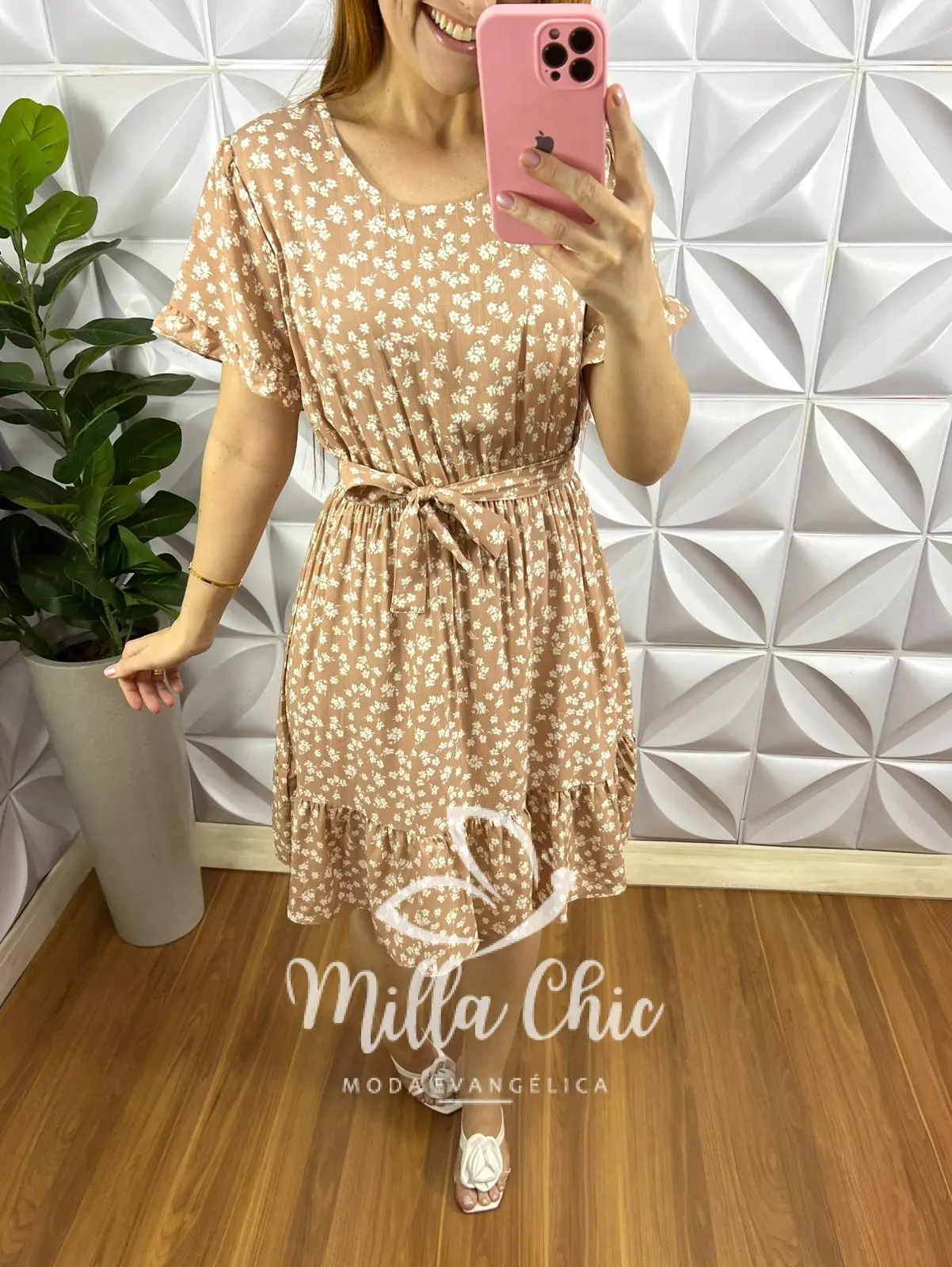 Vestido No Viscolinho Curto Manga Com Faixa Cinto Estampado Katia – Areia