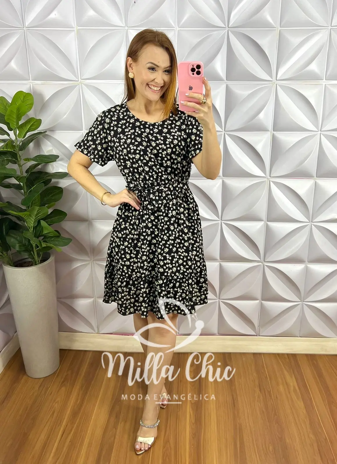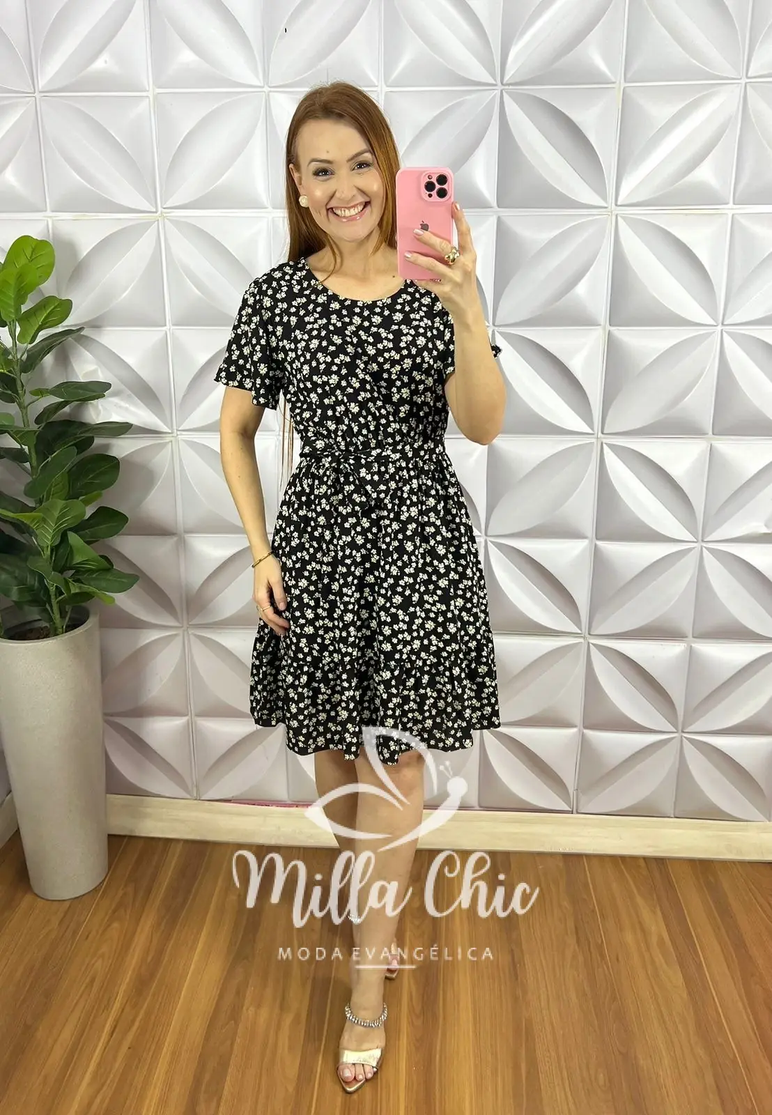 Vestido No Viscolinho Curto Manga Com Faixa Cinto Estampado Katia – Preto