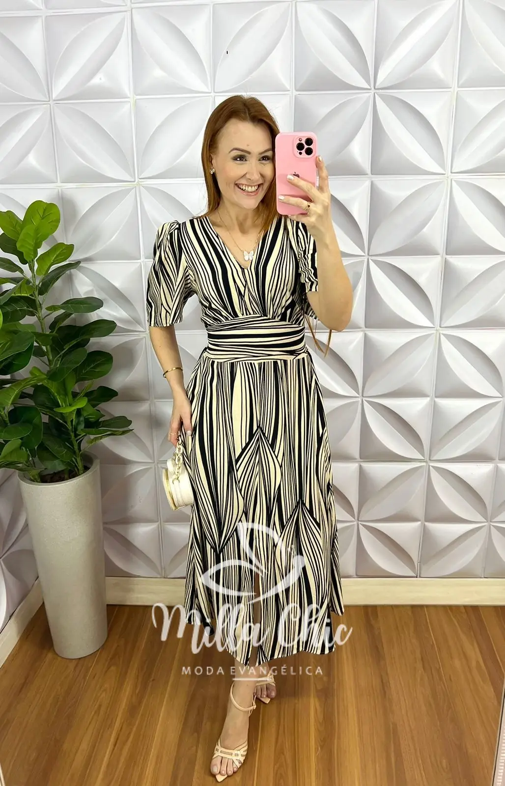 Possui: Decote V, lastex nas costas, manga larguinha, comprimento mídi, caimento evasê, fenda lateral. Forrado na saia.