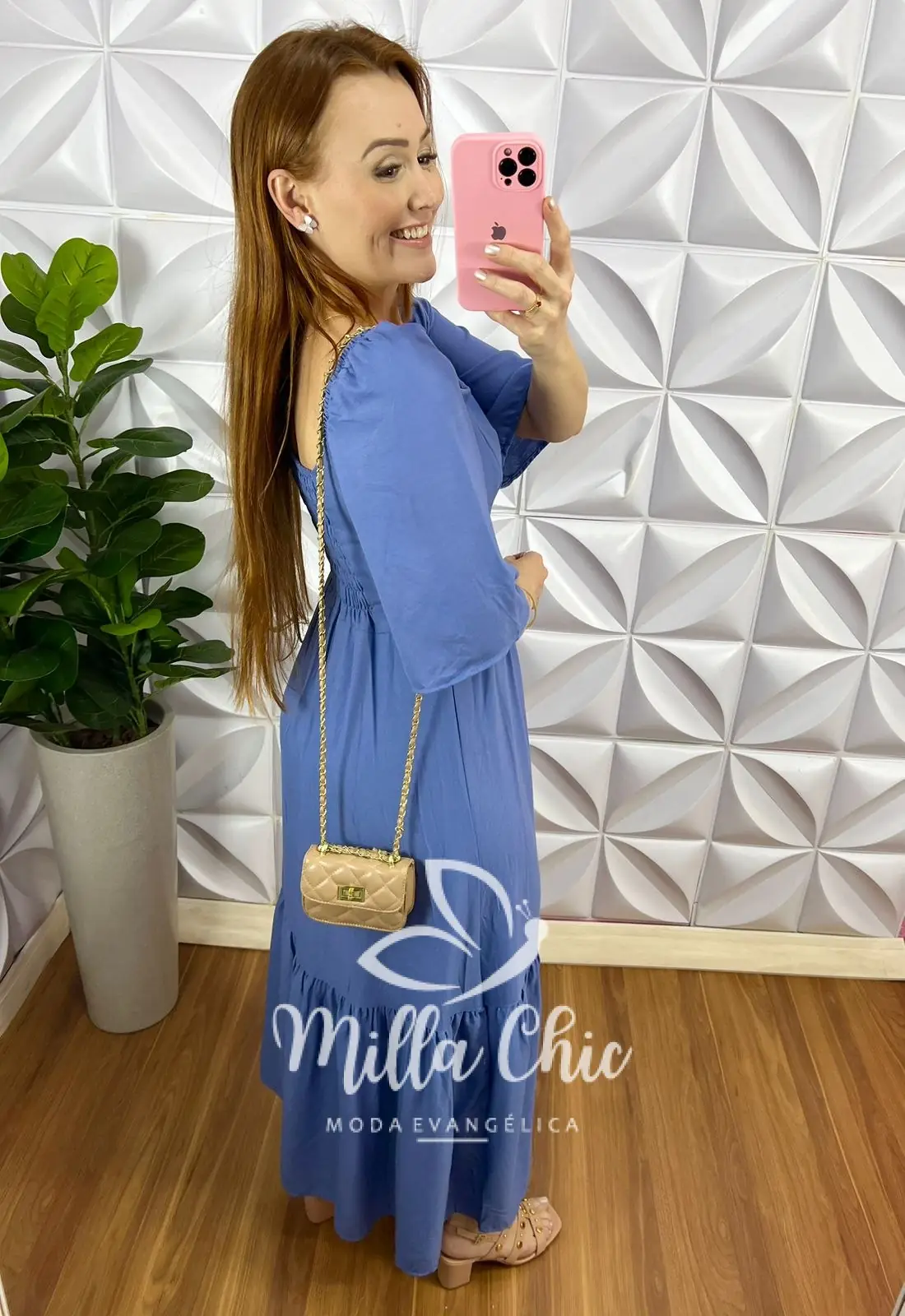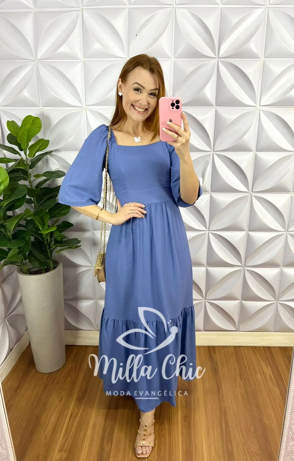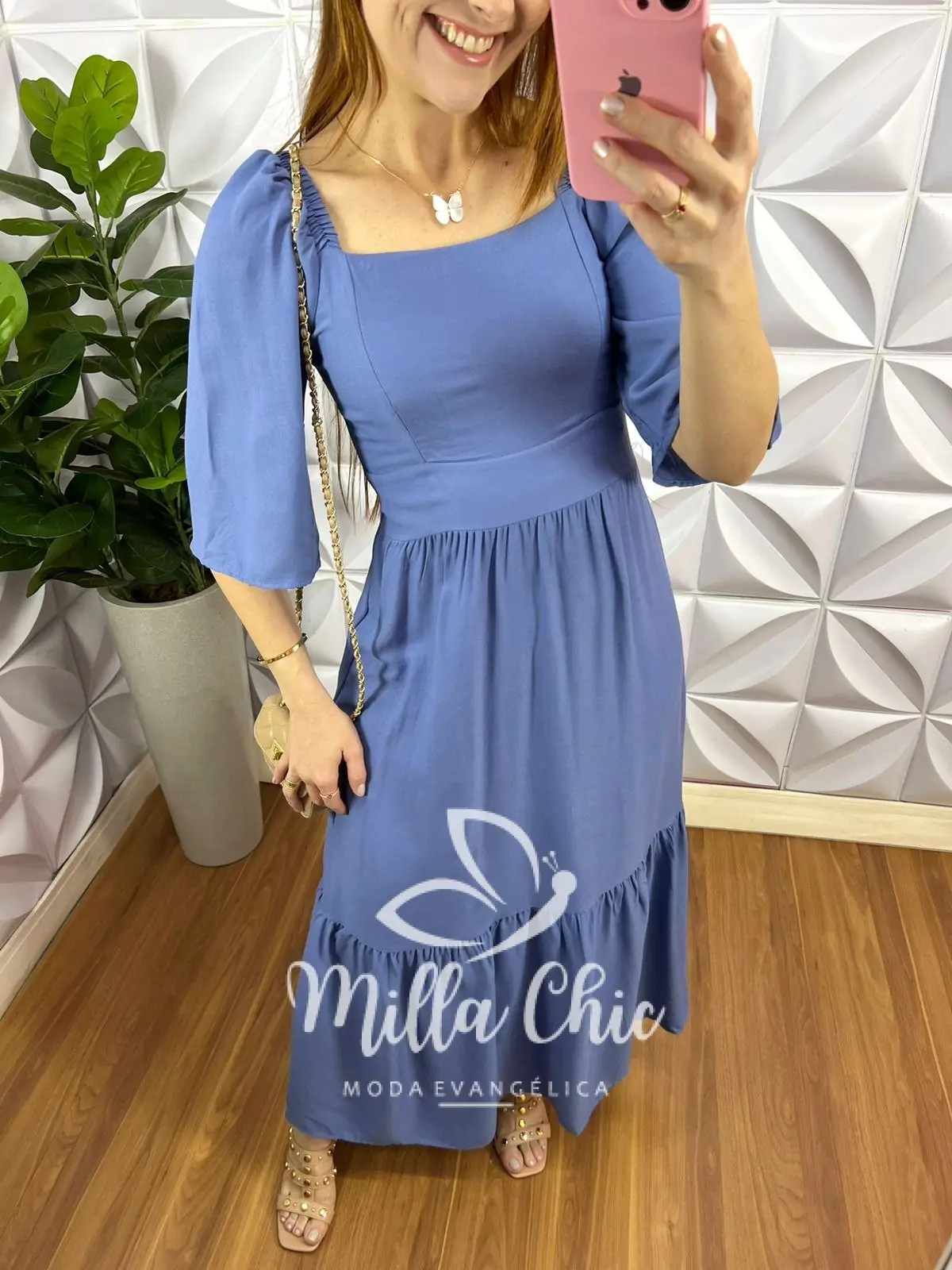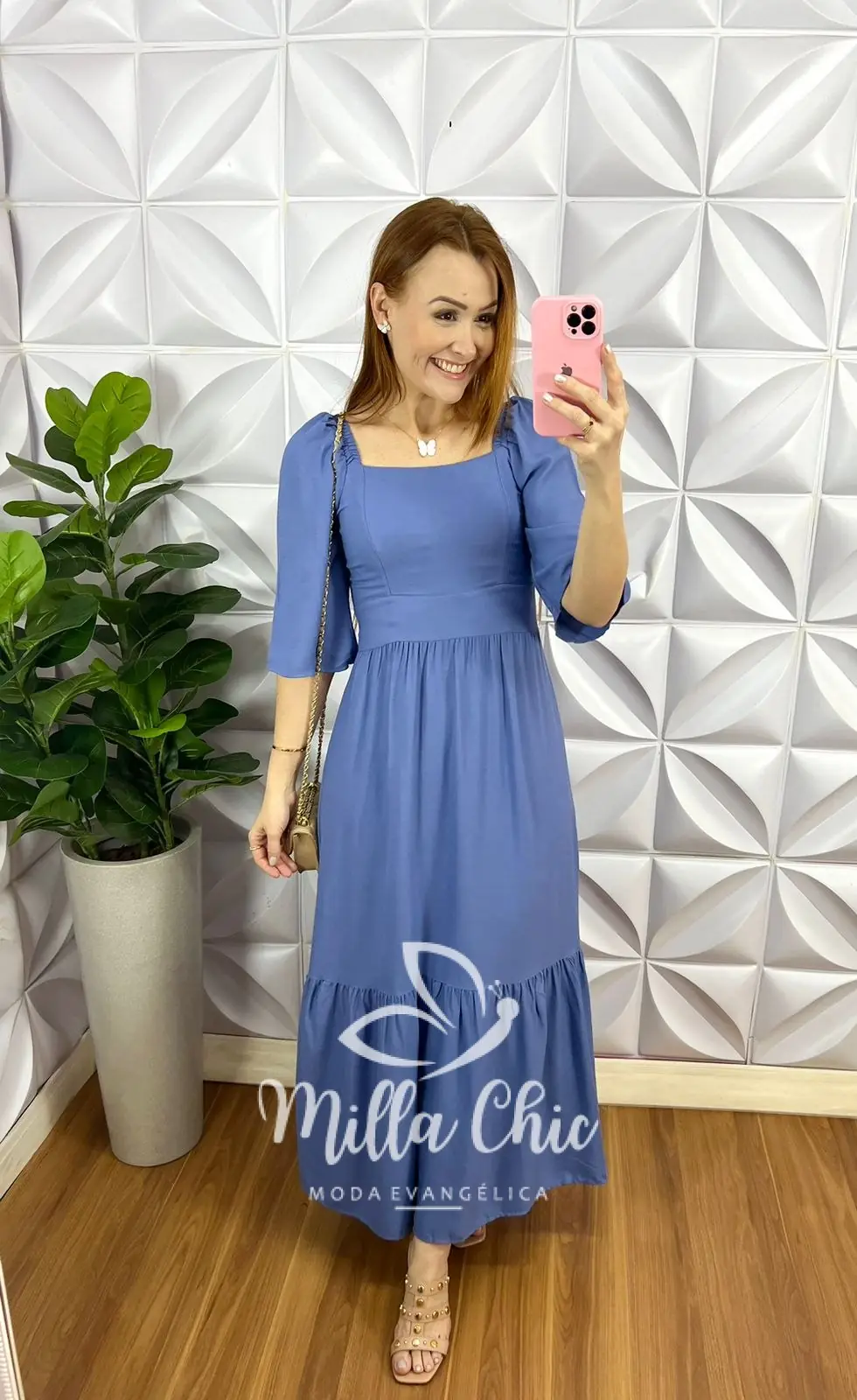 Possui: Decote quadrado, lastex nas costas, manga larguinha 3/4, comprimento mídi, caimento evasê, com uma maria na barra. Sem forro.