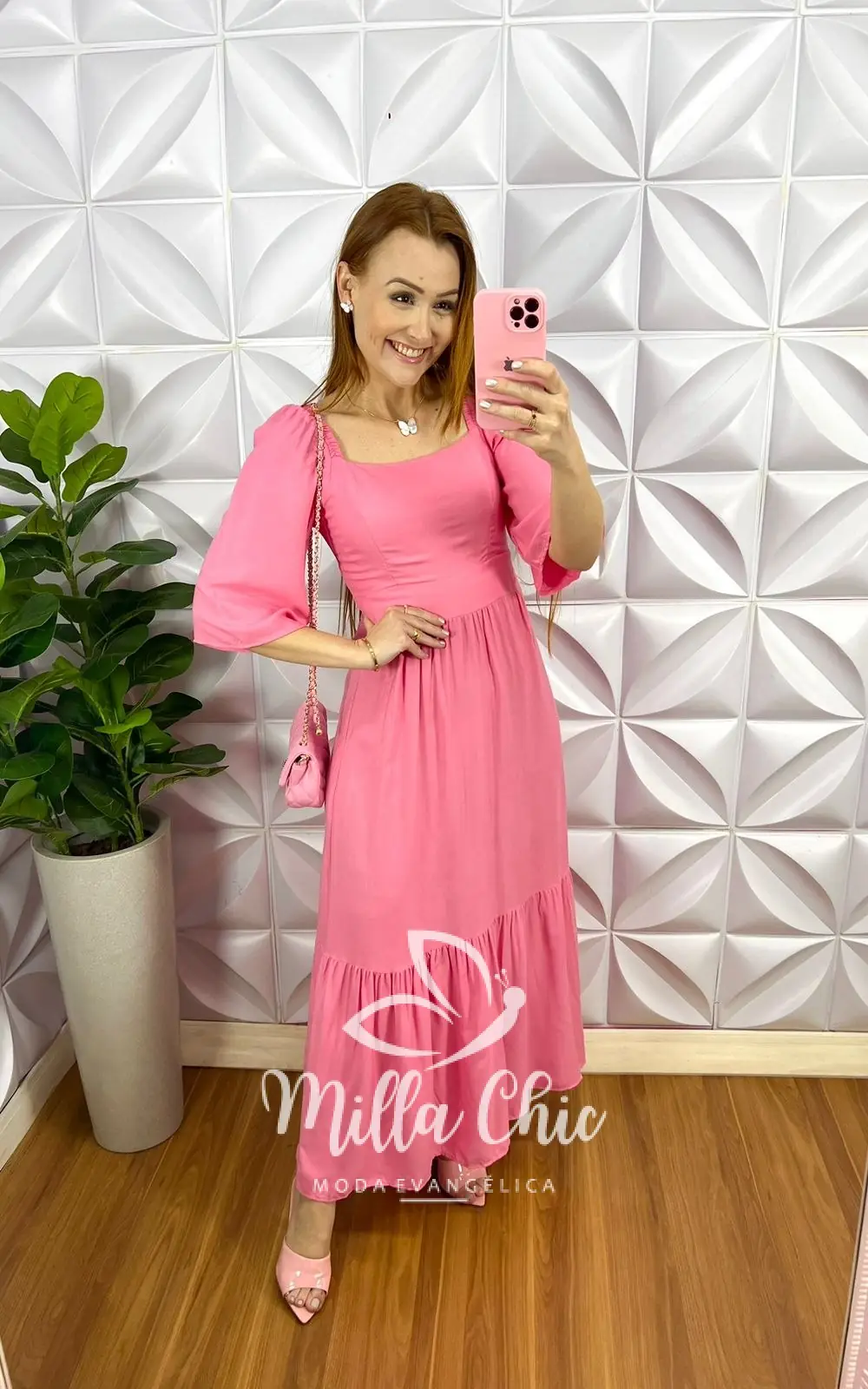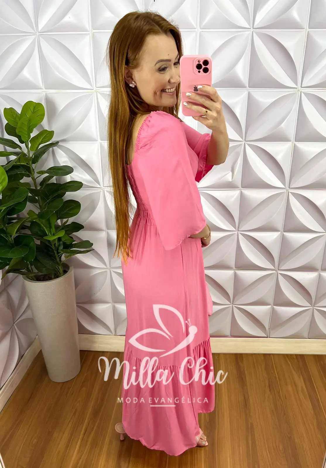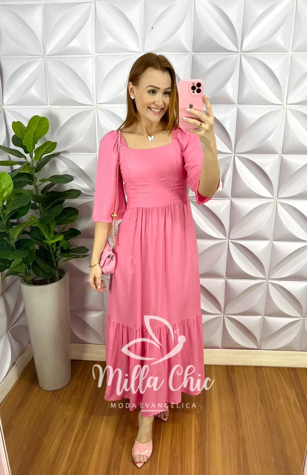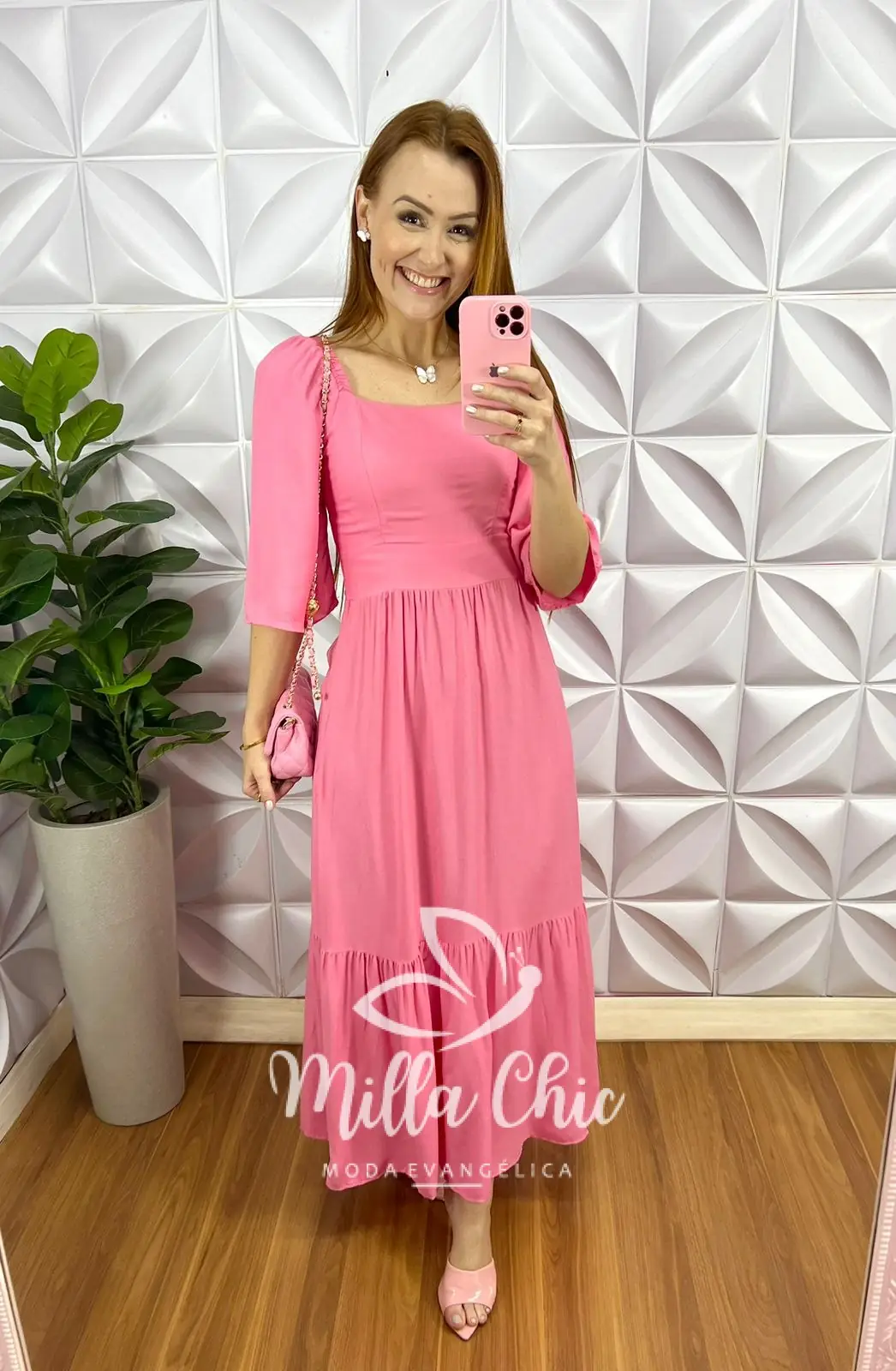 Vestido No Viscosarja Mídi Manga 3/4 Lastex Nas Costas Giovane - Rosa - Milla Chic