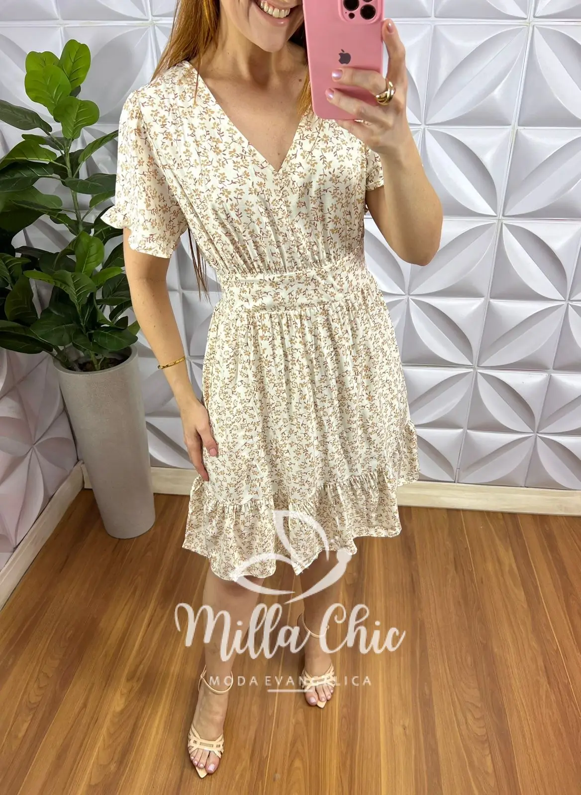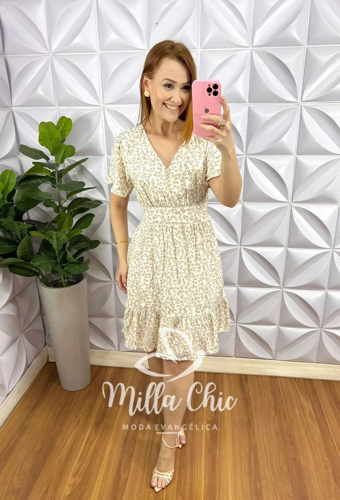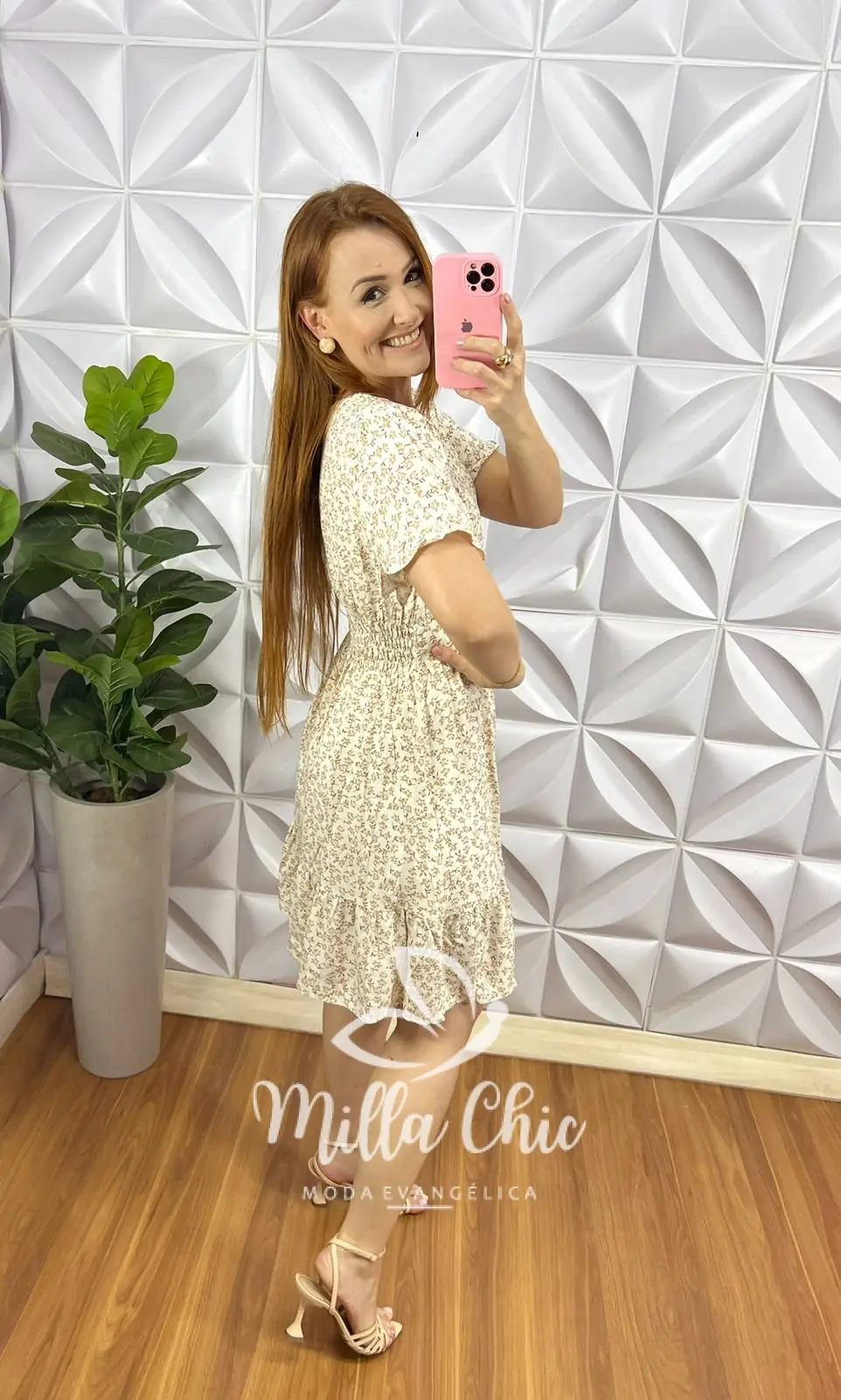 Vestido No Viscose Curto Manga Com Babadinho Estampado Fabia - Areia - Milla Chic